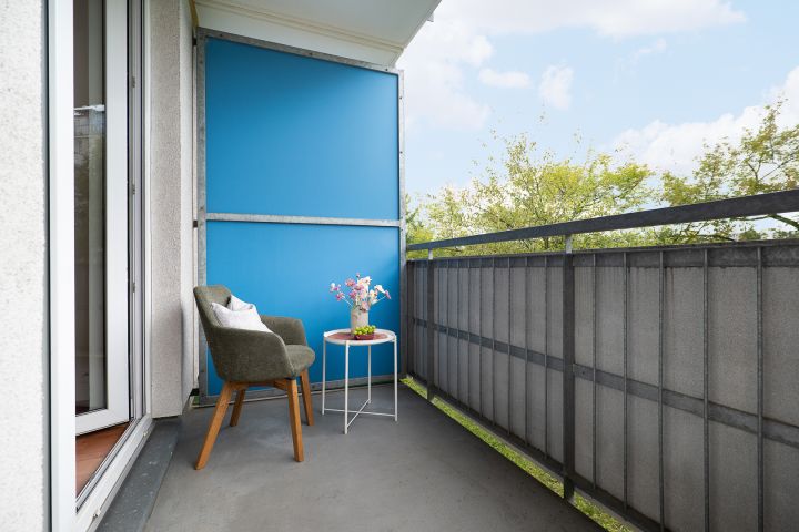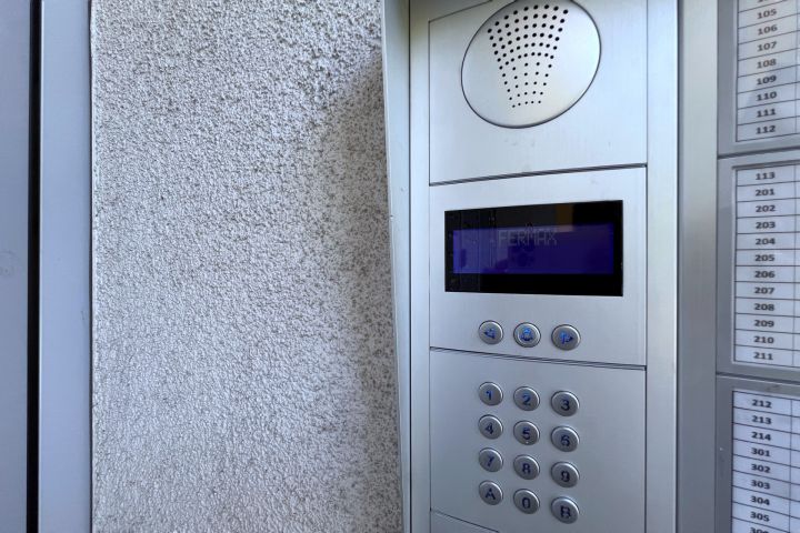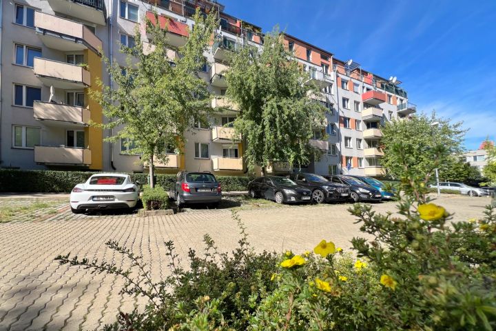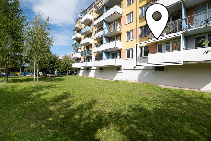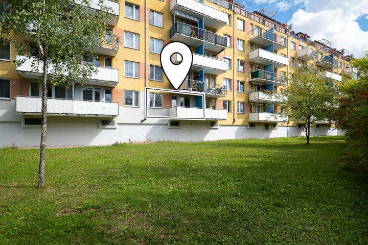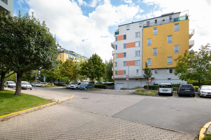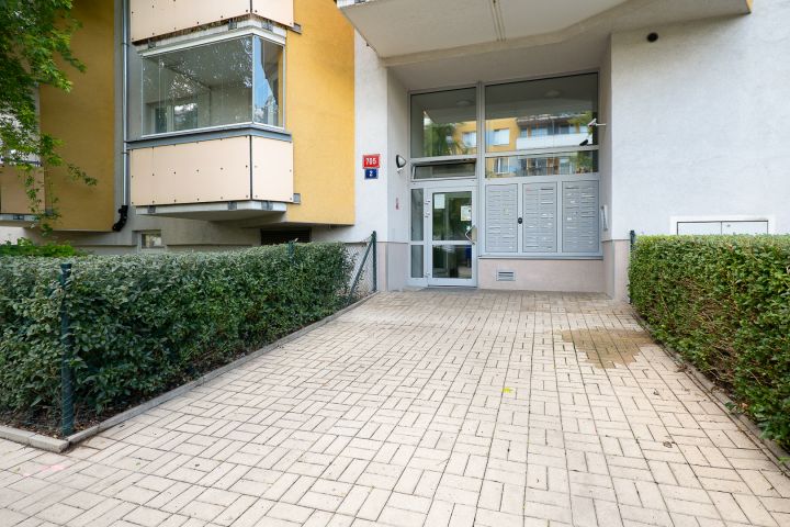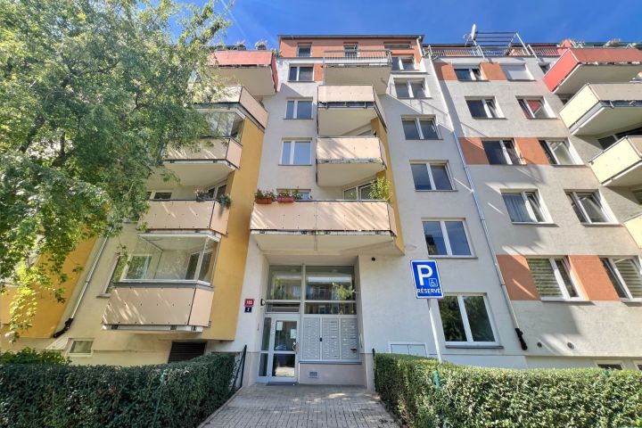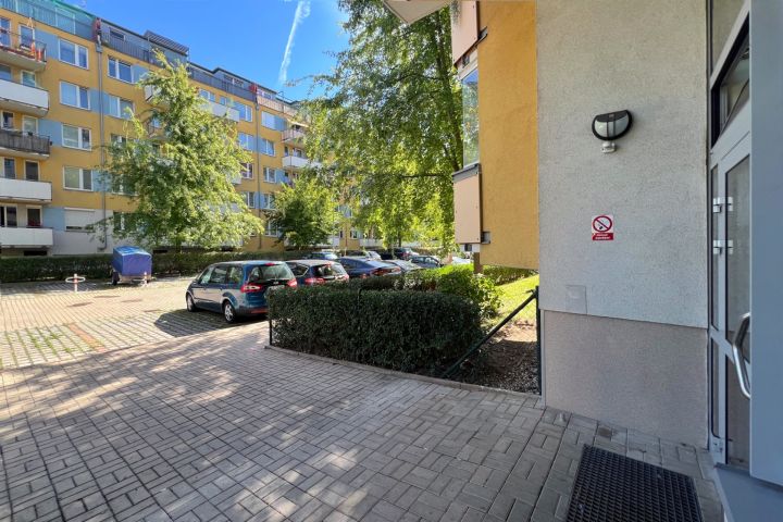 Byt se nachází v části domu, která je od hlavní chodby s výtahem oddělena samostatnými dveřmi na čip – přístup mají pouze vlastníci bytů z daného křídla. Obě místnosti a balkon jsou orientovány na západ a nabízejí výhled na zahradu se vzrostlou zelení. Za zahradou je rozlehlé placené parkoviště, což spolu se zahradou poskytuje značné odclonění od ruchu hlavní ulice – klid v bytě je tak prakticky zaručen. Uzamykatelná oplocená zahrada je určena výhradně vlastníkům bytů v domě.