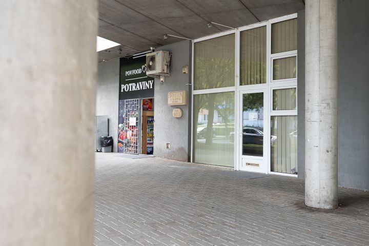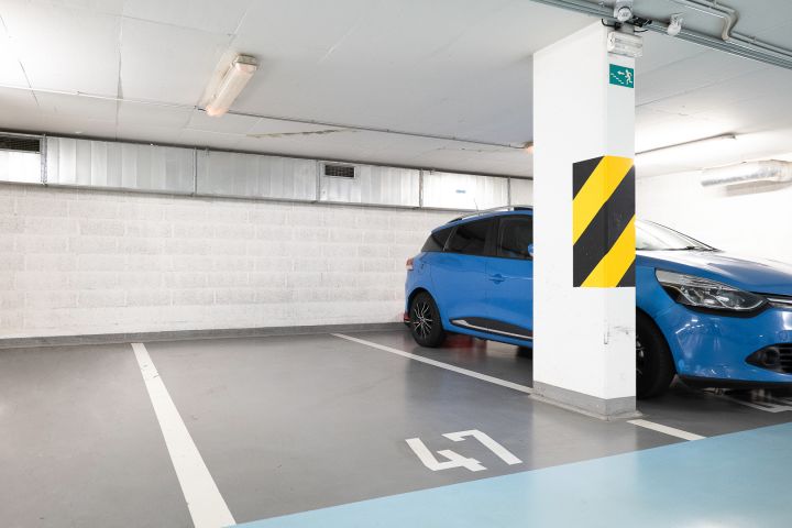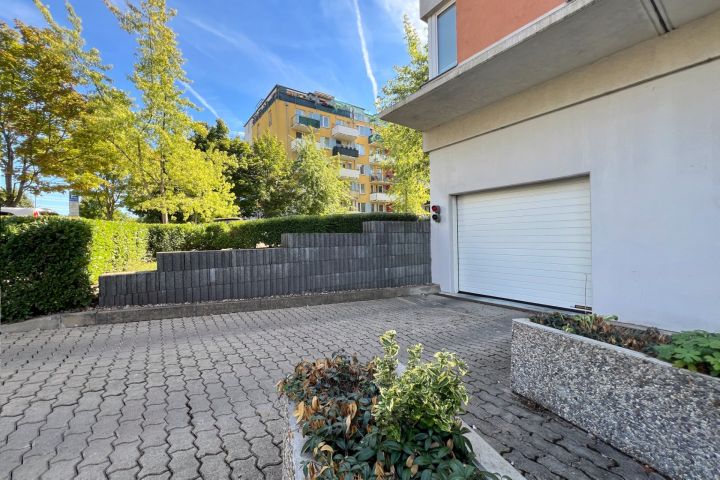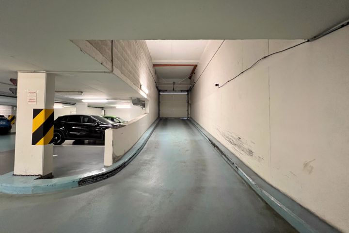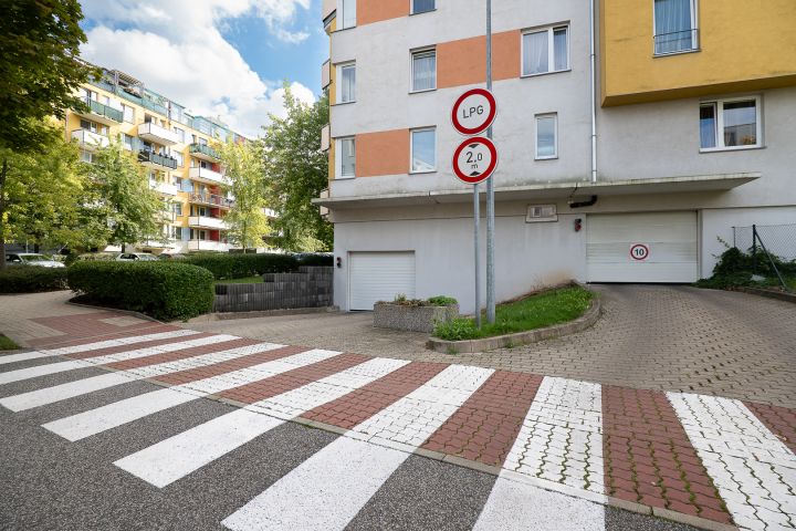 Součástí prodeje je garážové stání v suterénu domu. Vjezd i výjezd je pohodlný a mírný, vrata se otevírají na dálkové ovládání. Výjezd je na boku domu do ulice Terezínská.