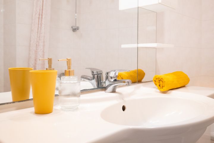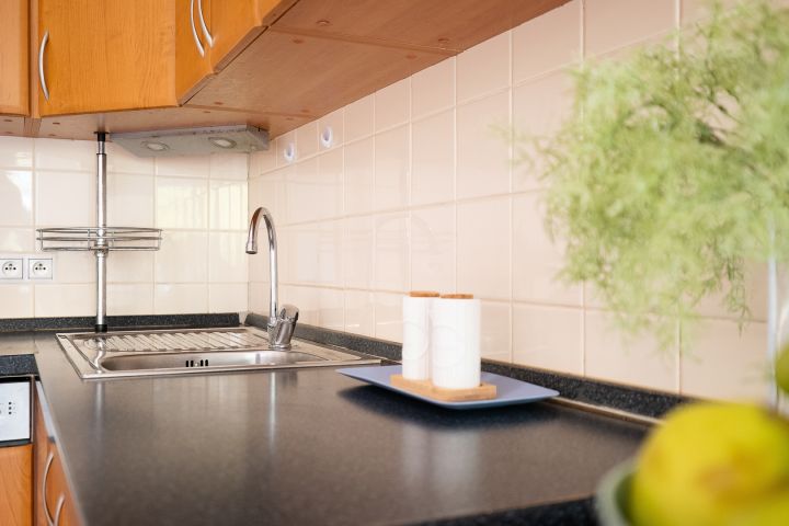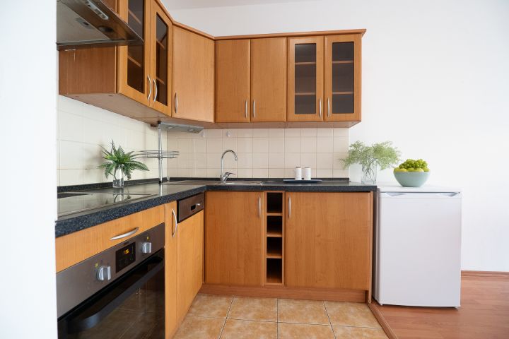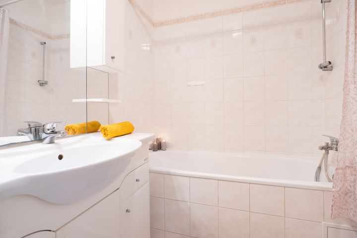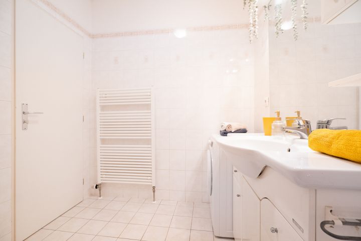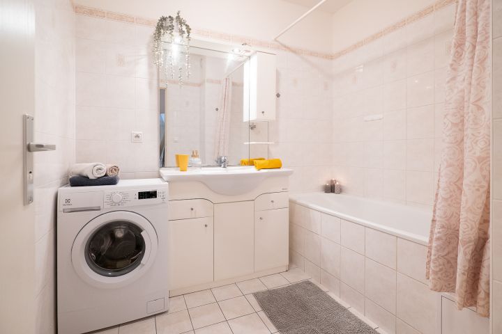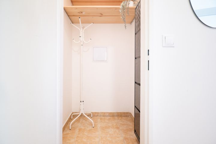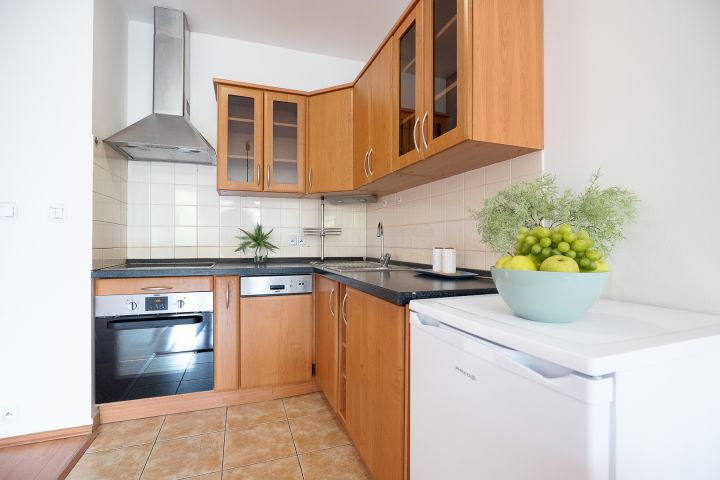 V bytě zůstává původní kuchyňská linka se spotřebiči: digestoř s odtahem do komína, horkovzdušná trouba, sklokeramická varná deska, užší myčka a vestavěná menší lednice. K dispozici je také zcela nová volně stojící lednice (možno přikoupit za 3 980 Kč). V ložnici najdete vestavěnou rohovou skříň, na WC úložnou skříňku a v koupelně koupelnový nábytek spolu s topným žebříkem. Pračka není součástí prodeje, ale přípojka je připravena v koupelně.