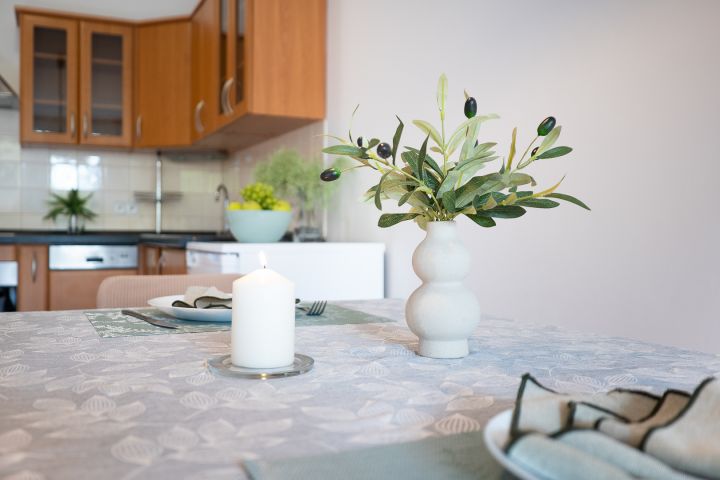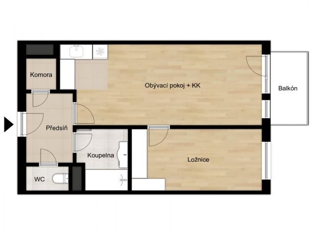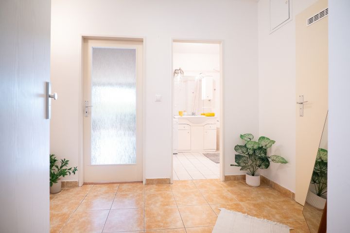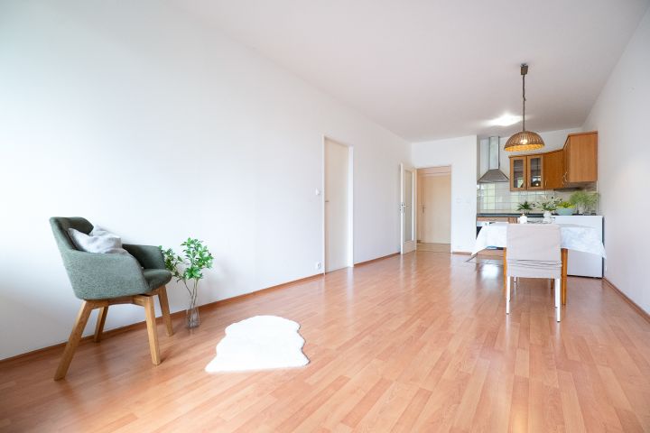 Bytová jednotka je v podobě, v jaké byla zkolaudována v srpnu 2005 – bez zásahů či modernizací. Poskytuje prostorný dojem, zejména díky komoře v bytě a možnosti využít prostor na WC či v koupelně pro vestavěné úložné systémy. Obývací pokoj spojený s kuchyňským koutem má výměru 24,94 m² a umožňuje variabilní uspořádání nábytku dle potřeb.