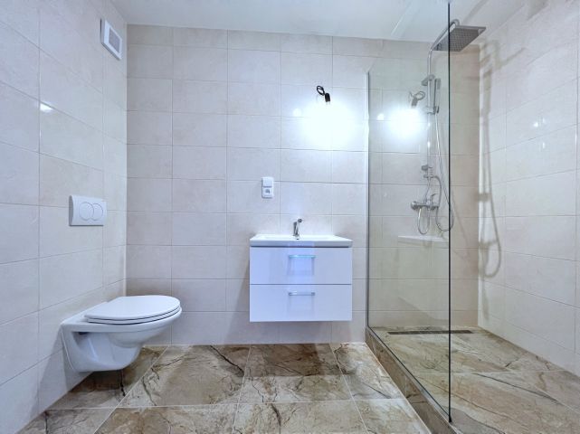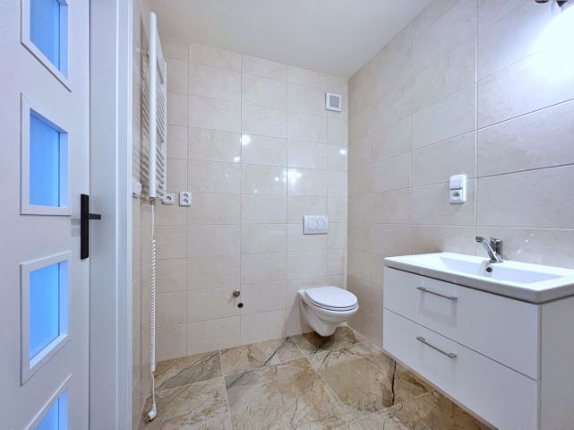 Koupelna: Osazena závěsným WC Geberit, instalován sprchový kout (SIKO).