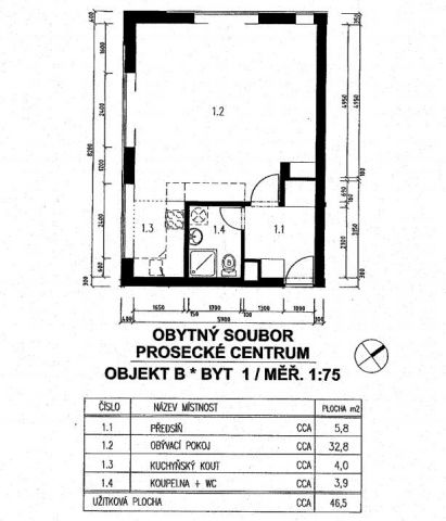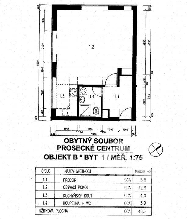 Vstupní chodba, koupelna s WC, pokoj a kuchyňský kout.