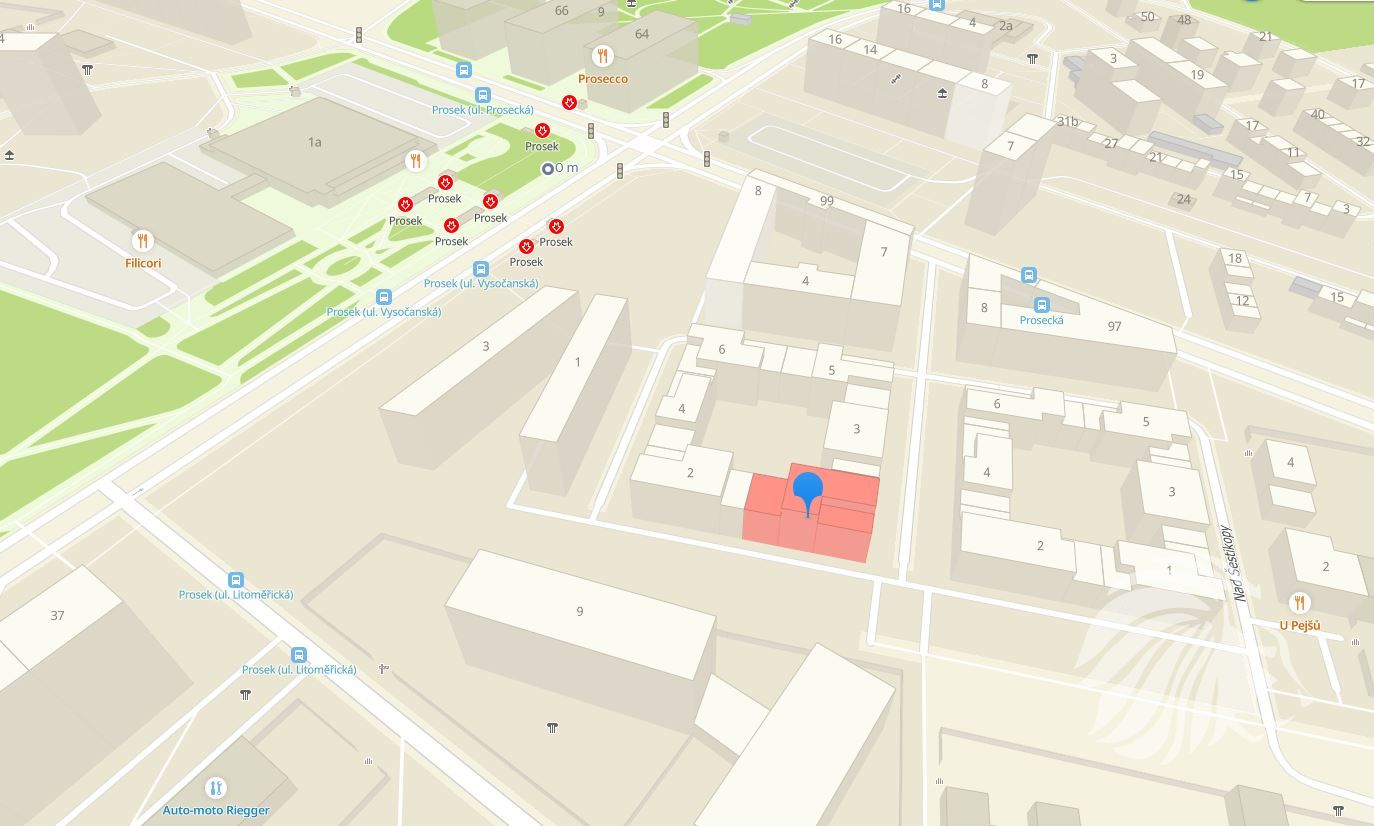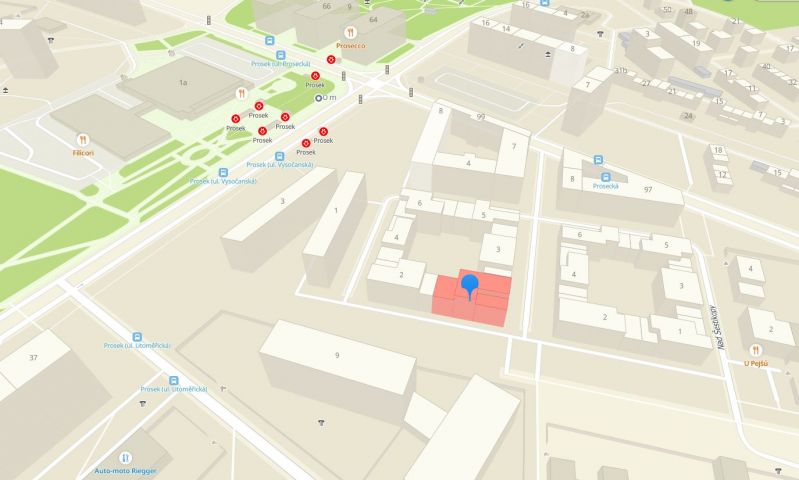 Příjemný klid díky terénu a násepu rozdělujícího bytovou výstavbu a komunikaci. Bus zastávka a metro C Prosek 1 min. chůze (200 m). Do centra metrem 15 minut. Přímo na stanici metra nákupní centrum (potraviny, drogerie, elektronika, služby, fastfood,) event. další parkování. Dětské hřiště a opět mnoho zeleně Parku Přátelství. Nedaleko pošta a park Podviní. OC Letňany busem 7 minut, OC Fénix 4 min.