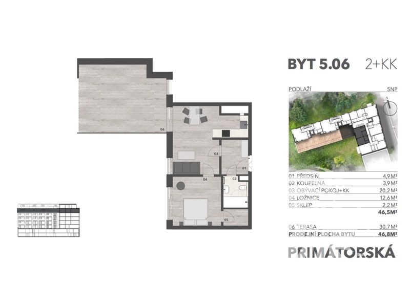 Dovolujeme si vám nabídnout byt 2+kk s terasou v novostavbě projektu Bytového domu Primátorská. Byt se nachází v 5. nadzemním podlaží 7 podlažního domu. Garážové stání je v ceně bytu. V bytové jednotce je šatna o výměře 2,2 m². Sklep není součástí. Předání v roce 2018.