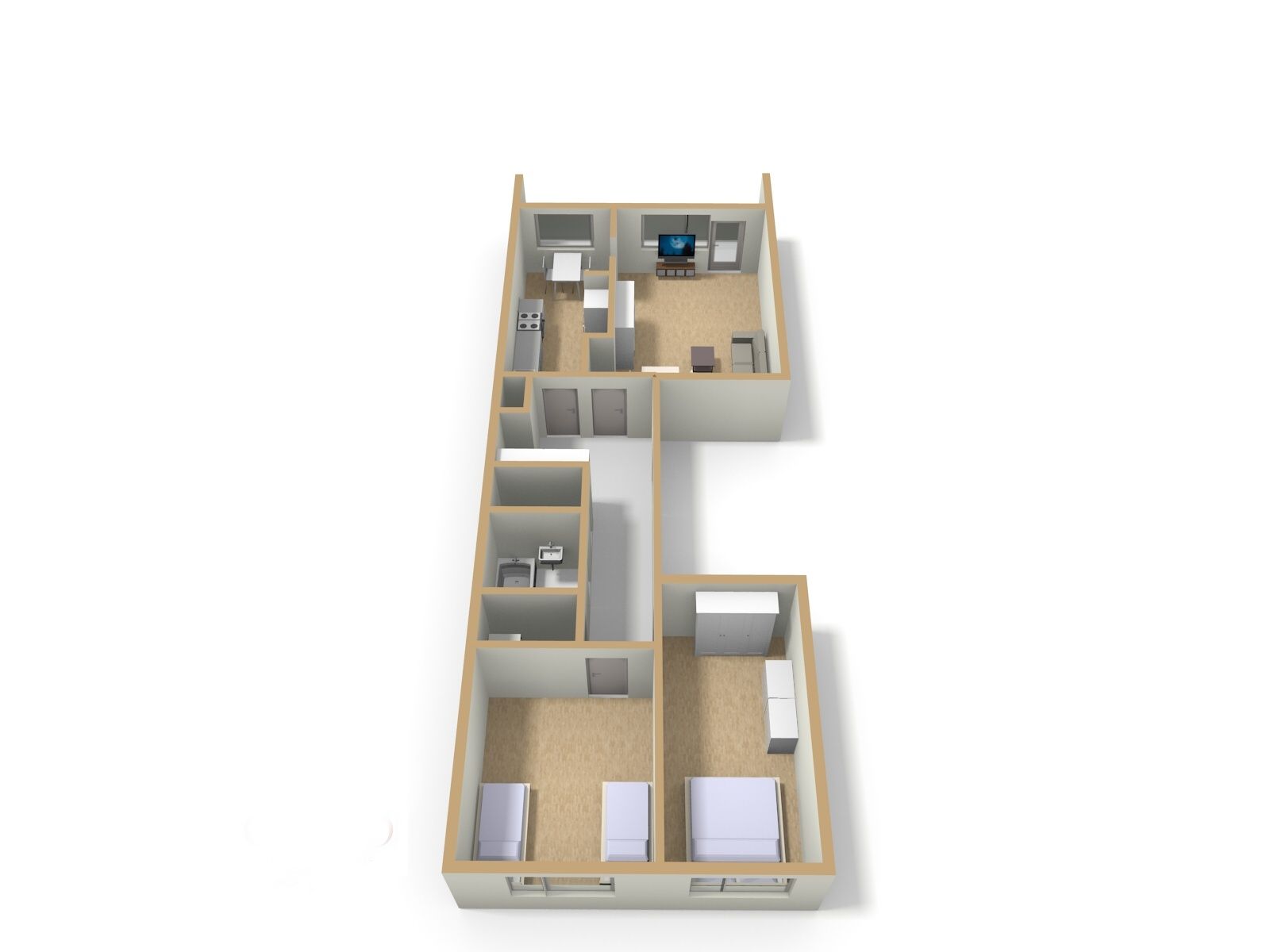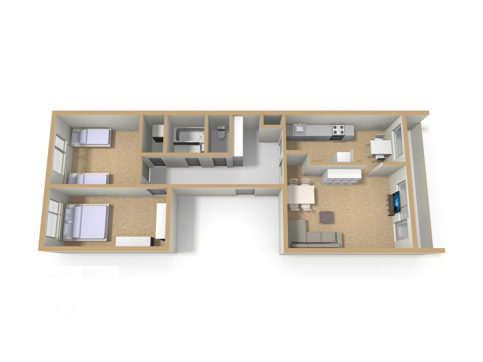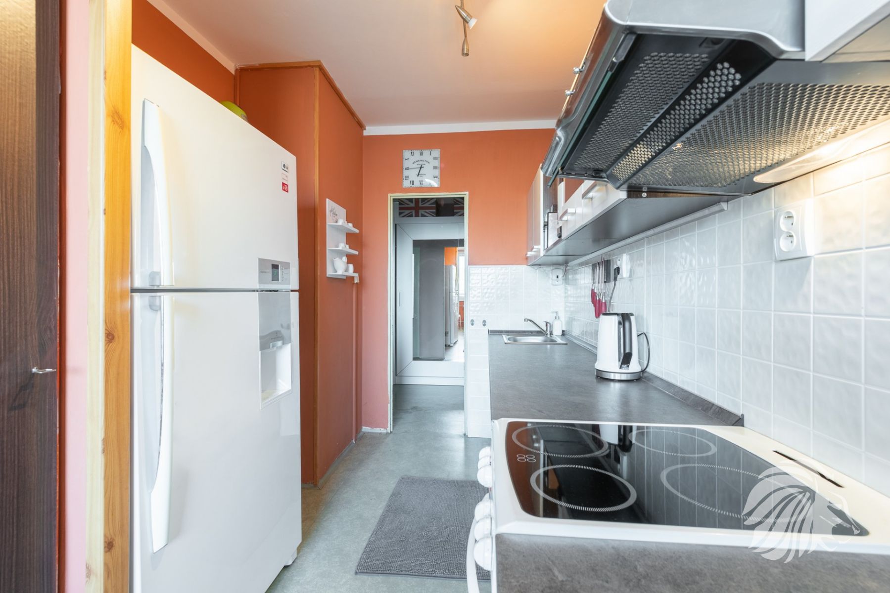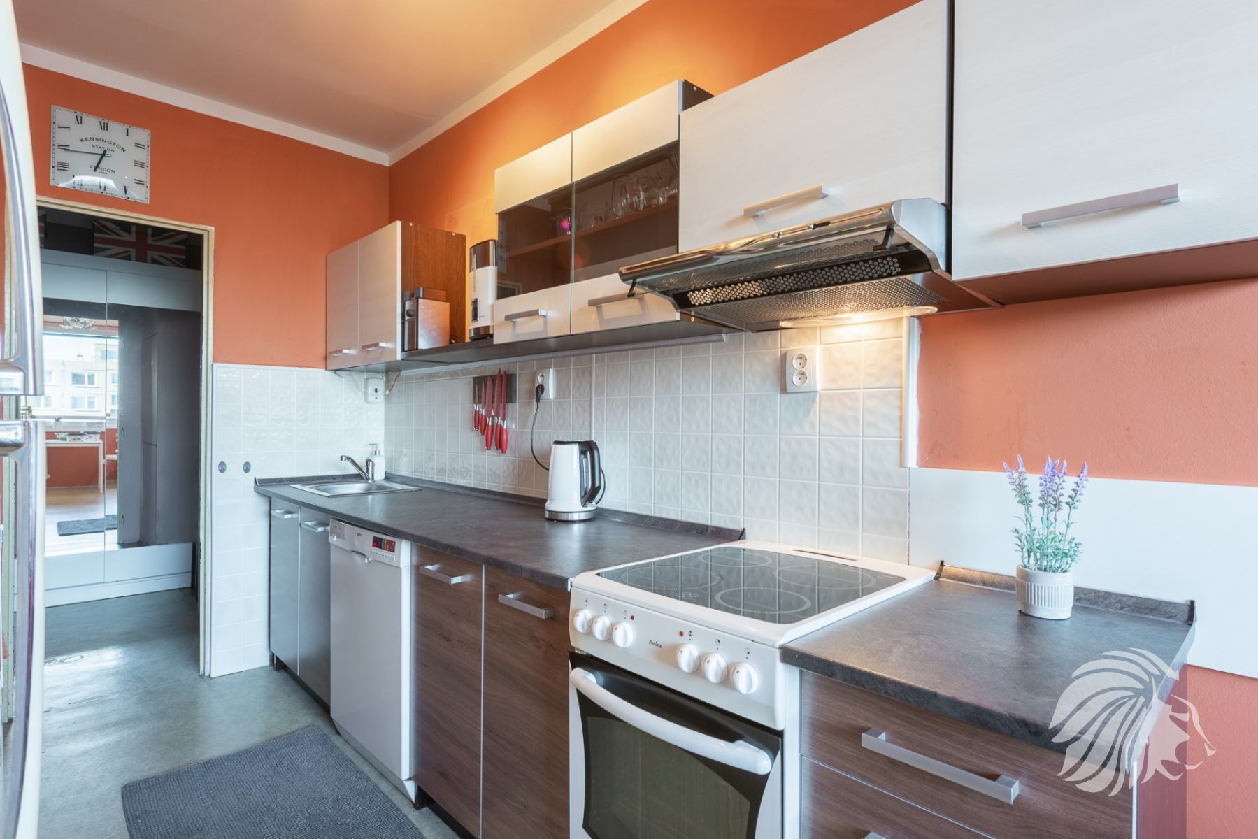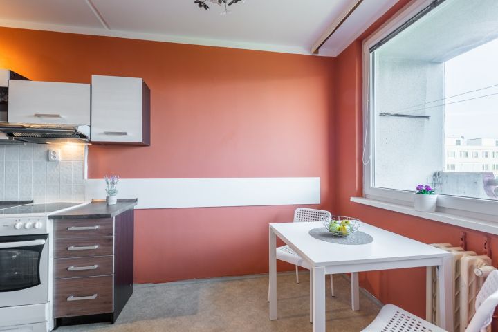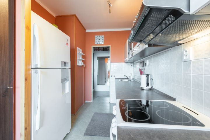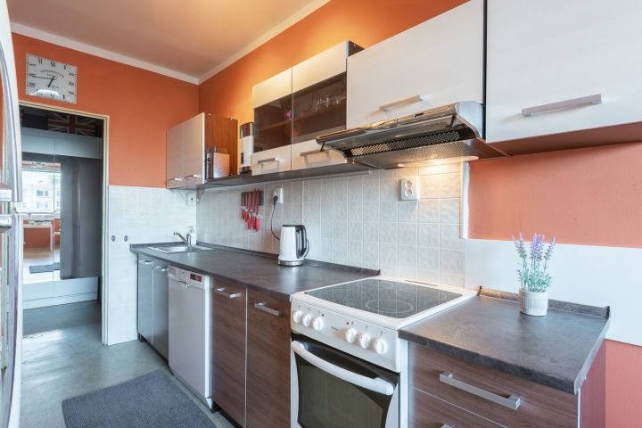 V kuchyni elektrická trouba, sklo-keramická varná deska, myčka Bosch 60 cm. Kuchyňská linka v záruce. Digestoř – vložka. Podlahy původní PVC, koupelna a WC dlažba. V bytě může být ponechán nábytek dle dohody.