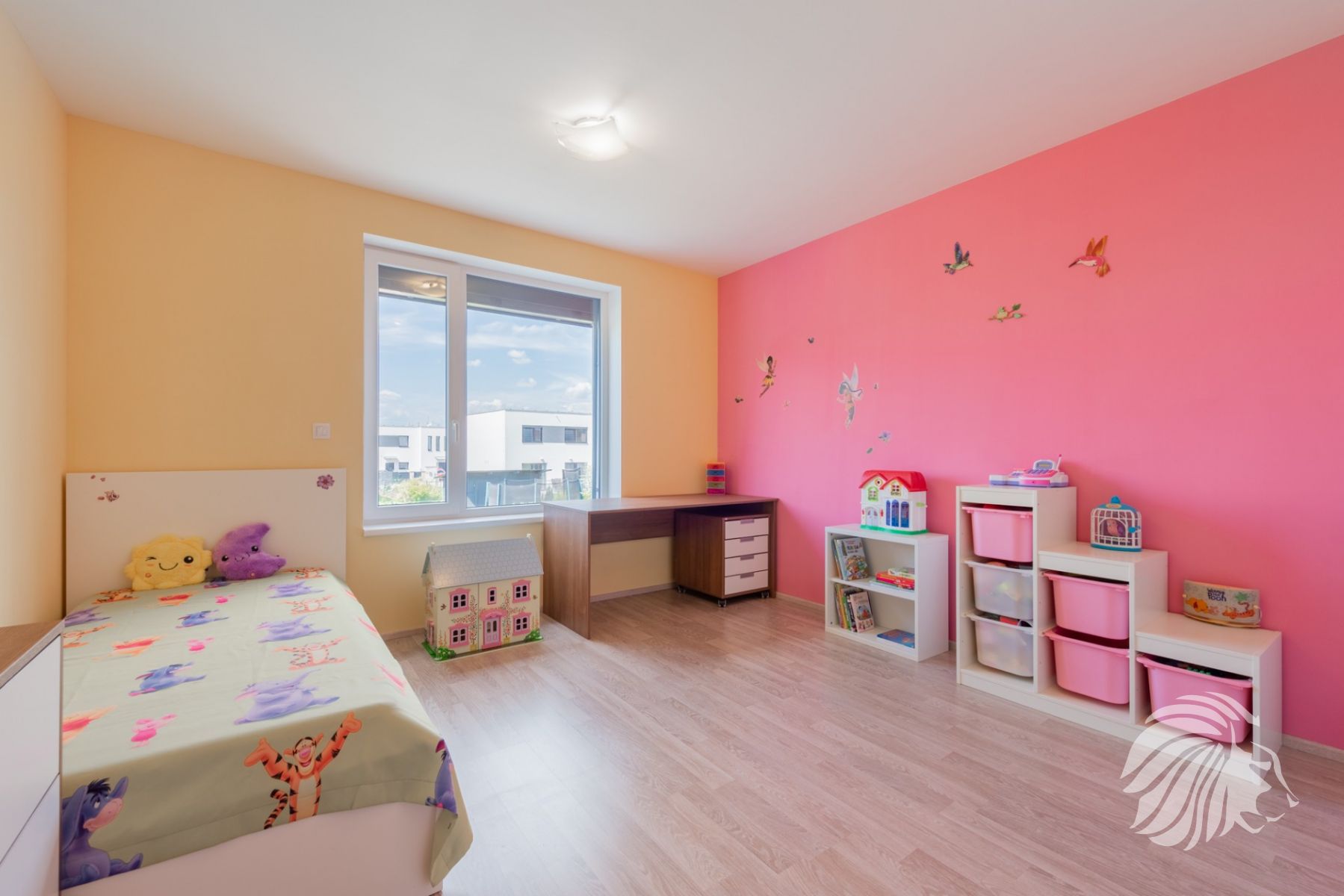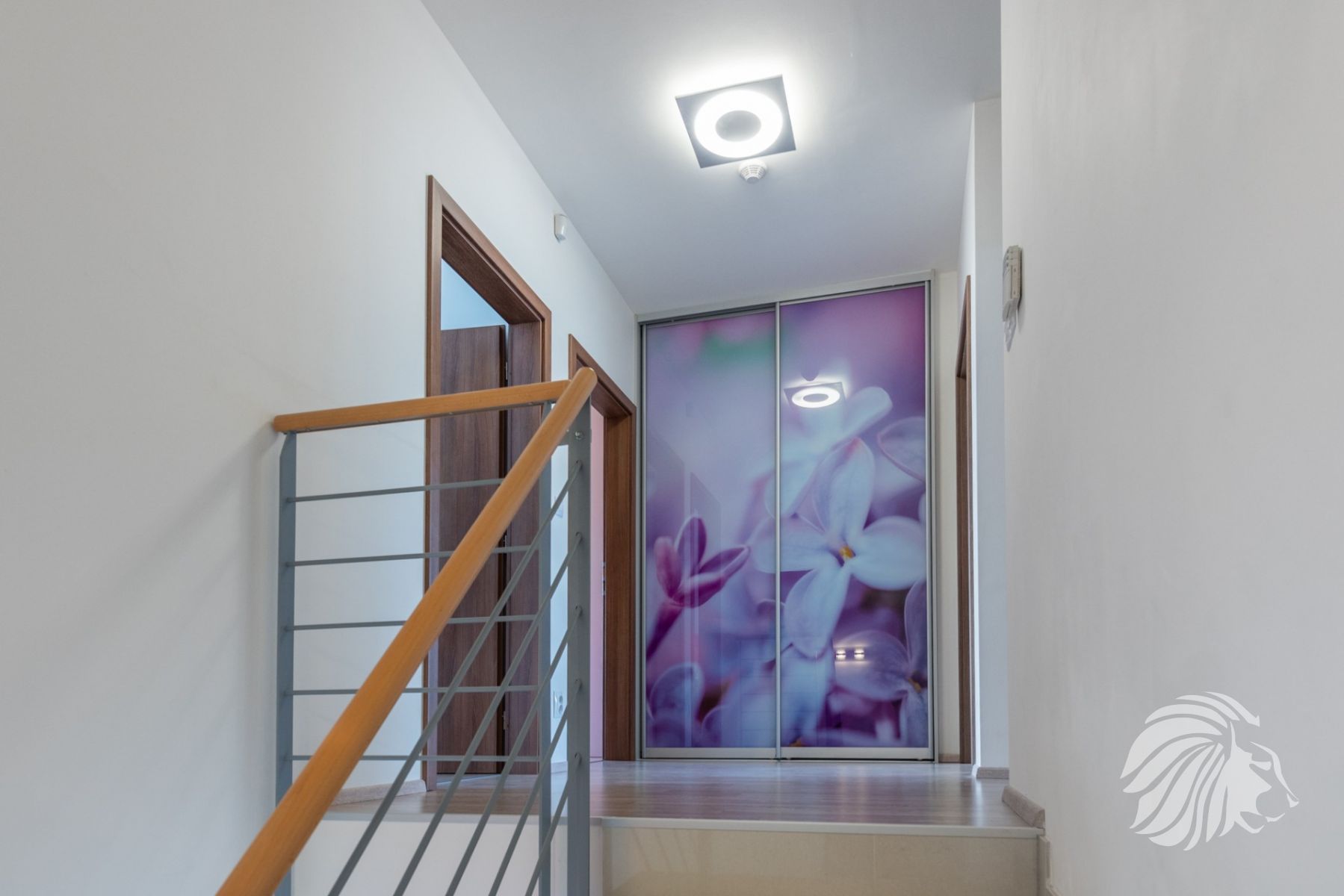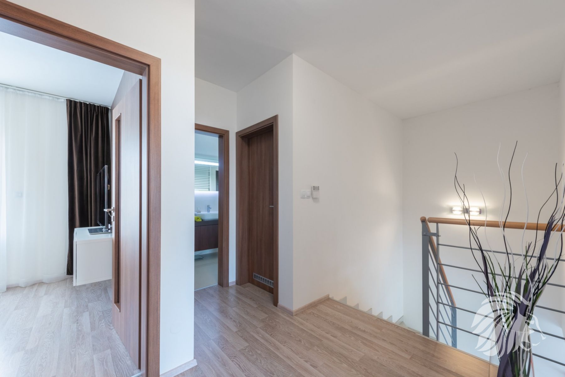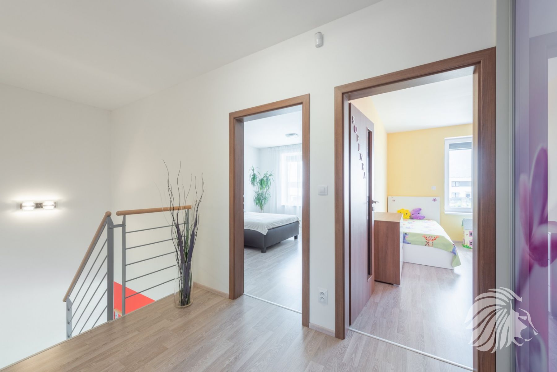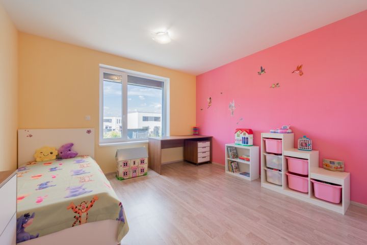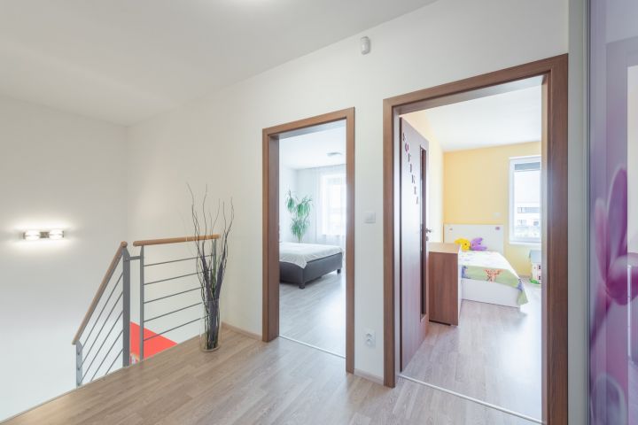 orientována do přední části domu, s vlastní prostornou šatnou. 2 pokoje čtvercové místnosti orientované do zahrady. Toaleta samostatná s umyvadlem, otopný elektrický žebřík. WC je umístěné vedle koupelny.