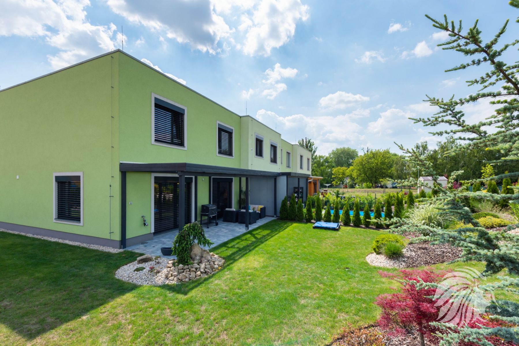 Trávník je opatřen samozavlažovacím systém.Ústřední podlahové vytápění, kondenzační kotel se zásobníkem teplé vody. Zámková dlažba a kačírek kolem domu v přední i zadní části. Střecha pochozí, pokrytá fólií a vysypaná oblázky. Elektrické předokenní žaluzie na ruční ovládání. Plot z betonové podezdívky – KB bloky a pojezdová brána – eloxovaný hliník. Terasa s osvětlením z lepených tvarově stálých hranolů, výplň – čirý 5 mm polykarbonát. Alarm napojený na PCO.
