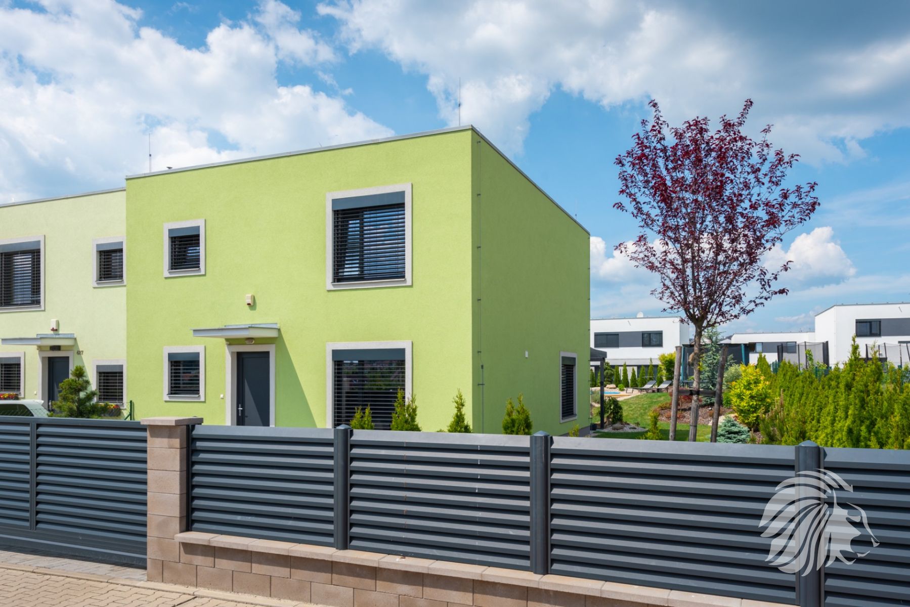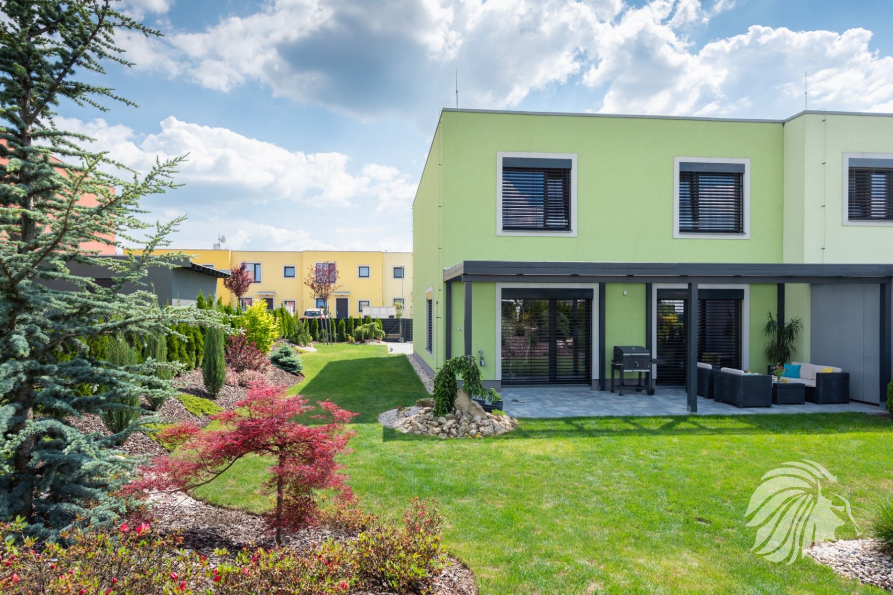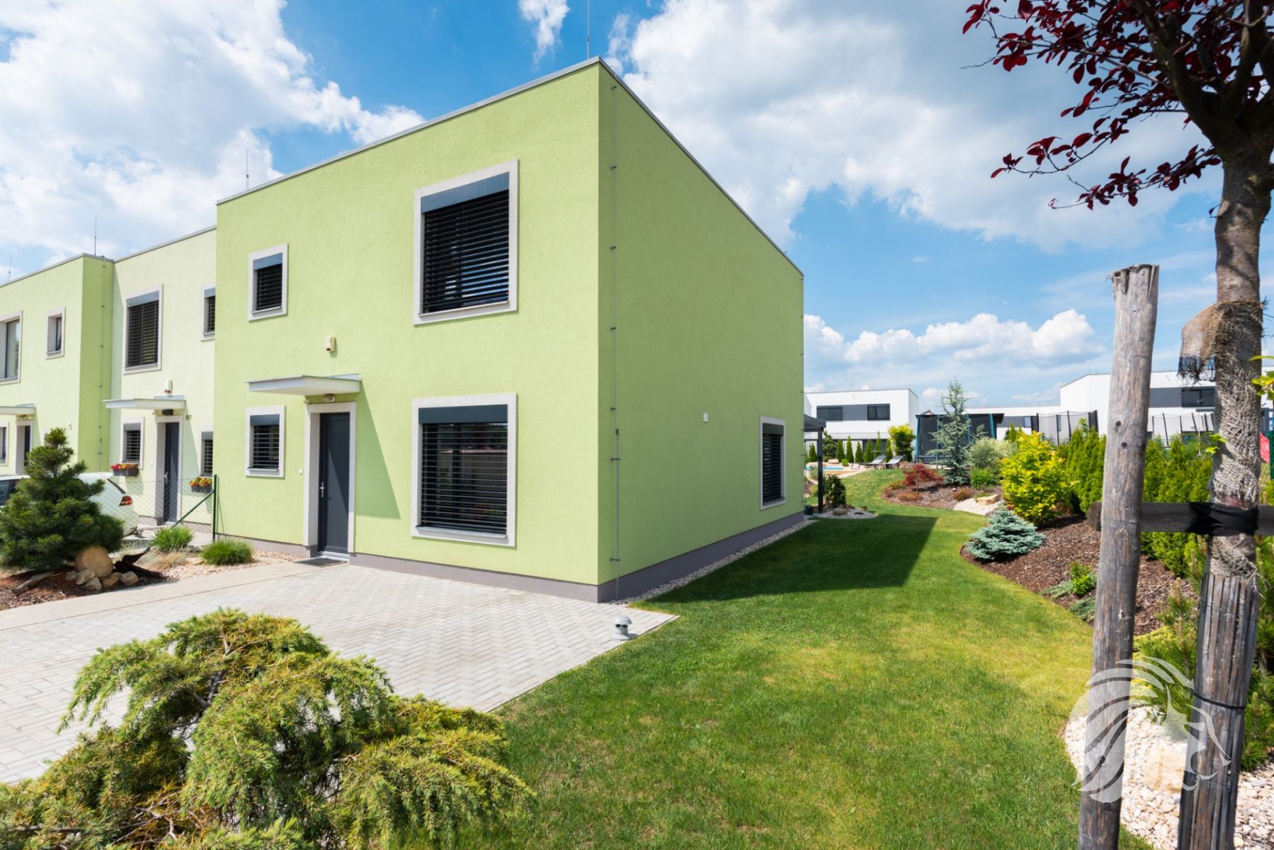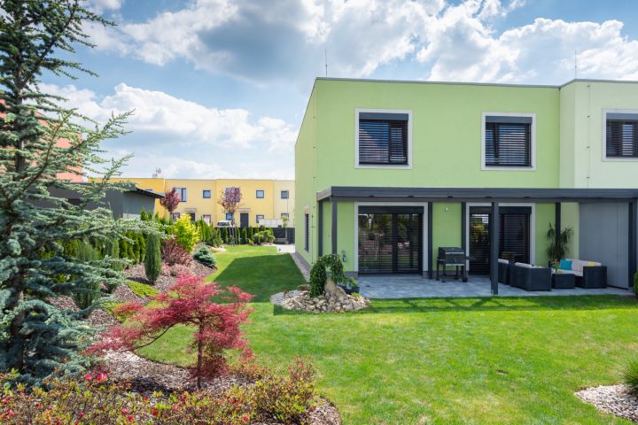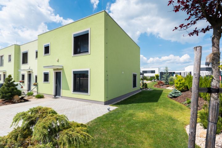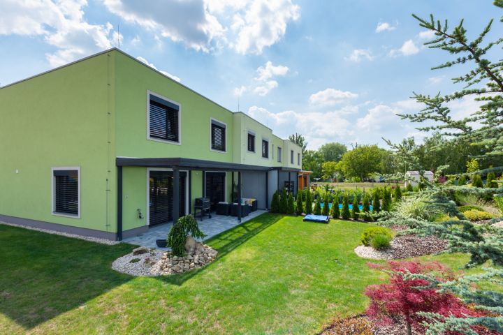dům je okrajový, součástí čtyř-bloku, od sousedního domu je oddělen vzduchovou dutinou, která zaručuje dokonalé odhlučnění. Orientace oken přední část domu na JV, zadní část se vstupem na zahradu na SZ. Zahrada a pohled do zeleně je zvětšen díky návaznosti na vedlejší zahrady a protější pozemek. Oba protilehlé pozemky dělí praktický veřejný průchod cca 1 m široký, kudy lze brankami vyvážet zahradní odpad.