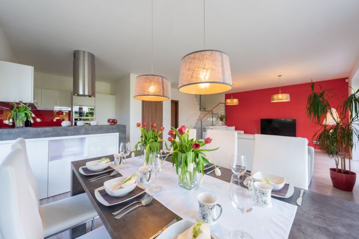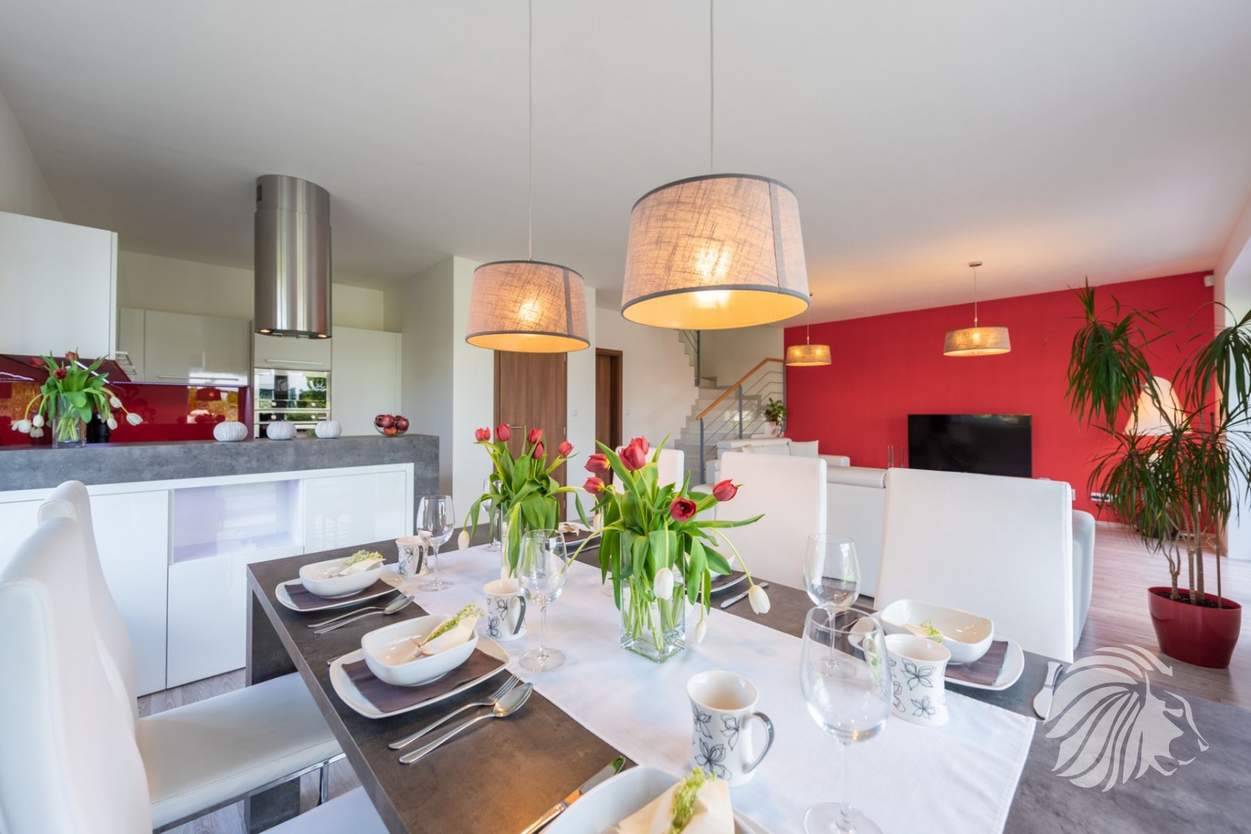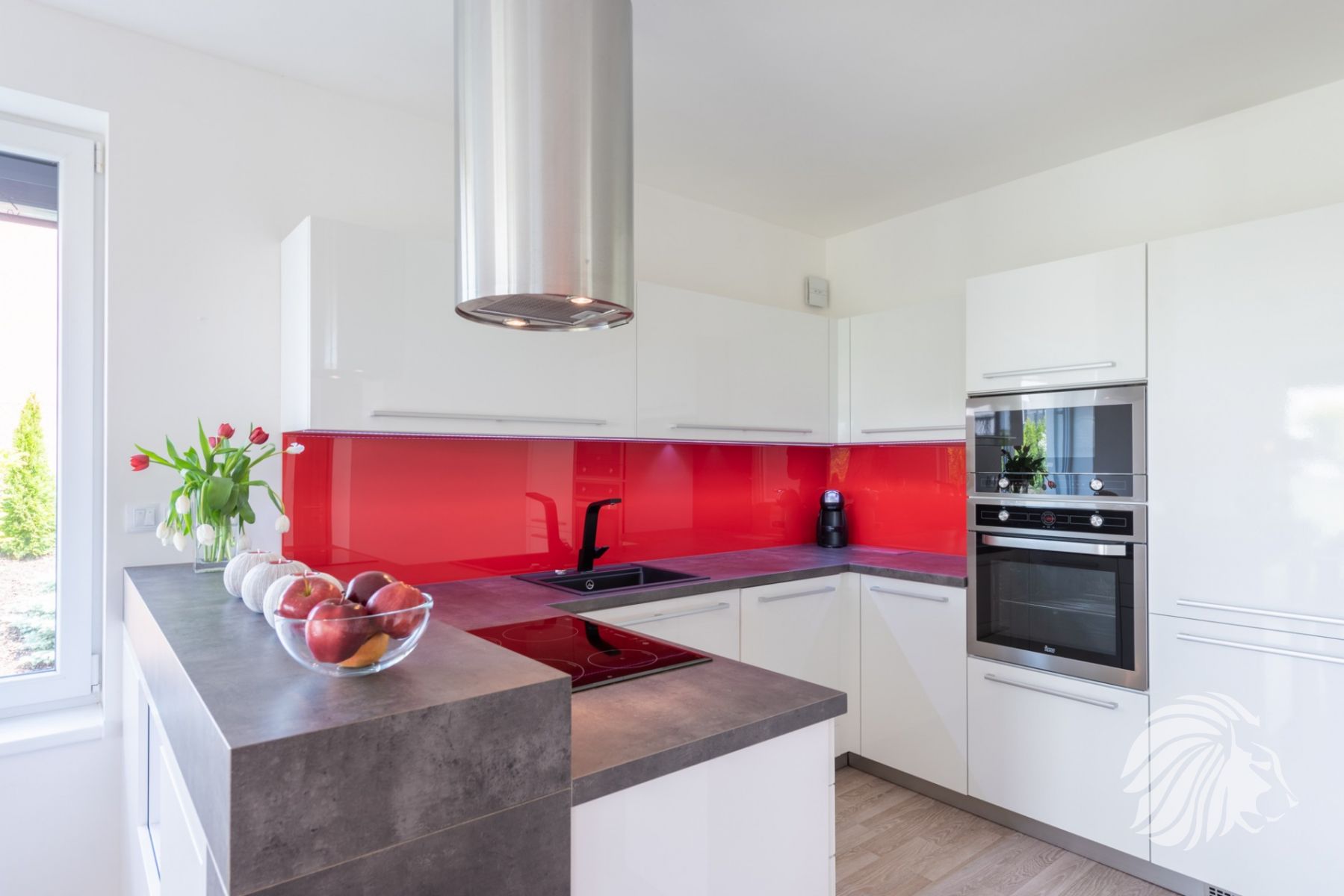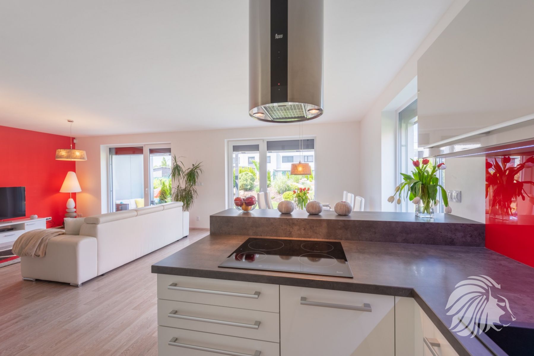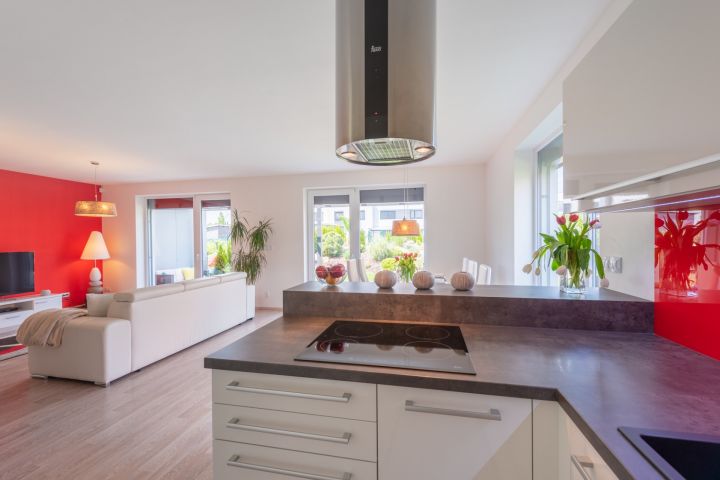 kuchyňská linka bílý lak nejvyšší kvality, skleněná obkladová deska. Granitový dřez i baterie, indukce, zabudovaná mikrovlnná trouba, a pečící trouba, digestoř s uhlíkovým filtrem, myčka 60 cm zabudovaná lednice s mrazákem. Obývací pokoj je interaktivně spojen s kuchyní. Jídelní stůl je výborně propojený s výhledem do zeleně.