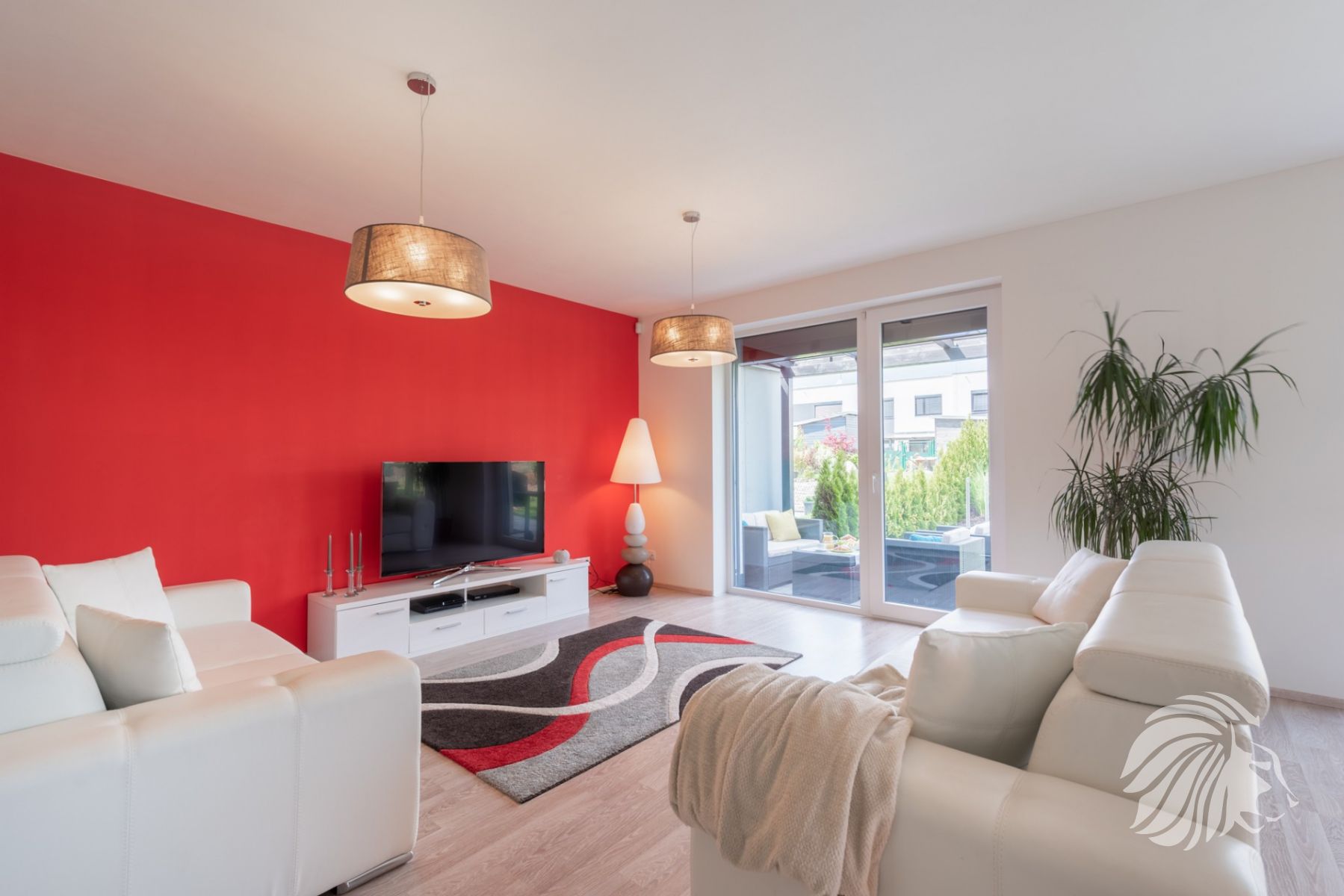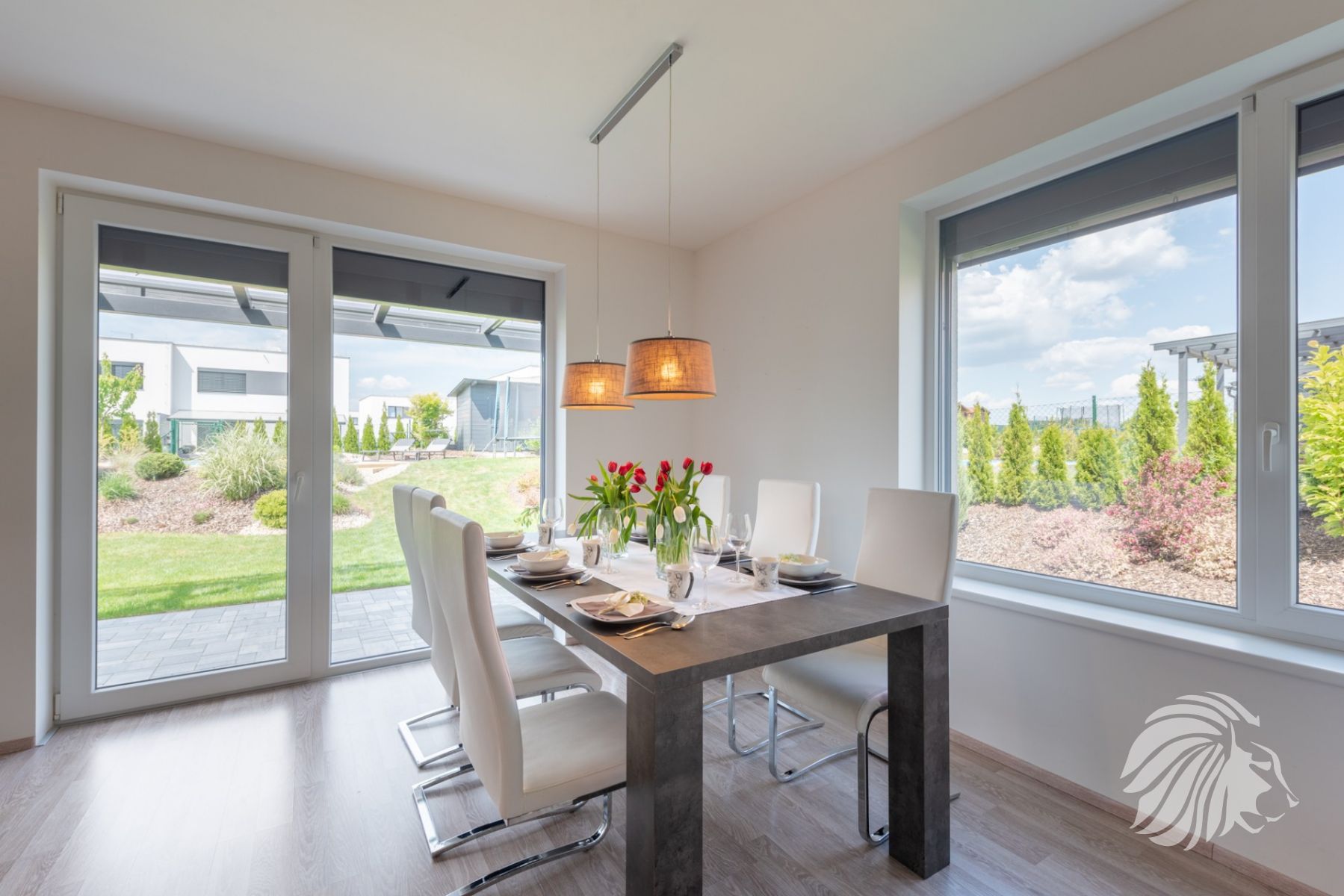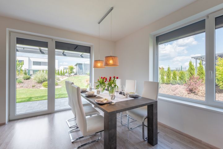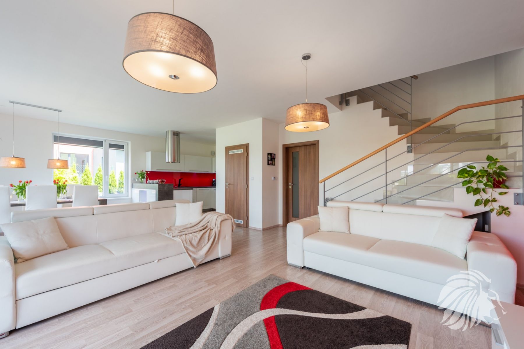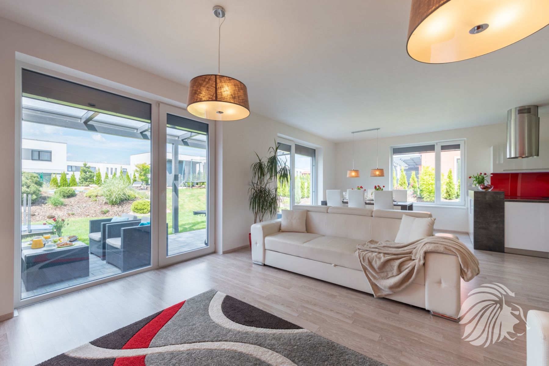 kuchyňská linka bílý lak nejvyšší kvality, skleněná obkladová deska. Granitový dřez i baterie, indukce, zabudovaná mikrovlnná trouba, a pečící trouba, digestoř s uhlíkovým filtrem, myčka 60 cm zabudovaná lednice s mrazákem. Obývací pokoj je interaktivně spojen s kuchyní. Jídelní stůl je výborně propojený s výhledem do zeleně.