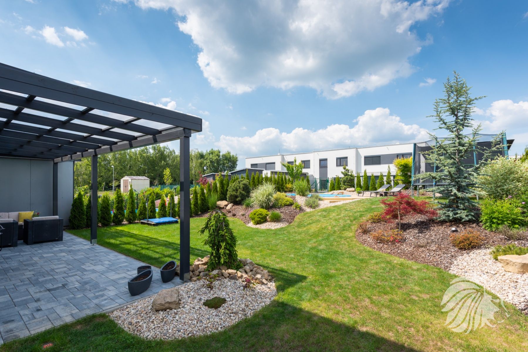 o výměře 460 m² včetně boční a přední části je navržena zahradní architektkou tak, aby byla barevná celé vegetační období. Myšleno bylo i na úpravy výšek terénů na budoucí vzrůst dřevin.