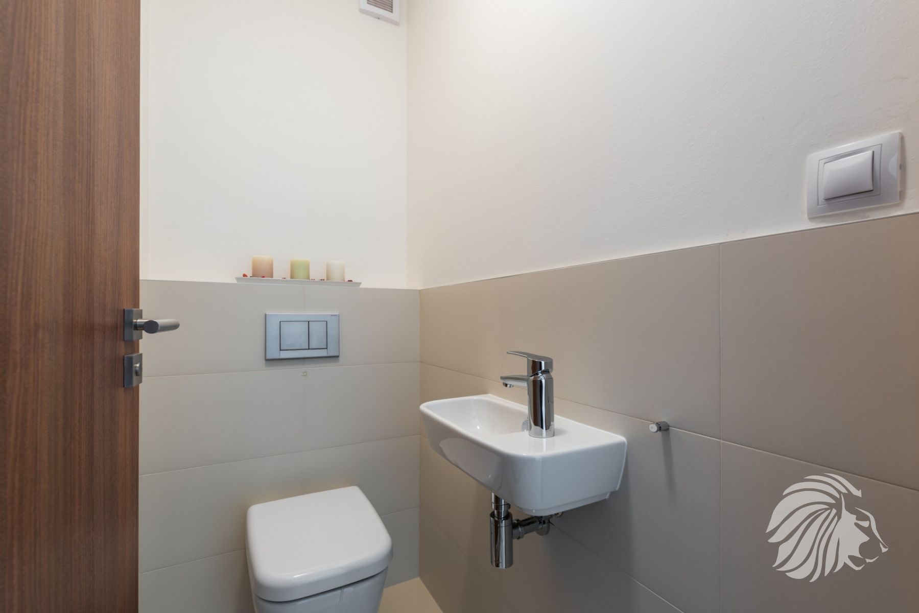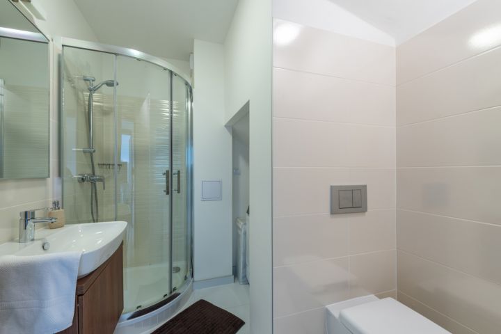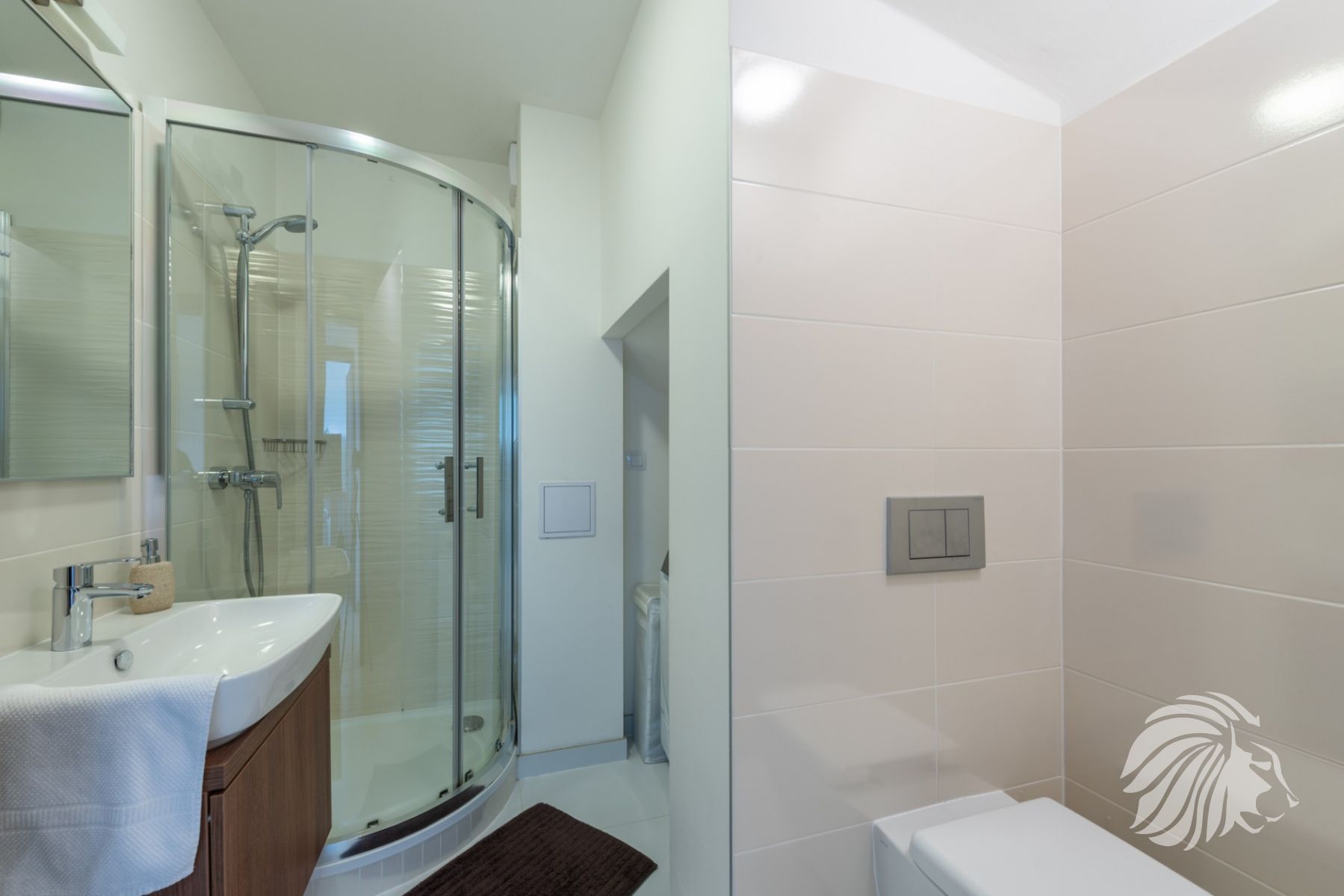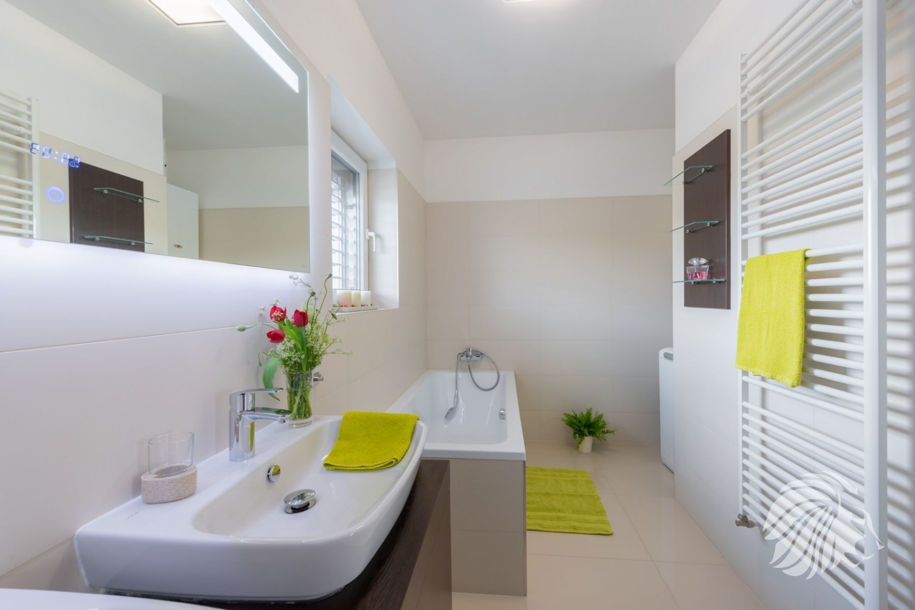 s vanou, denní světlo, elegantní nábytek, zrcadlo s digitálními hodinami a zabudovaným osvětlením, Přípojka a prostor na pračku včetně kondenzačního kotle se zásobníkem teplé vody jsou schovány v zadní části koupelny. 2 otopné elektrické žebříky.