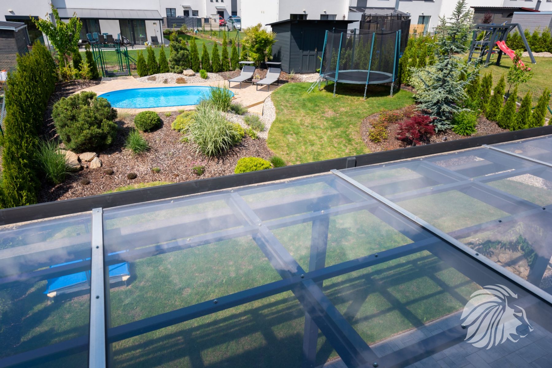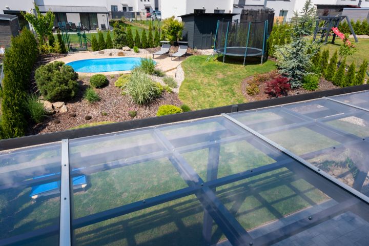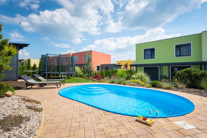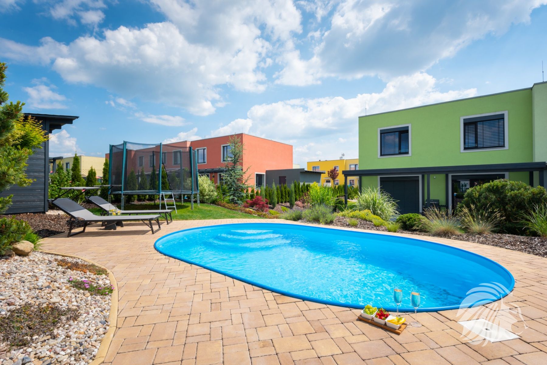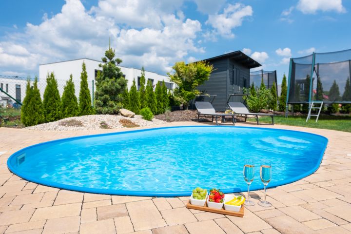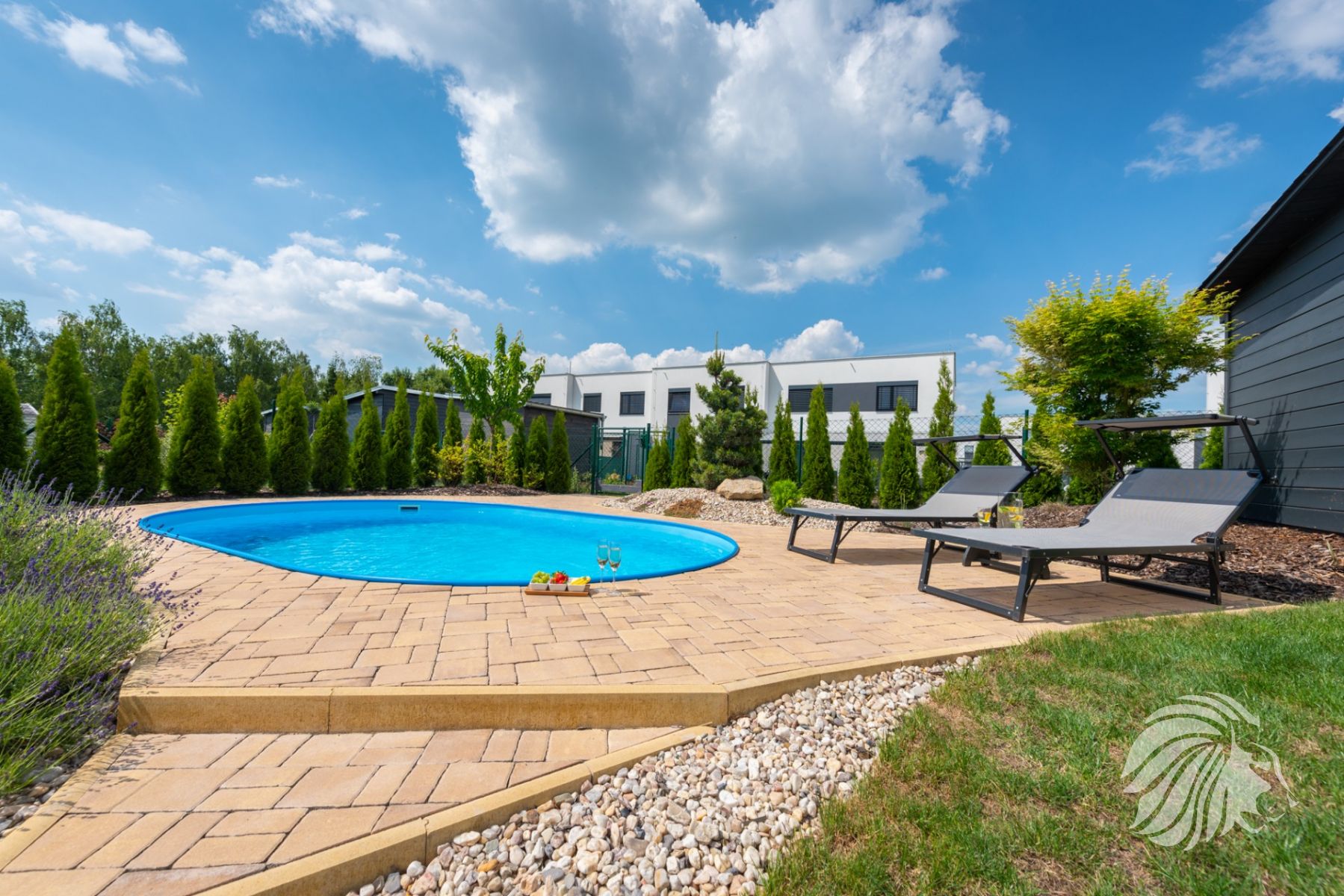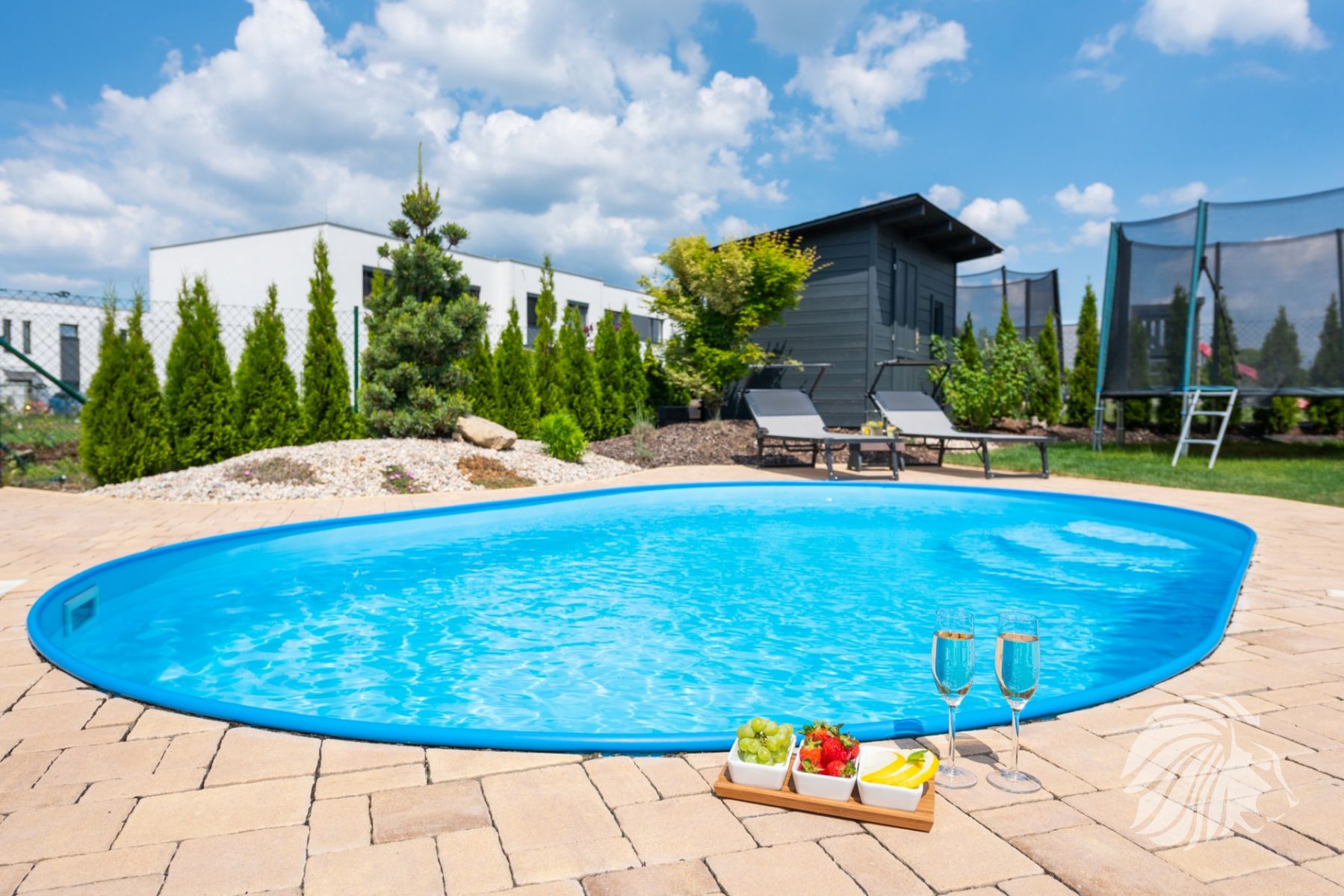 je zabudován na vyvýšeném místě do valu ze zeminy. Soukromí zajišťují krásné zdravé túje. Rozměry bazénu 5,00 × 3,20 × 1,25 m – hloubka. Zámková dlažba je navržena tak, aby zajistila dostatek prostoru při pohybu kolem bazénu i místo pro lehátka. Bazén je na slunci vyhříván až na teplotu 27 stupňů. Písková filtrace je umístěna v nářaďovém dřevěném domku (3 × 2 m) s přívodem elektřiny. Osvětlení bazénu spolu s osvětlením terasy navozuje luxusní a romantickou atmosféru.