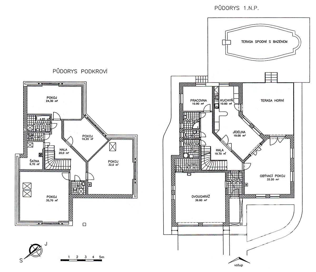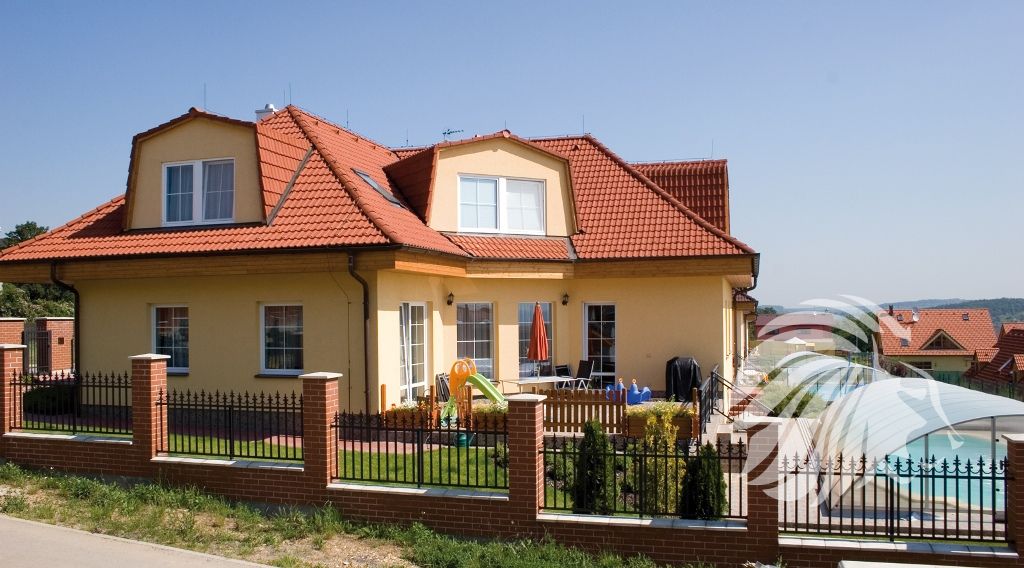 Součástí je terasa 36 m², dvougaráž, venkovní vyhřívaný krytý bazén