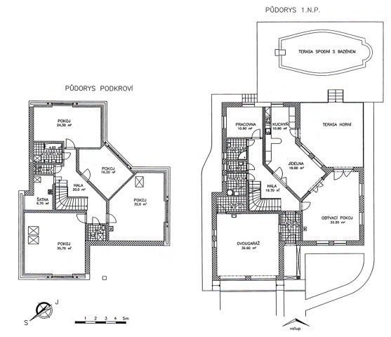 1.patro: 4 neprůchozí ložnice, koupelna, toaleta a šatna.