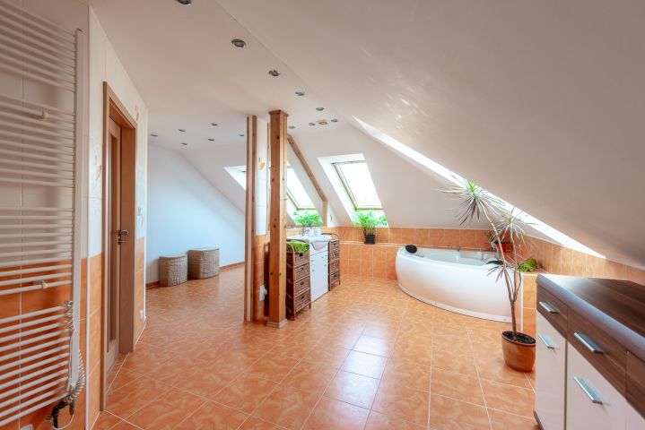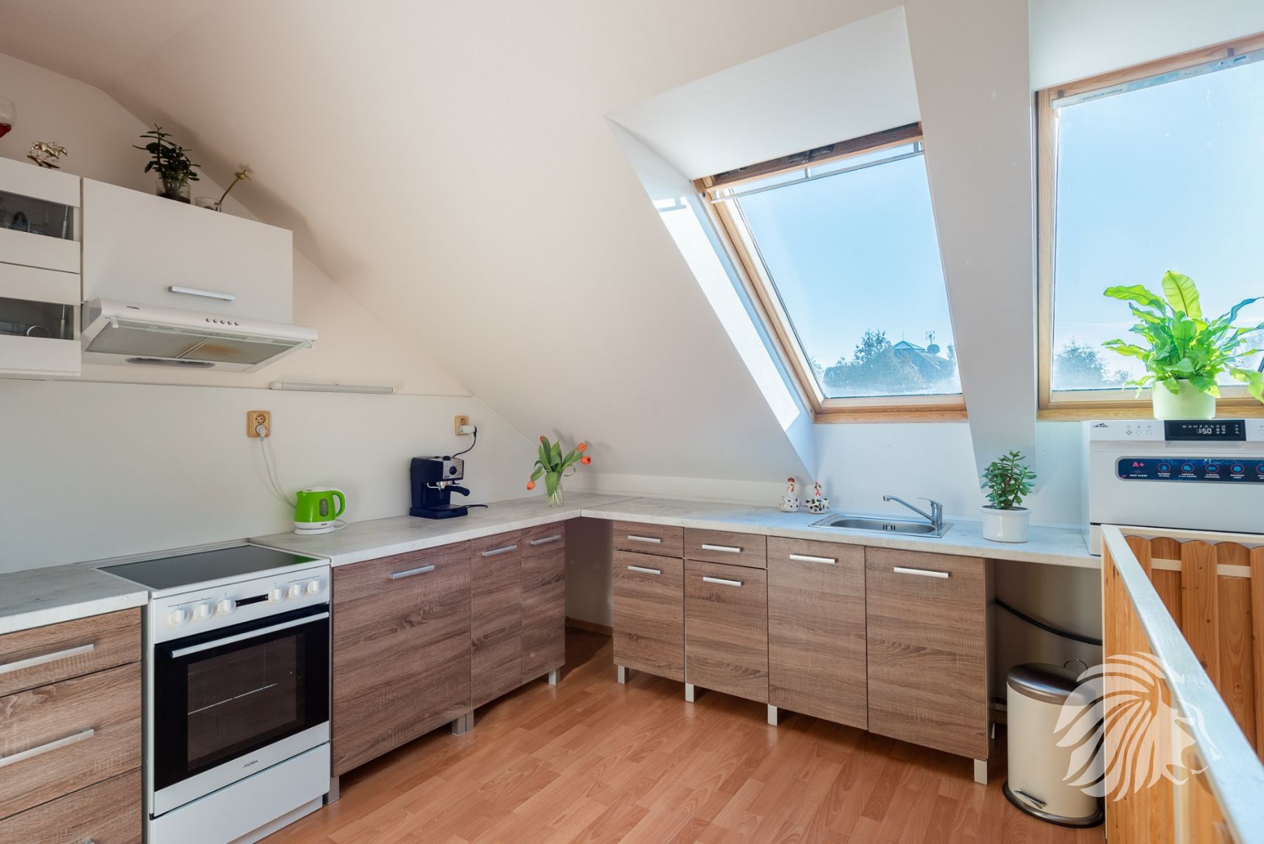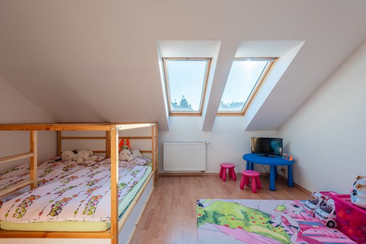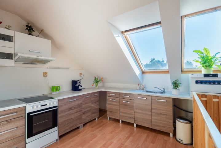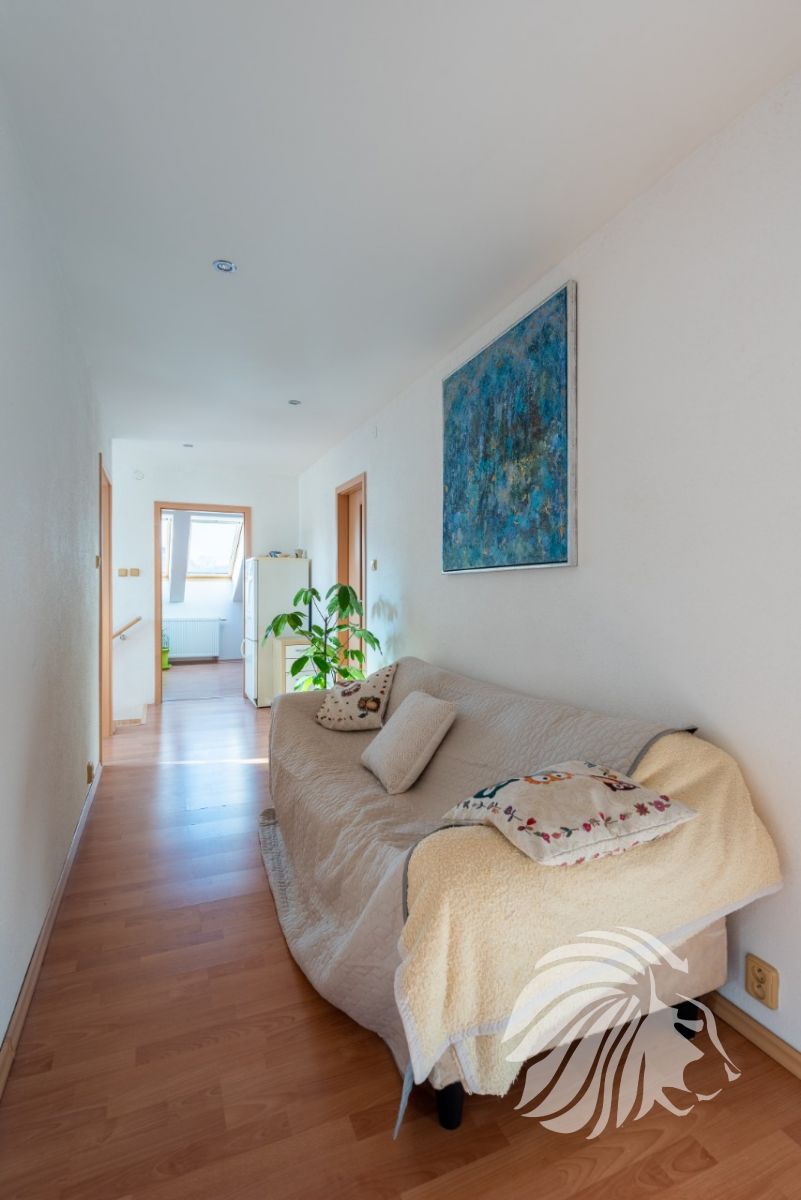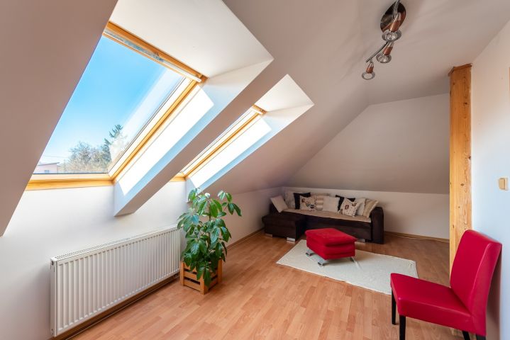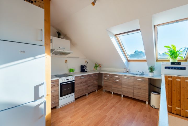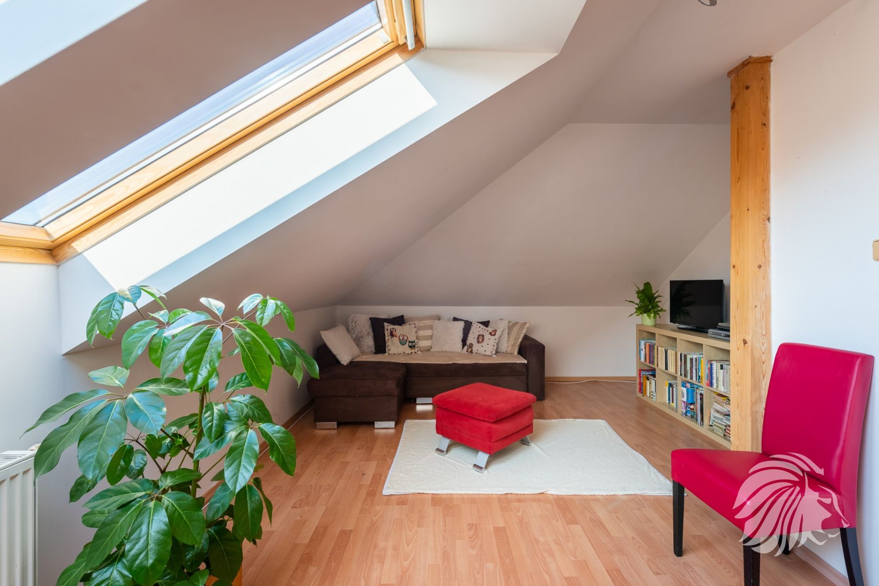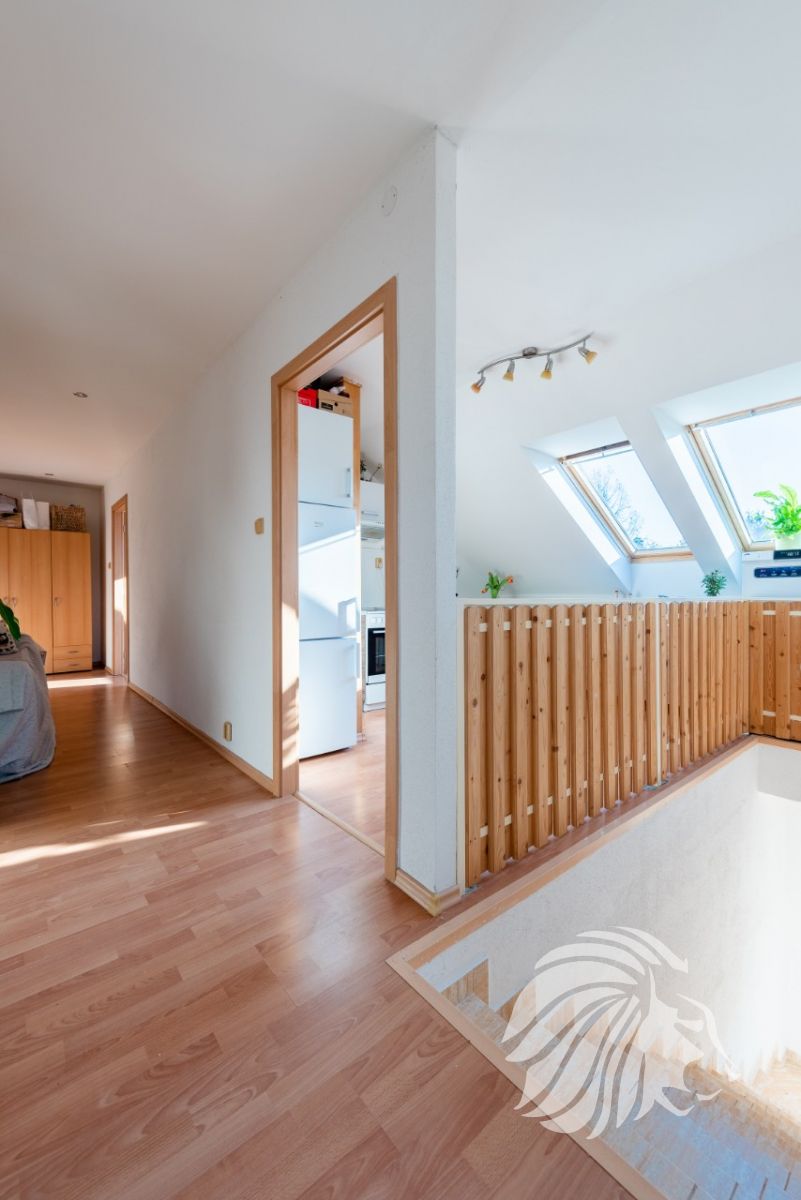 cca100 m², podkrovní s vlastním vstupem vznikl stavebním oddělením od prostor RD. Byt je možné pronajmout.