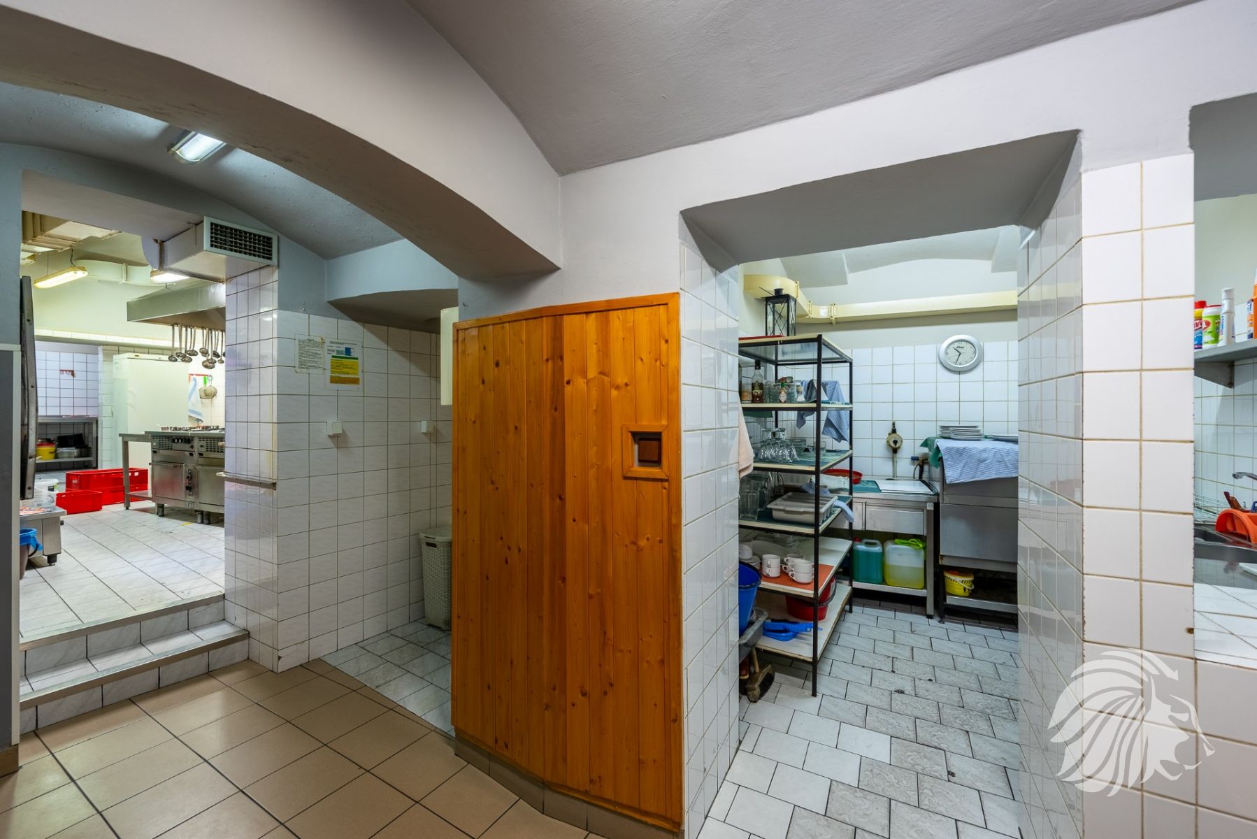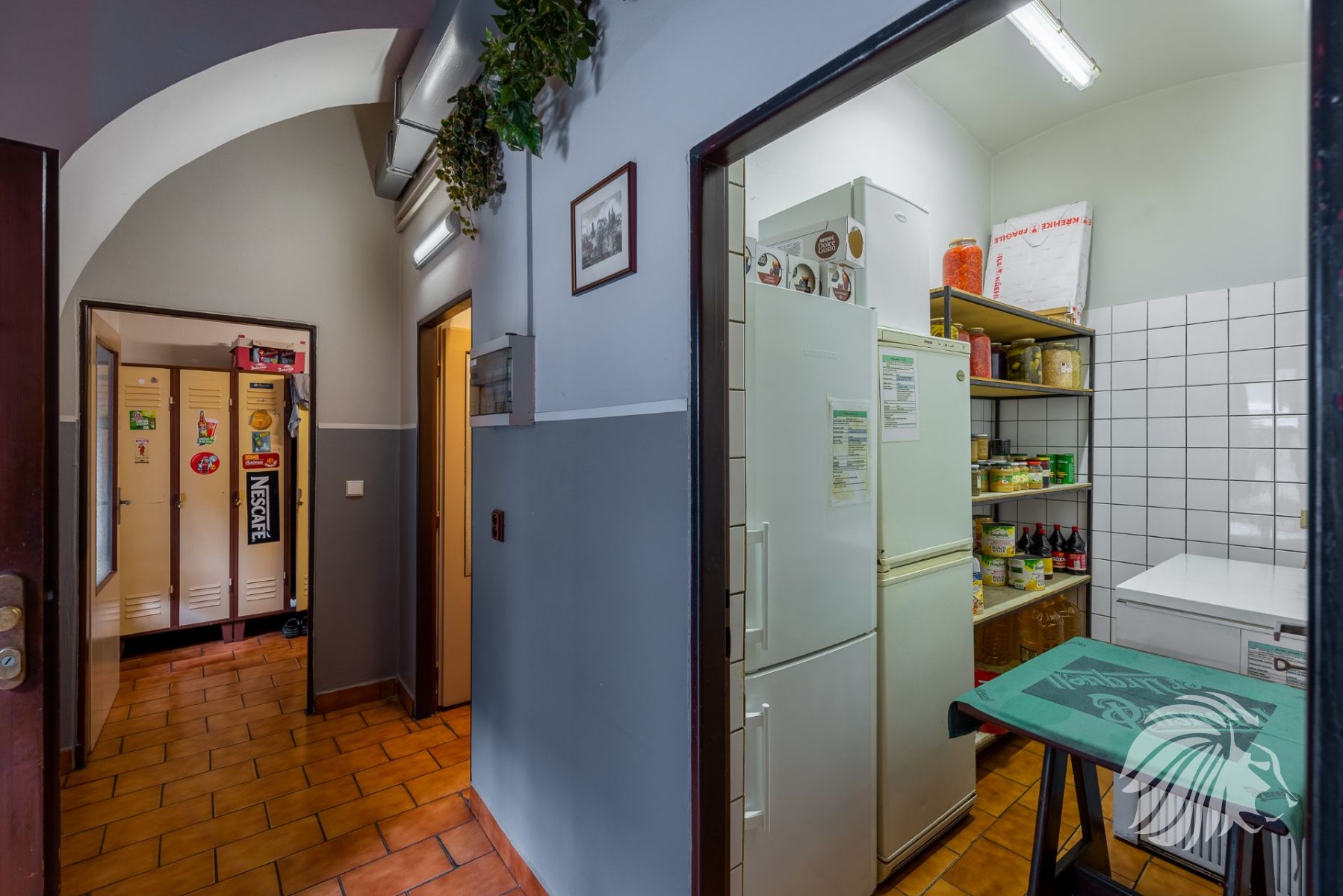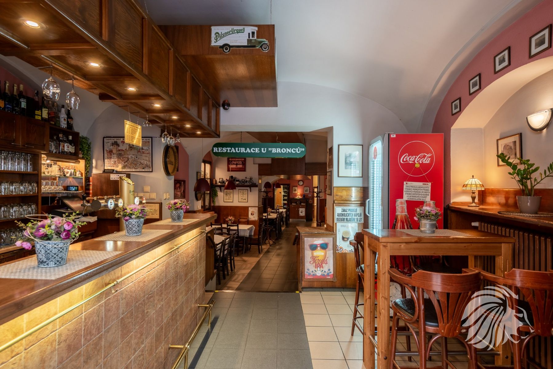 cca 20 m²pivní sklad – chladicí box na míru s chladicí jednotkou. Zásobování do suterénu samočinně pomocí kladky a lana. Přístup do suterénu jak poklopem v komunikaci, tak schodištěm.