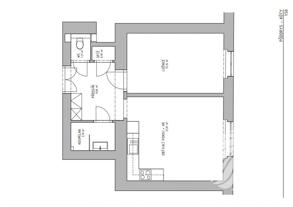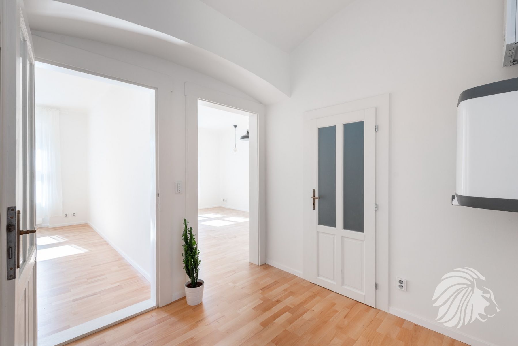 Byt tvoří prostorná vstupní chodba se samostatnými vstupy na WC, do komory, koupelny a dvou místností. V obývacím pokoji provedena příprava na kuchyňskou linku vč. myčky. (příprava na pračku je na chodbě pod bojlerem). Kompletní rekonstrukce bytu zajistila mimo jiné také dostatek el. zásuvek v celém bytě s logickým rozmístěním. Komora i WC nabízejí bohatý úložný prostor vč. ložnice, kde lze vybudovat vestavěnou skříň. Koupelna v moderním industriálním stylu je vybavena teplovodním žebříkem, sprchou se sprchovým deštěm a koupelnovým nábytkem.