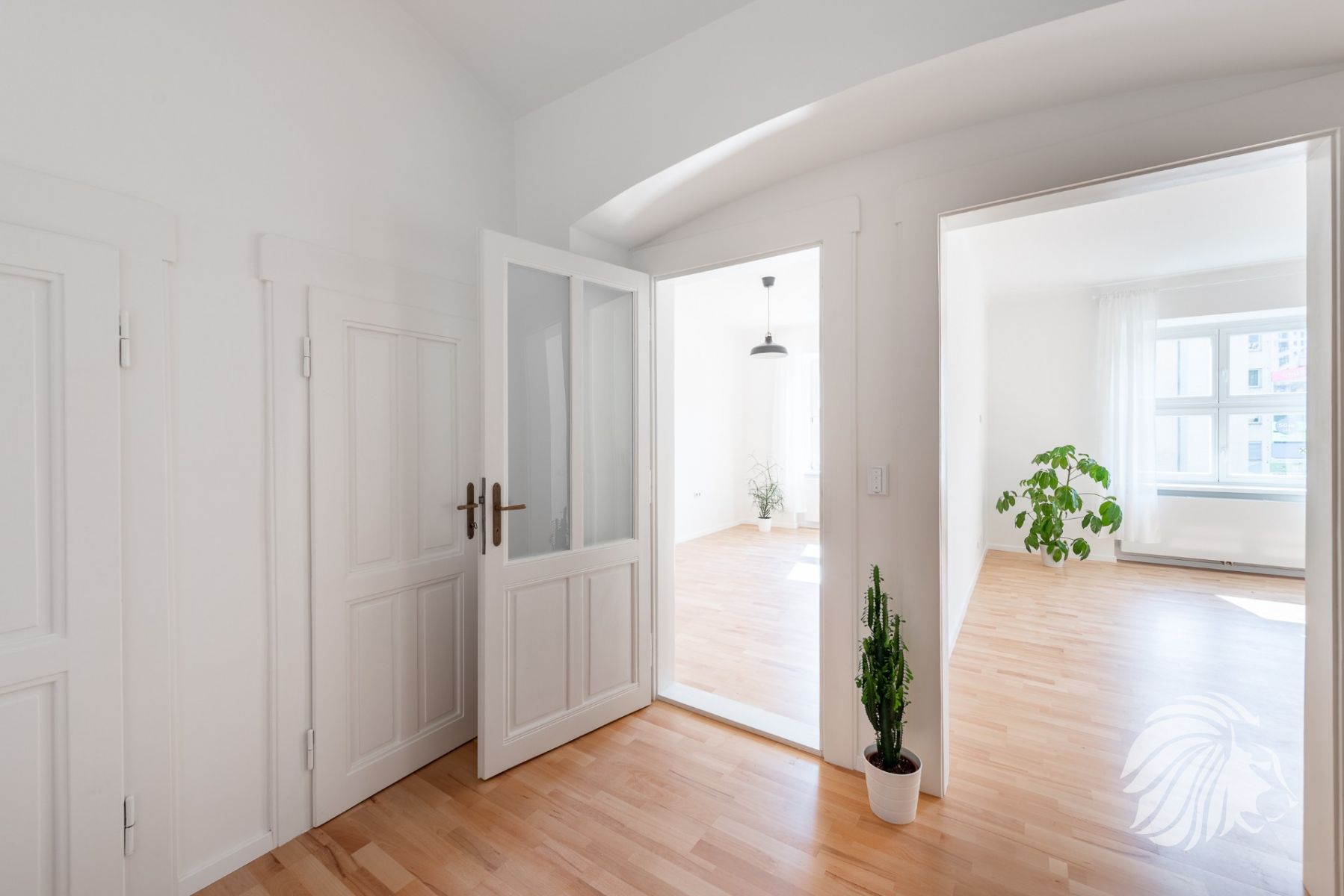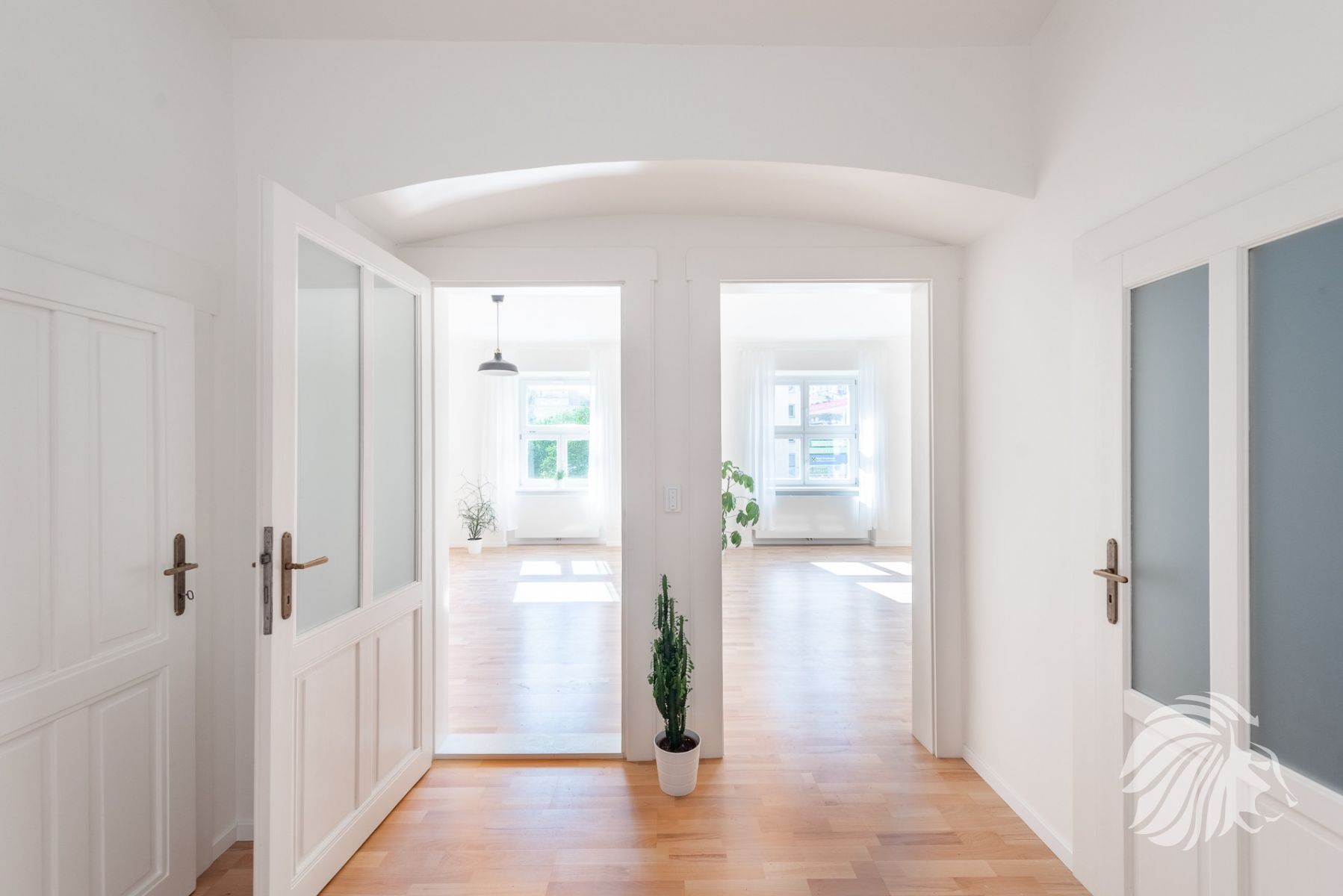 Byt prošel detailní a promyšlenou rekonstrukcí v cílem udržet historický genius loci prostoru včetně zachované klenby na chodbě / koupelně a kvalitně renovovanými historickými dveřmi v matném nátěru, vše doplněné o standard moderního bydlení: komplet nové el. rozvody + třífázový jistič, nové štuky a omítky, dřevěná buková podlaha, nová dřevěná okna, italské keramické obklady, nové stoupačky v plastu.