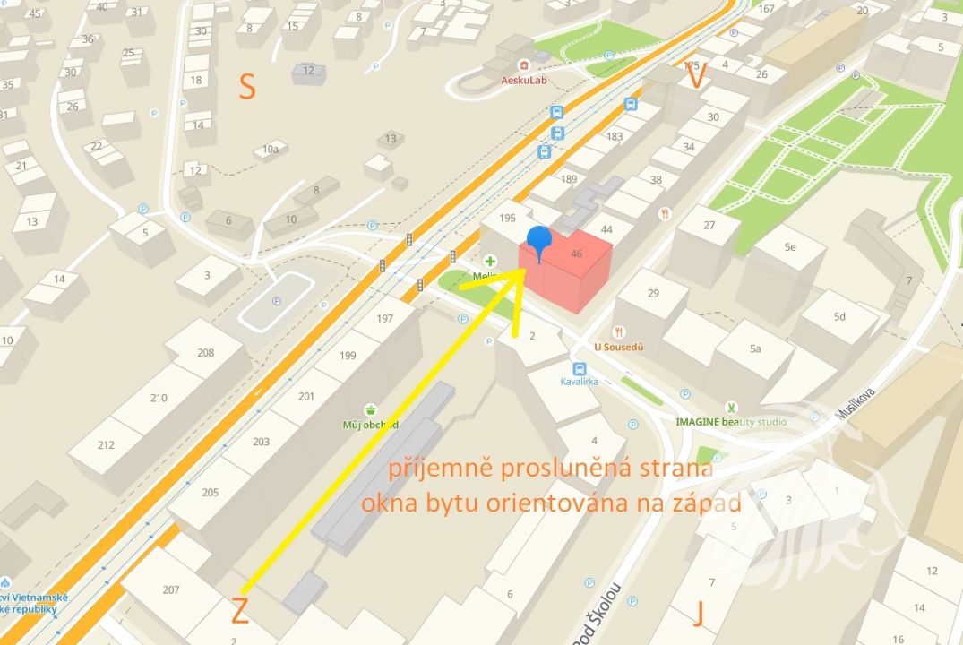 Byt, k němuž náleží právo na užívání sklepní jednotky v suterénu domu, se nachází na ulici Musílkova, Praha 5 Košíře, ve 2. nadzemním podlaží (1.patro) činžovního prvorepublikového domu kolaudovaného v 11/1926. V roce 1945 přistavěna další patra. 7 podlažní podsklepený dům o 28 bytových jednotkách stojí v obklopení parků Košíře Motol, Cibulky, zahrady Klamovky či skalního hřebenu Skalka. Atmosféra v bytě je zaručena orientací na téměř čistý západ s příjemně dopadajícími měkkými slunečními paprsky.