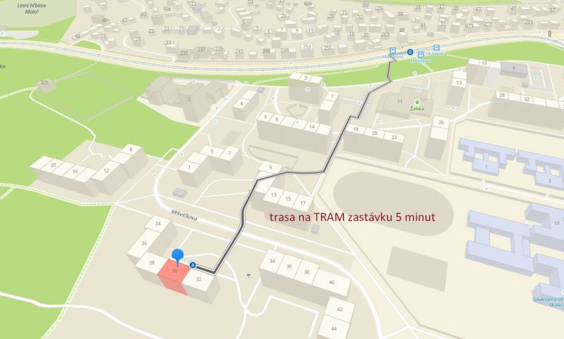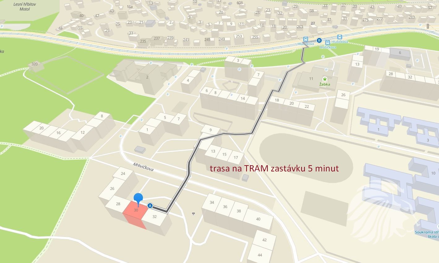 Pěší vzdálenost na TRAM a BUS 5 min. směřující na Anděl, zastávka