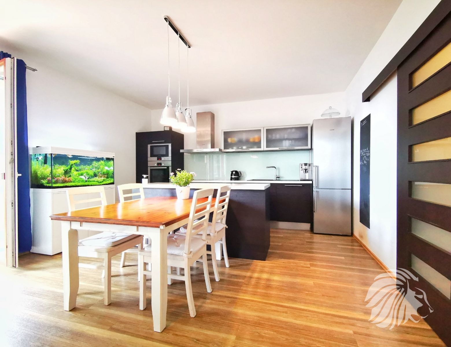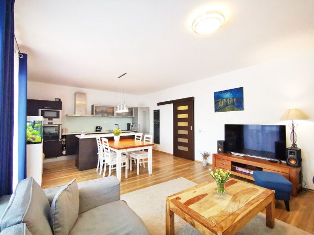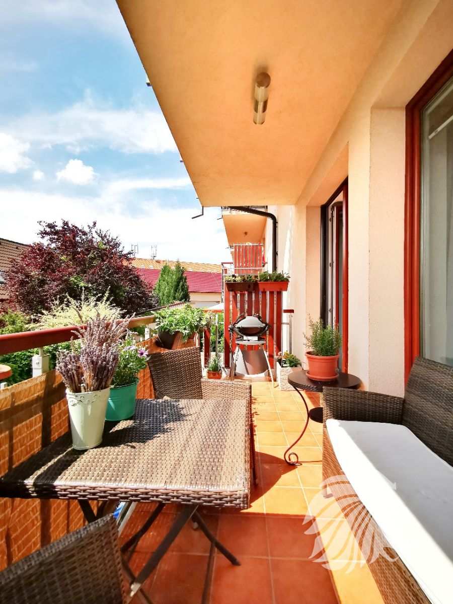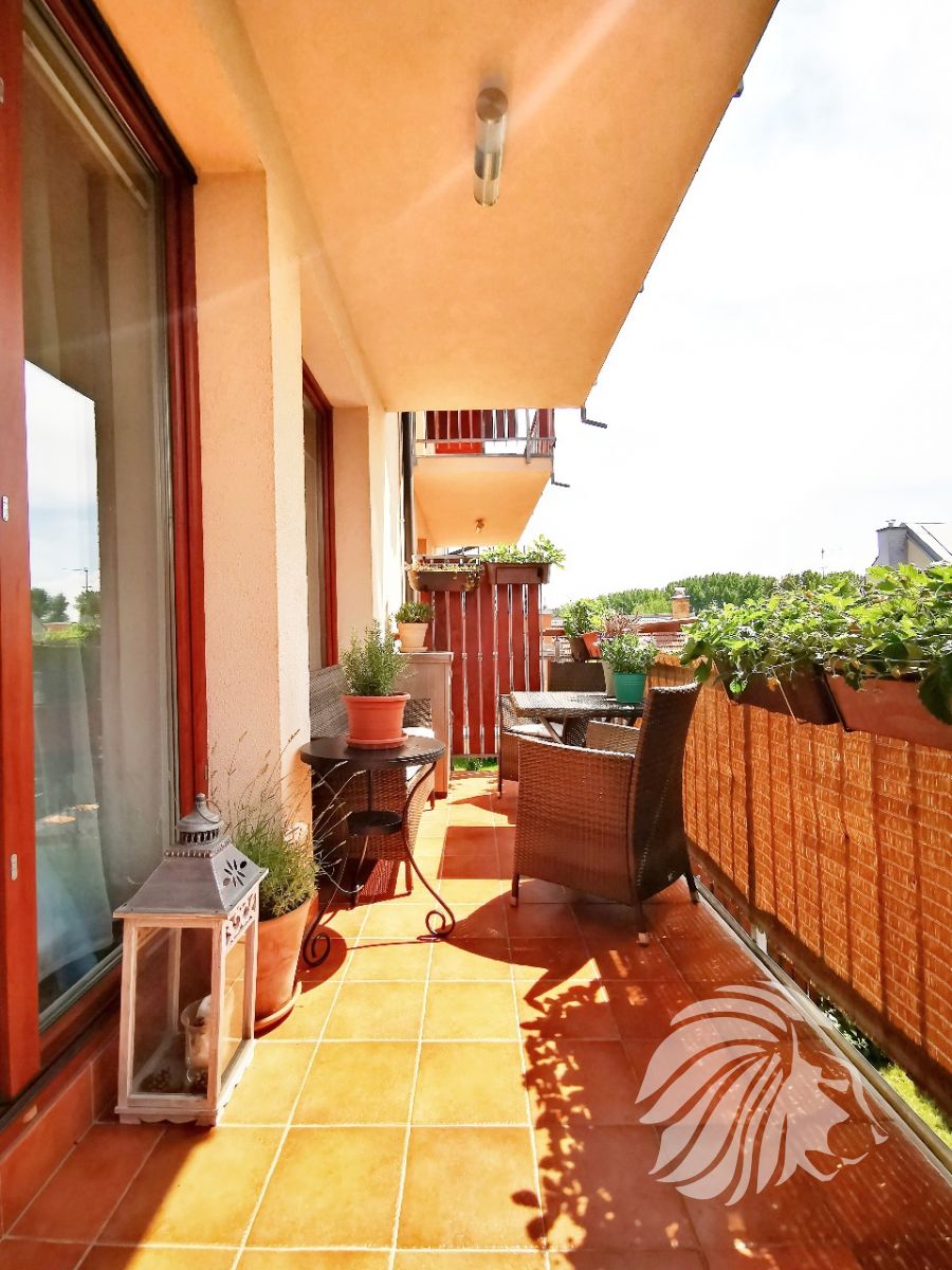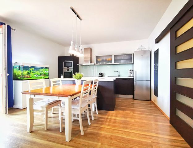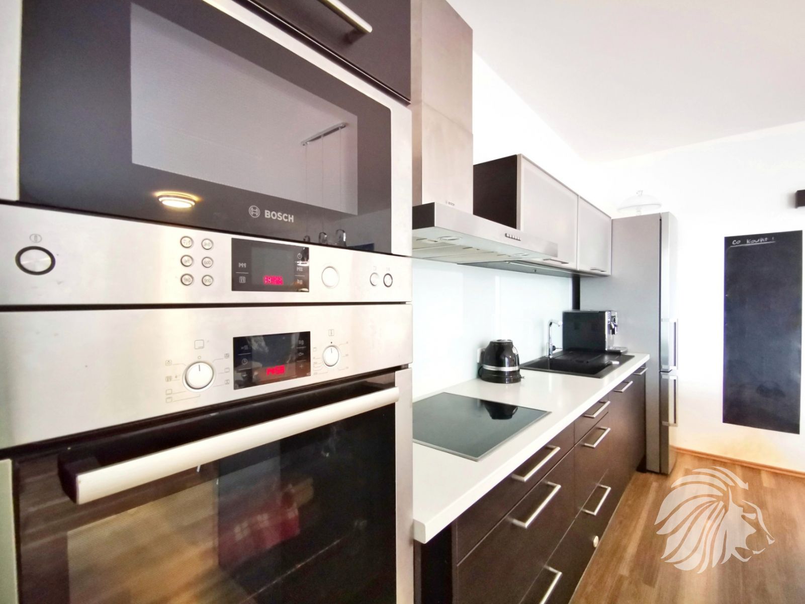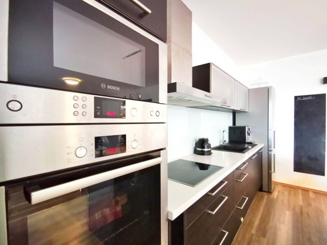 Kuchyně: kuchyňská linka s ostrůvkem se zápustnou el. zásuvkou. Granitový dřez, myčka Whirlpool, moderní mikrovlnná a horkovzdušná trouba v jednom designu zn. BOSCH, indukční varná deska BOSCH. Lednice Siemens s třípatrovým mrazákem. Pračka na 5 kg Gorenje, sušička BOSCH. Po dohodě mohou být ponechány záclony, závěsy a sedací souprava.