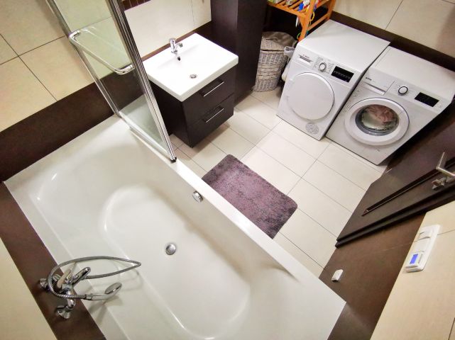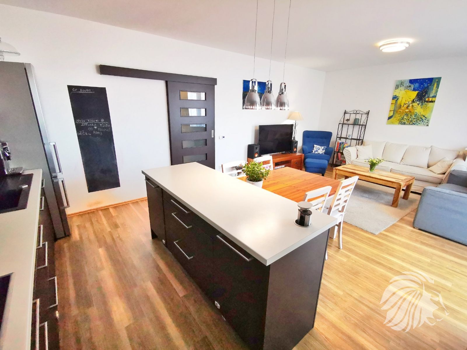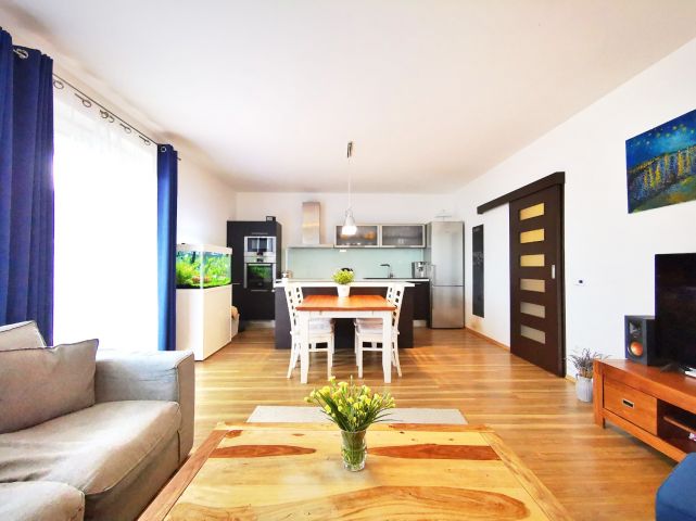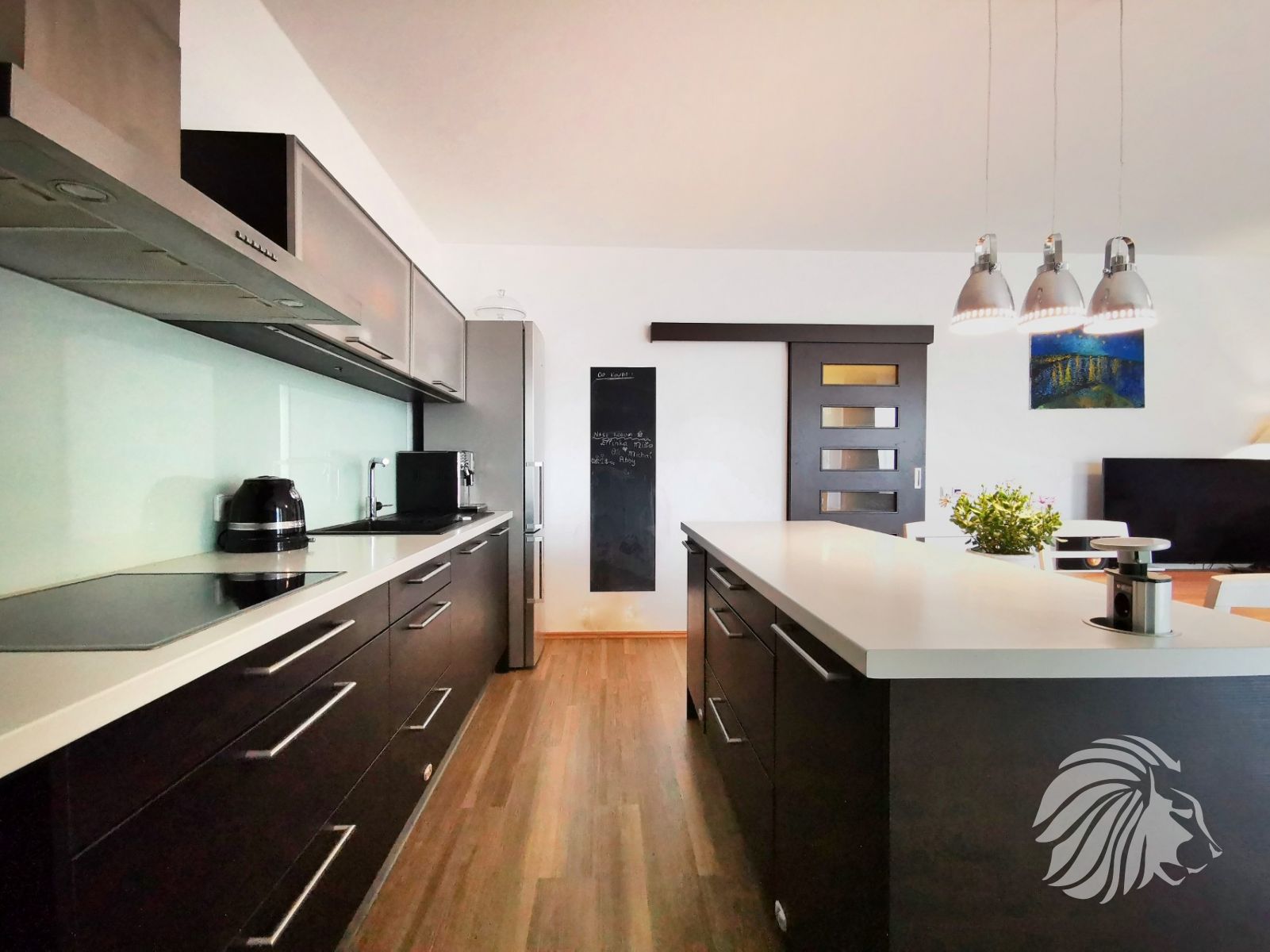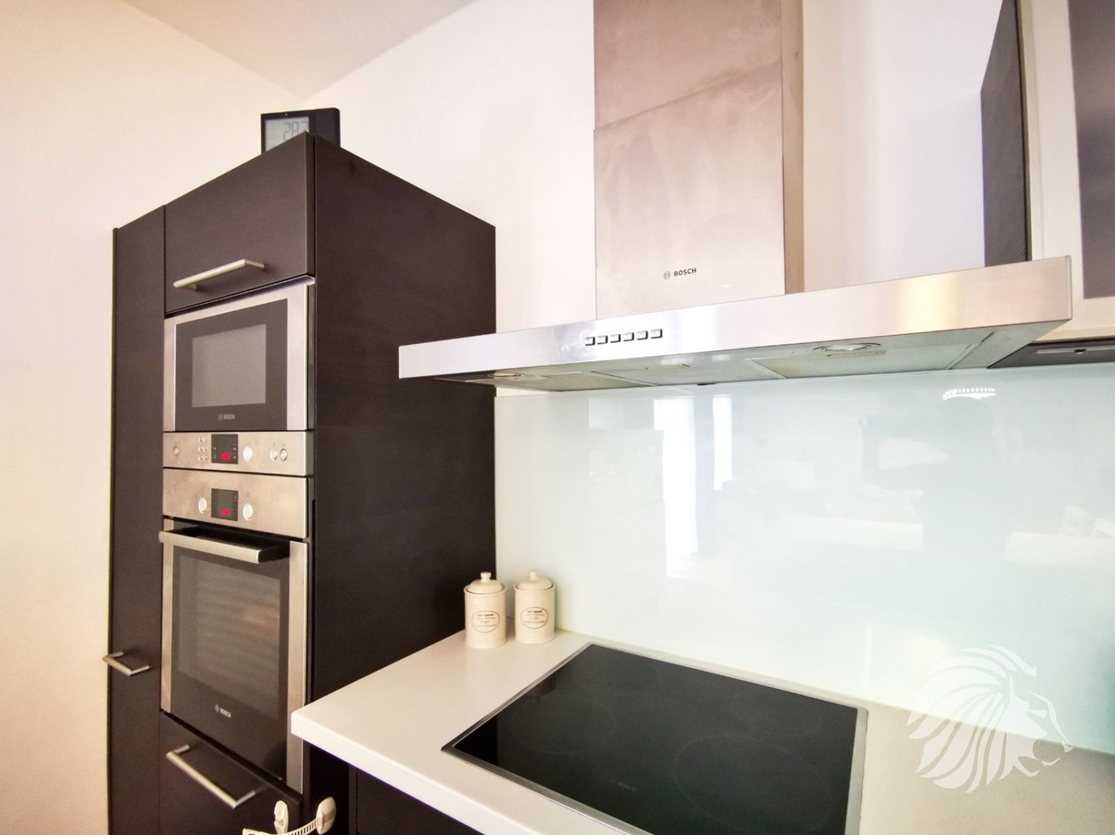 Kuchyně: kuchyňská linka s ostrůvkem se zápustnou el. zásuvkou. Granitový dřez, myčka Whirlpool, moderní mikrovlnná a horkovzdušná trouba v jednom designu zn. BOSCH, indukční varná deska BOSCH. Lednice Siemens s třípatrovým mrazákem. Pračka na 5 kg Gorenje, sušička BOSCH. Po dohodě mohou být ponechány záclony, závěsy a sedací souprava.