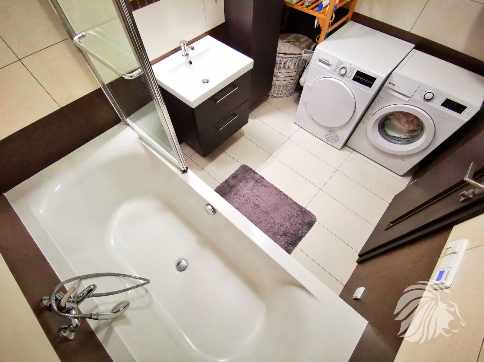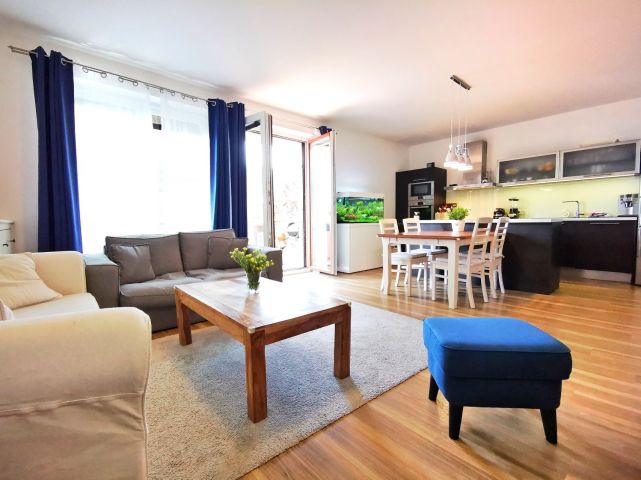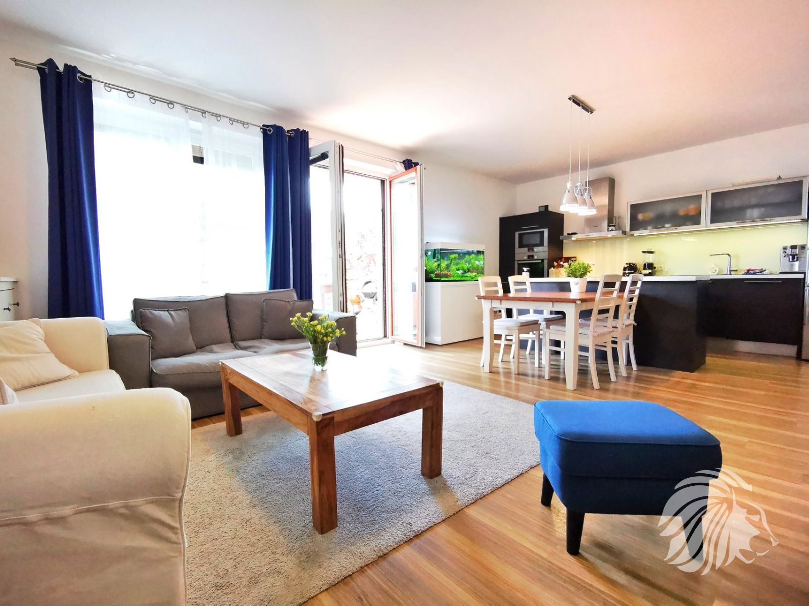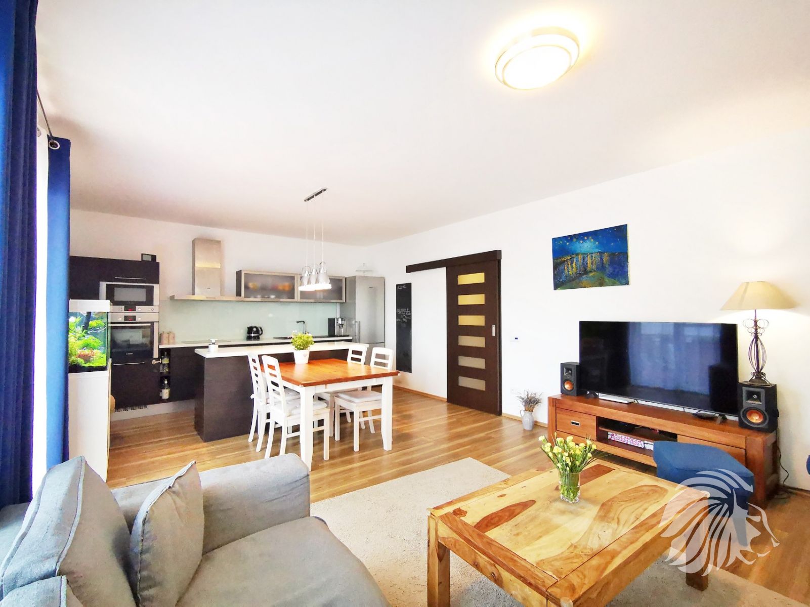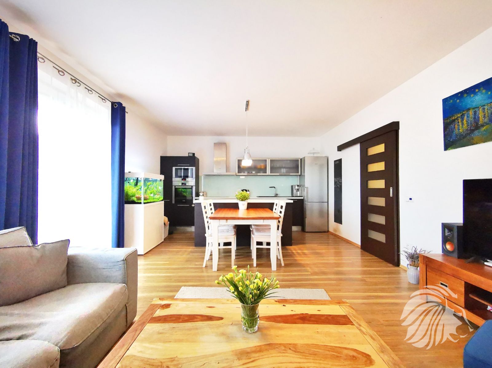 Kuchyně: kuchyňská linka s ostrůvkem se zápustnou el. zásuvkou. Granitový dřez, myčka Whirlpool, moderní mikrovlnná a horkovzdušná trouba v jednom designu zn. BOSCH, indukční varná deska BOSCH. Lednice Siemens s třípatrovým mrazákem. Pračka na 5 kg Gorenje, sušička BOSCH. Po dohodě mohou být ponechány záclony, závěsy a sedací souprava.