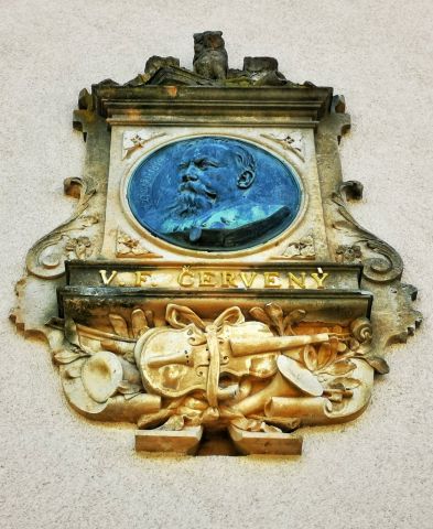 Budovu garáží zdobí pamětní deska s bohatou reliéfní výzdobou. Pod medailonem je zlatým písmem jméno V. F. Červený. Desku vytvořil sochař A. Formánek podle návrhu prof. Kouly. Bronzovou část odlila Maškova slévárna Karlín s použitím makety sochaře Stránského. Václav František Červený byl jeden z nejvýznamnějších českých a evropských výrobců hudebních nástrojů. Specializoval se na dechové instrumenty, zejména žestě.