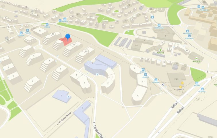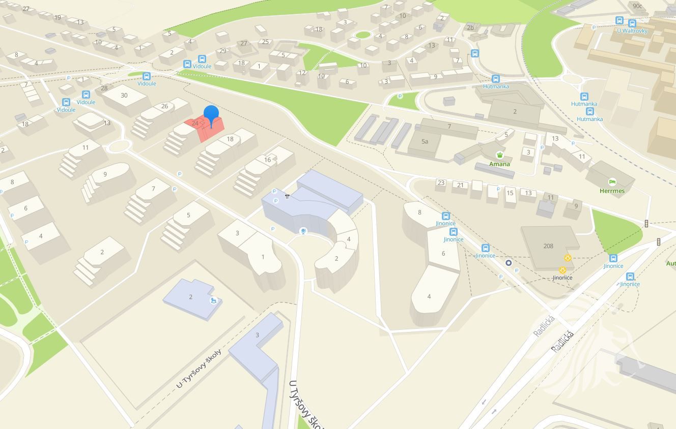 Standardní parkovací stání se nachází v podzemních garážích domu. Lokalita je výborně občansky vybavena (mateřská škola, základní škola). Pár kroků od domu se nachází večerka se smíšeným zbožím. Metro B Jinonice vzdáleno 6 min. pěšky. Nákupní centrum Galerie Butovice je vzdáleno od domu 1,5 km. Nespočet dalších nákupních možností – Zličín, Smíchov. Lokalita je obklopena parky: Košíře – Motol, Prokopským údolím, kopcem Vidoule.