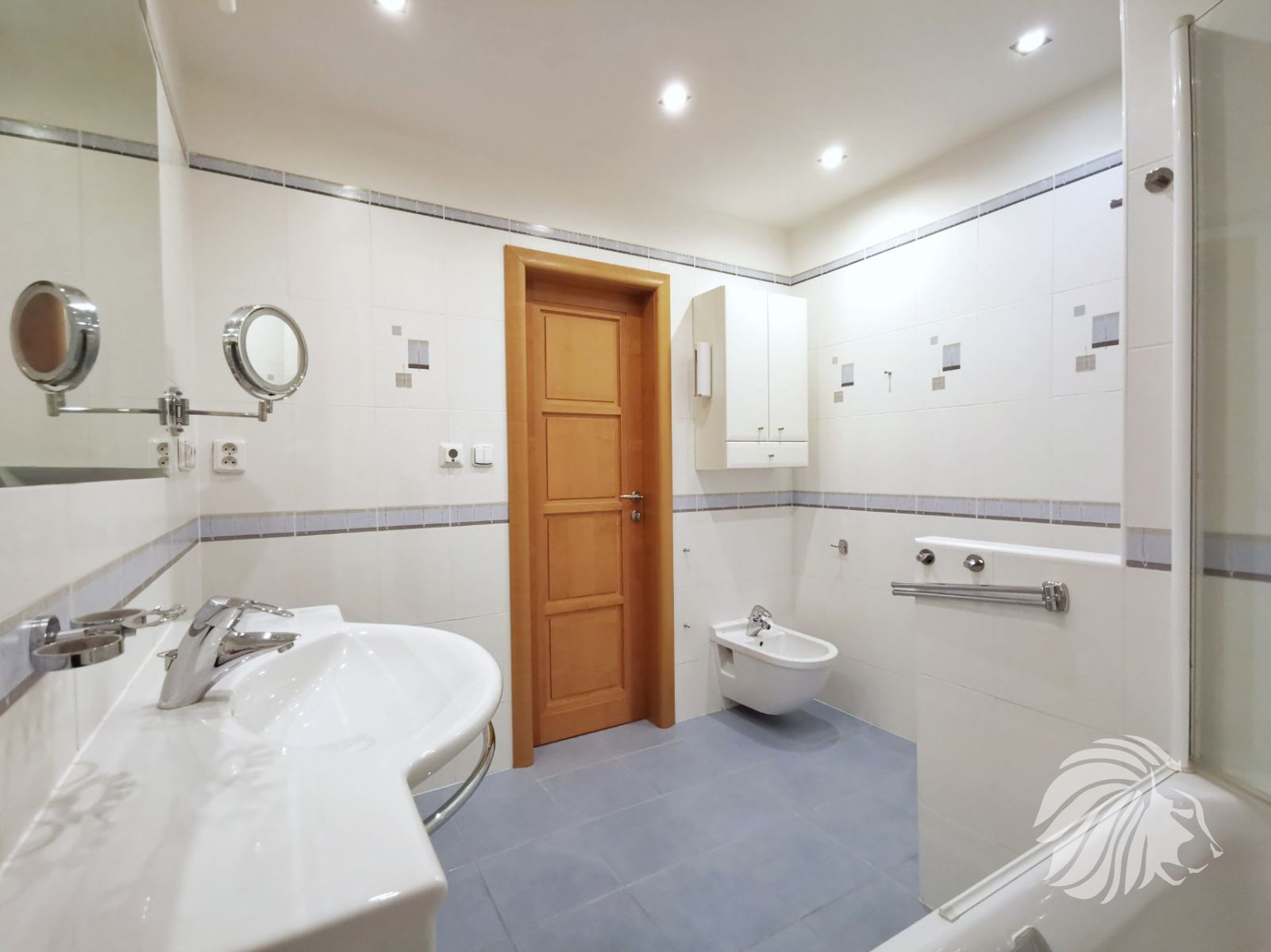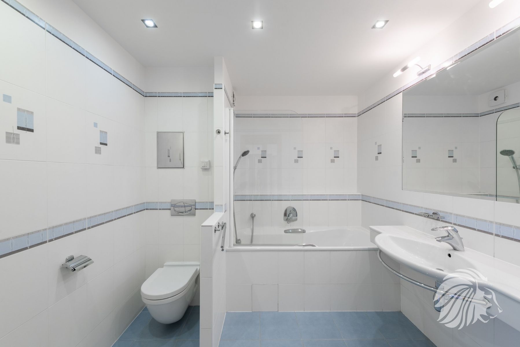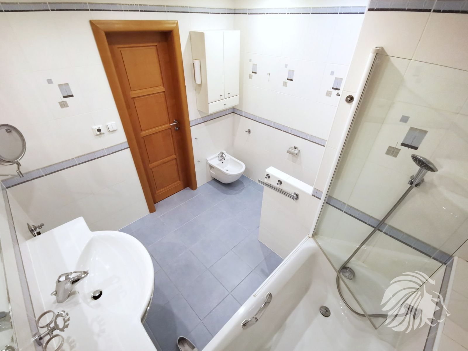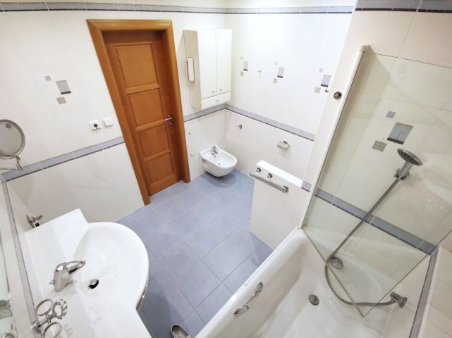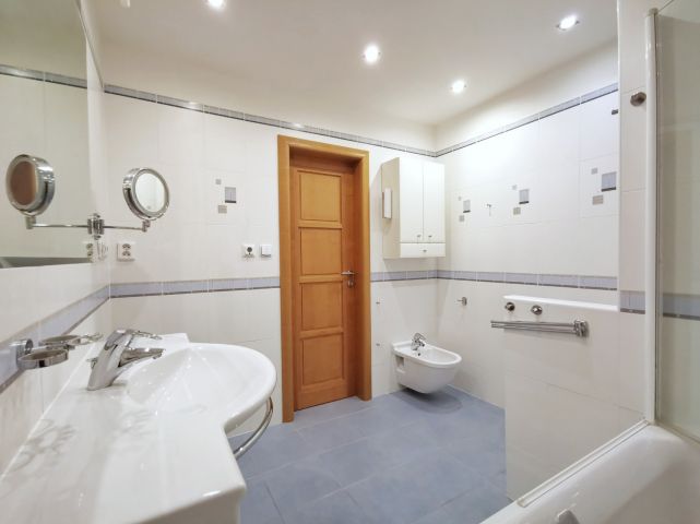 Koupelna velká: vana se zástěnou, bidet, toaleta, úložné prostory