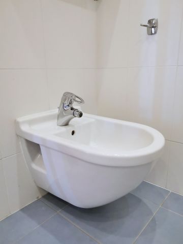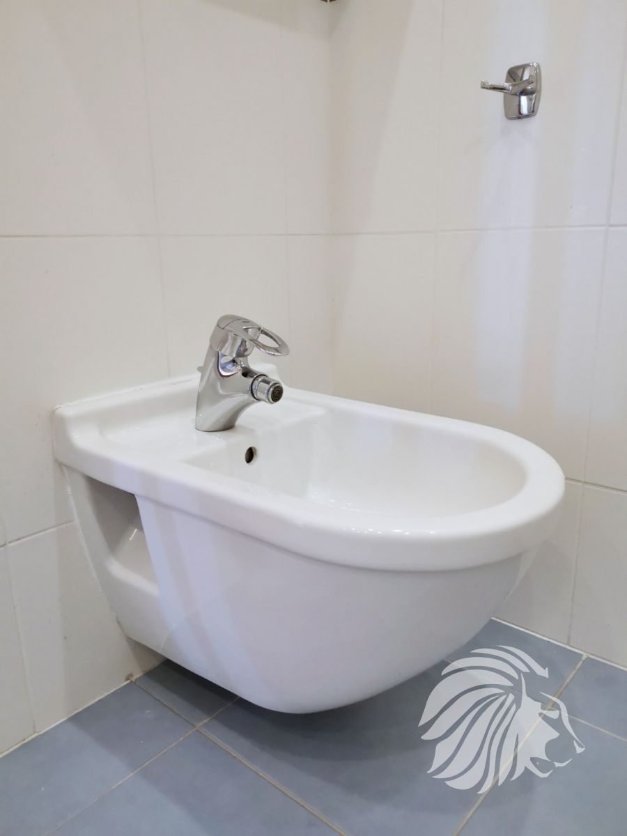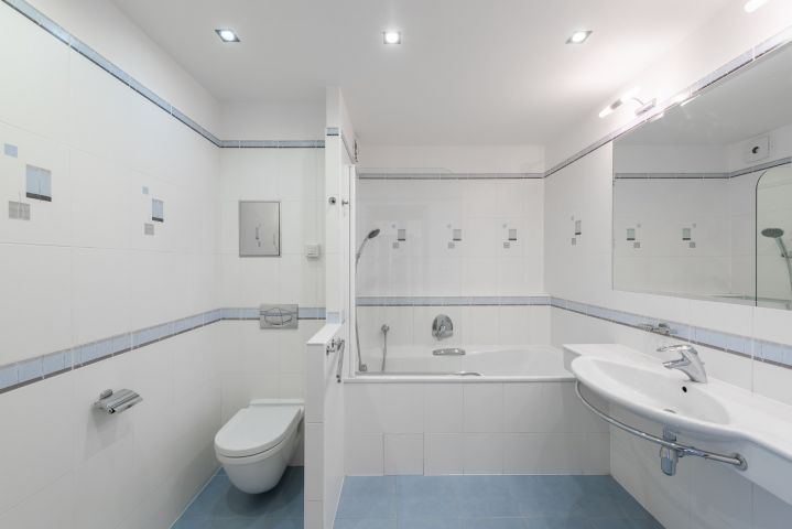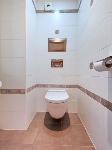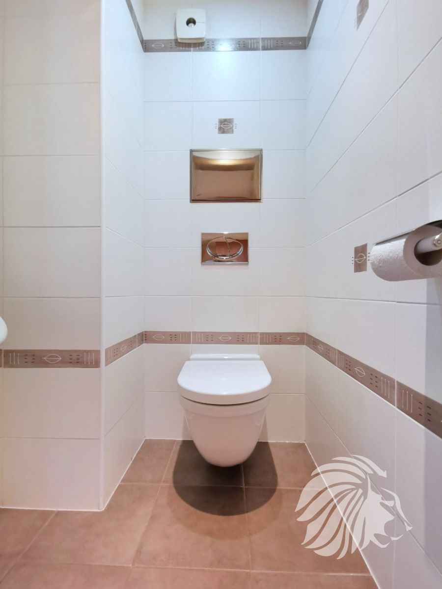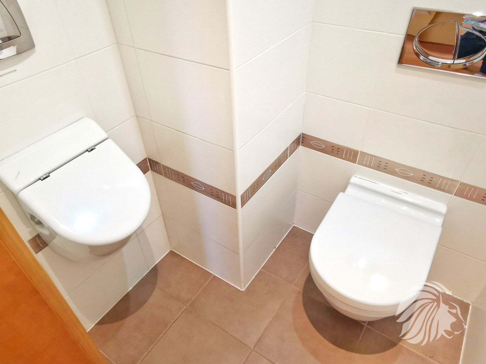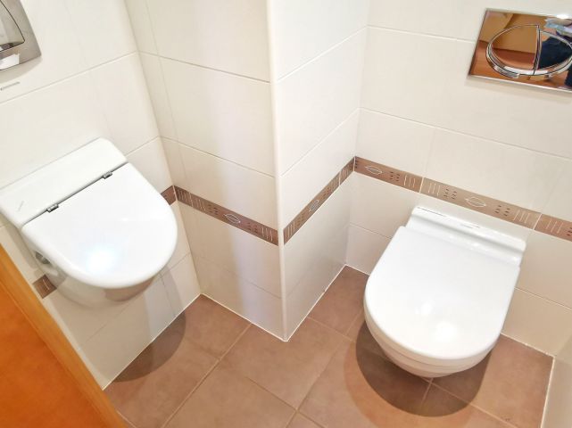 Koupelna velká: vana se zástěnou, bidet, toaleta, úložné prostory