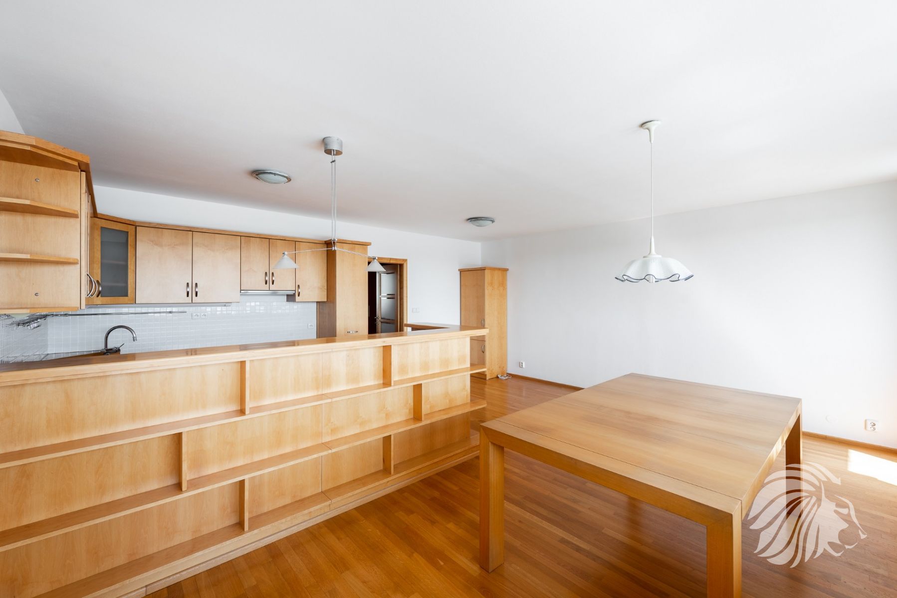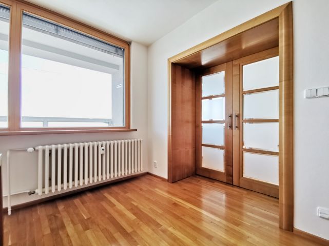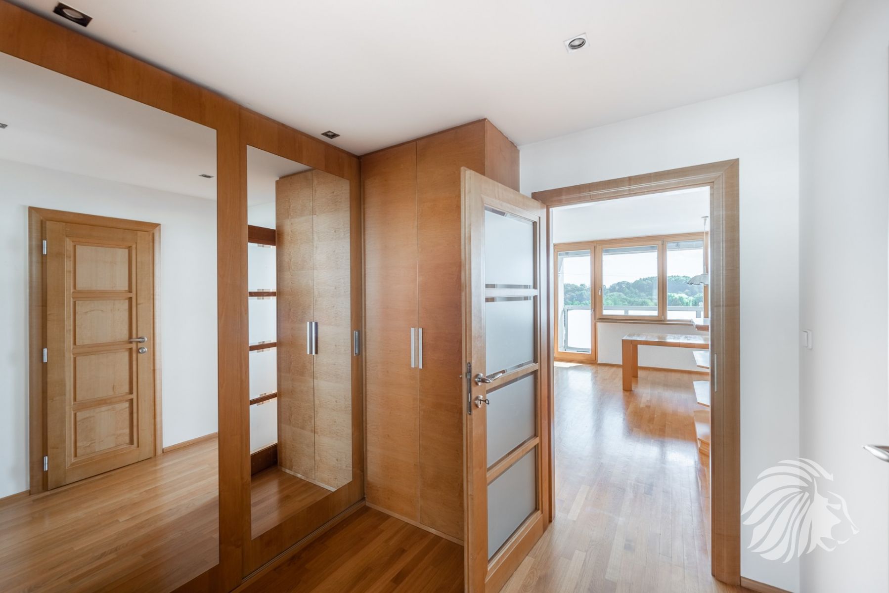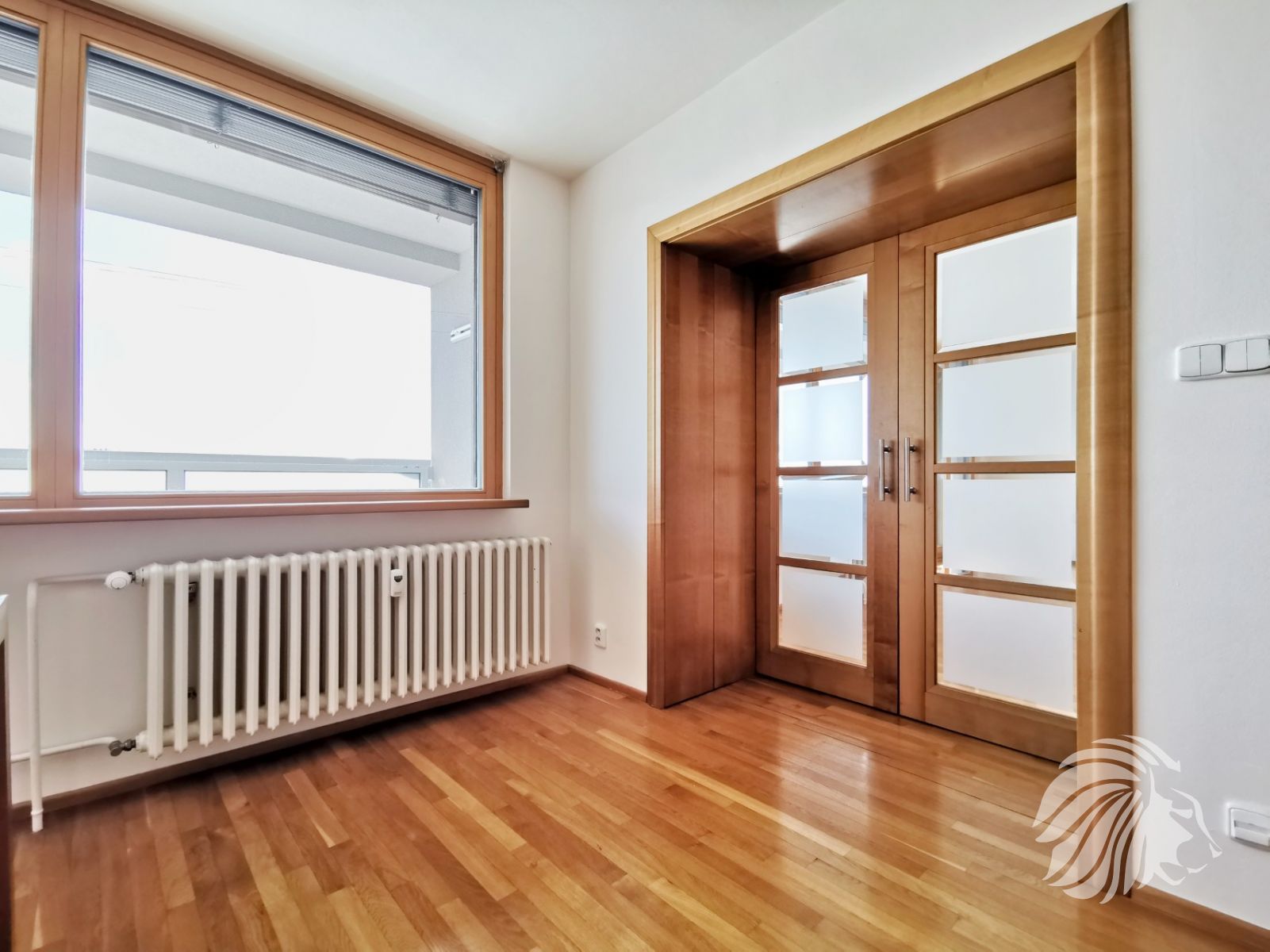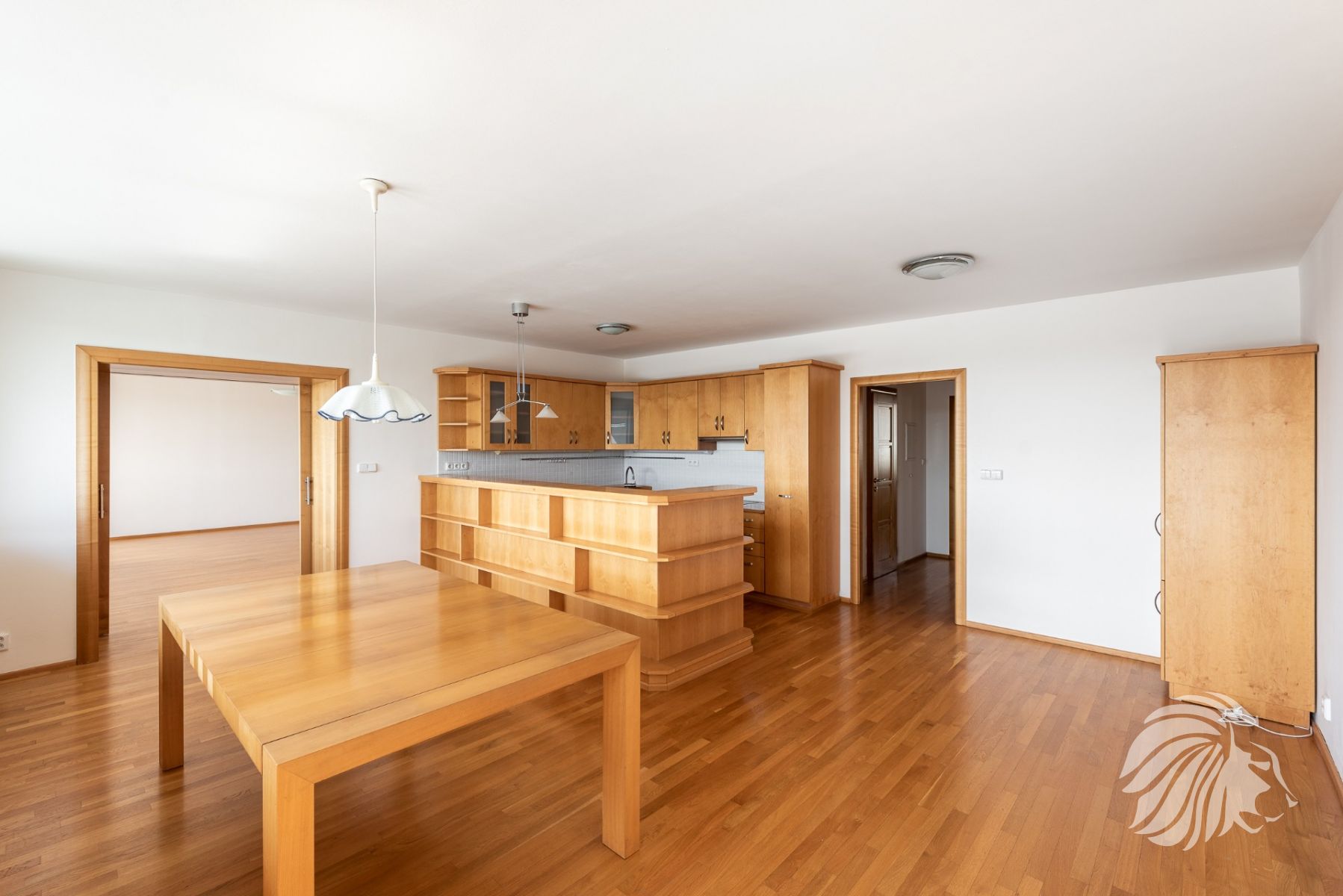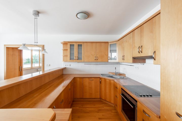Tato nabídka vám doslova vyrazí dech. Dva stavebně propojené byty v jeden celek o ploše 165 m² tvoří bydlení, které není pro každého. Je určeno milovníkům nadstandardu, světla, zeleně, prostoru a přírodních materiálů, jako je např. dřevo (na kvalitních materiálech se zde nešetřilo). Pocit, že nejste na sídlišti vám zajistí doslova gigantická kuchyň, dvě prosklené stěny se dvěma lodžiemi s výhledem na řadové domky a pahorkatý horizont plný zeleně. Nechybí ani vlastní garáž a další parkovací místo.