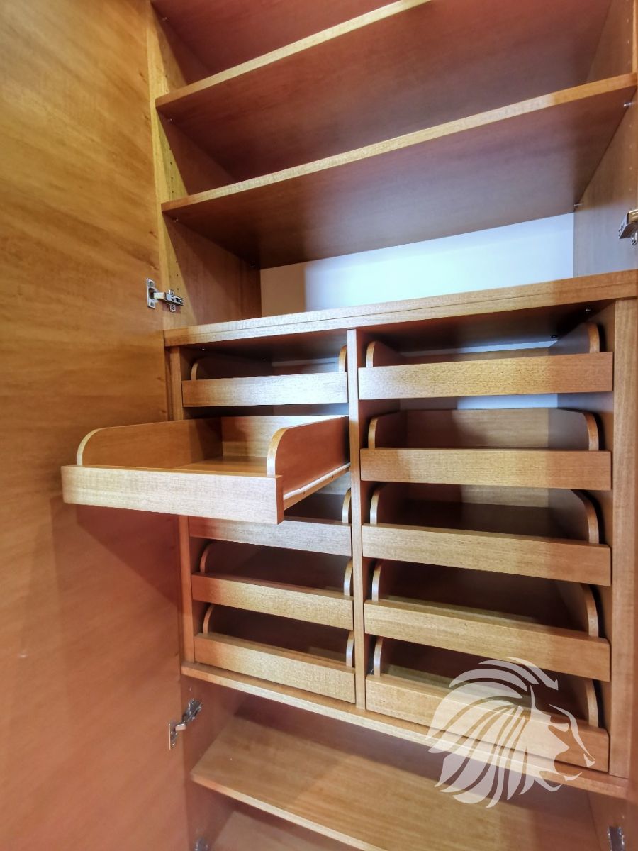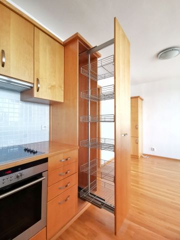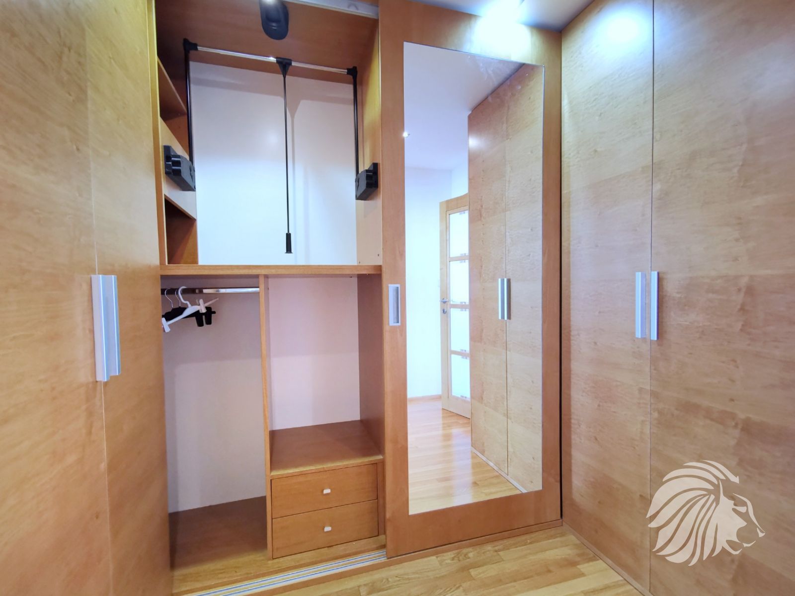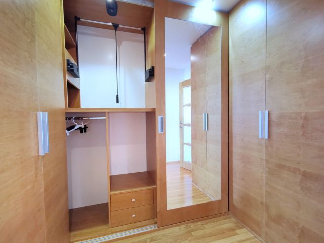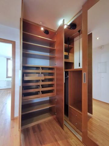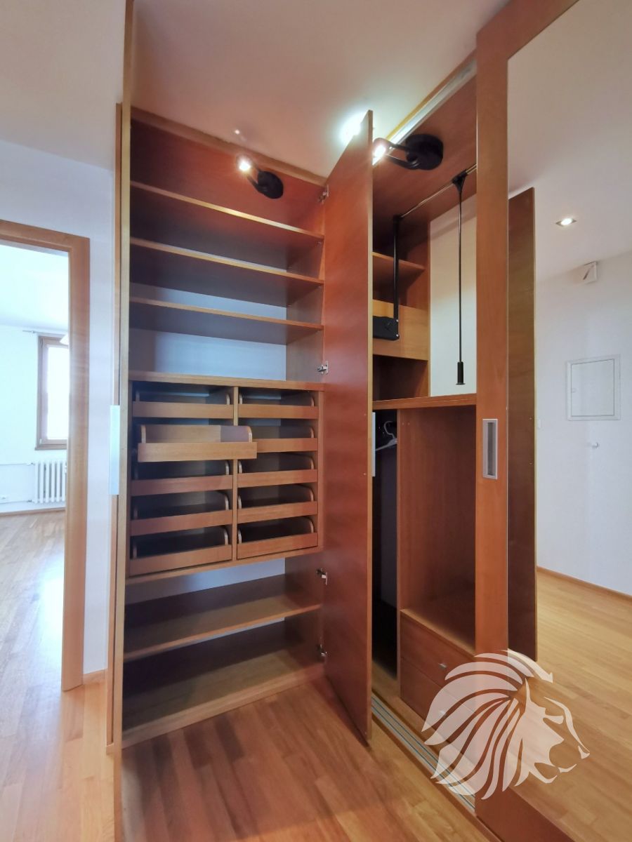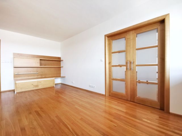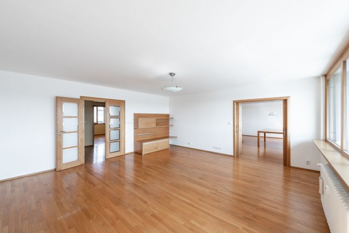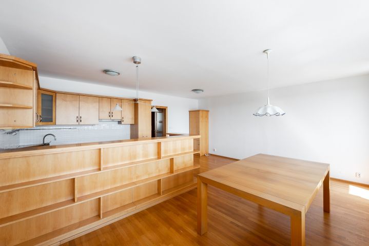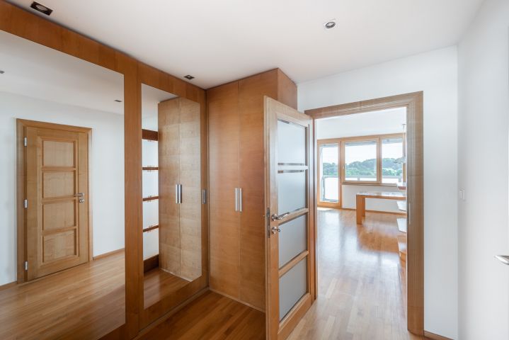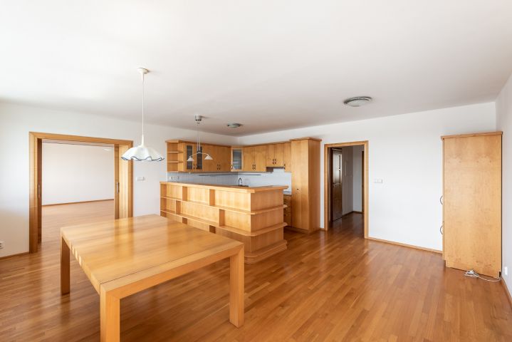 Kuchyně s obývákem propojena dvoukřídlými posuvnými dveřmi do pouzdra zdi tvoří plochu 63 m². Prostor tak lze propojit či oddělit. V celém bytě je použito pravé dřevo světlých tónů, a to na podlahách, šatnách, skříních, nábytku, kuch. lince, obložkách dveří a samotných dveřích. Podlahové topení ve dvou koupelnách. Na jižní straně i venkovní el. žaluzie. Pečicí trouba s výsuvným vozíkem. Dvě koupelny – vana i sprch. kout, dvě přípojky na pračku, bidet, na WC i pisoár.