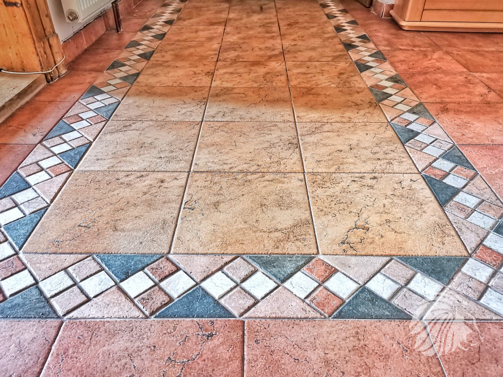 Podlahy dřevěné a dlažba. Zatemňovací závěsy v obývacím pokoji.