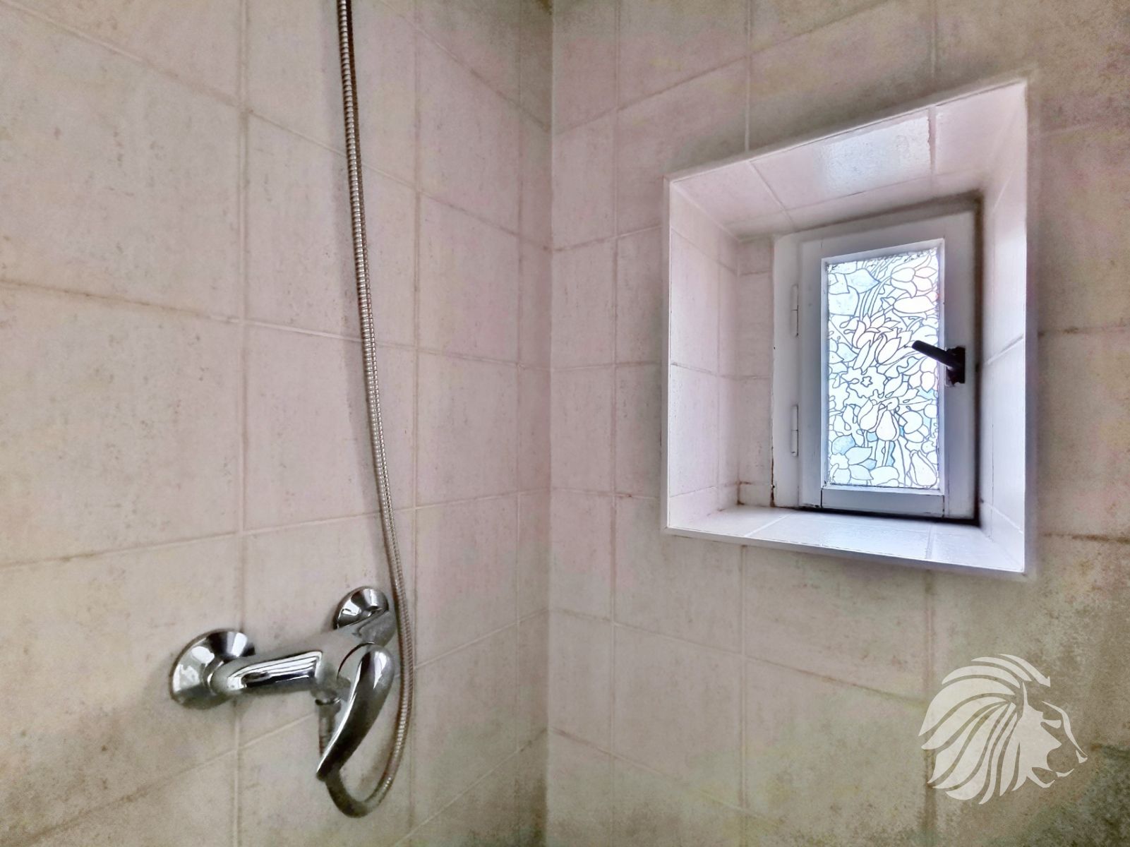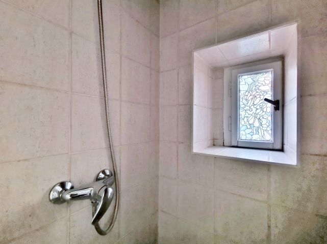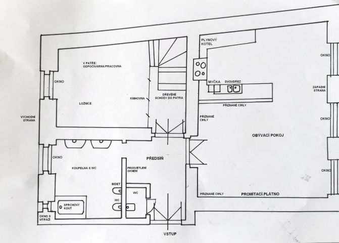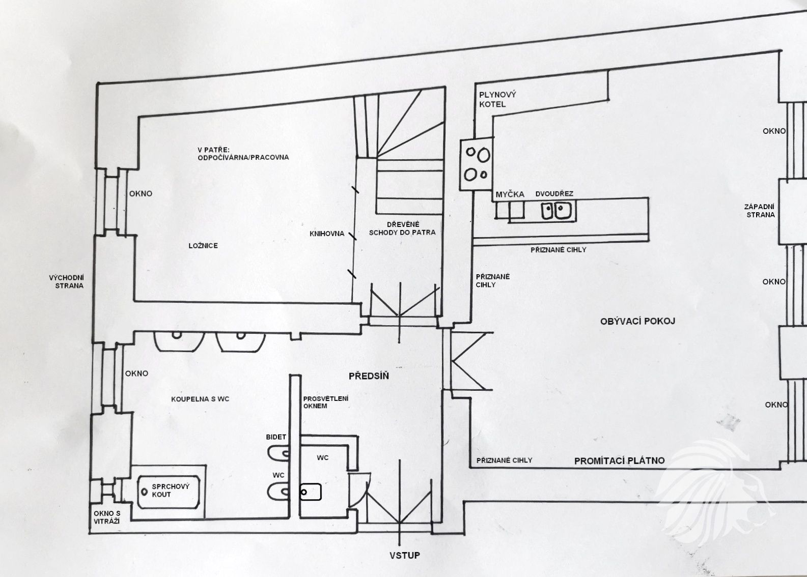 s vitráží, nechybí přípojka na pračku a otopný žebřík.