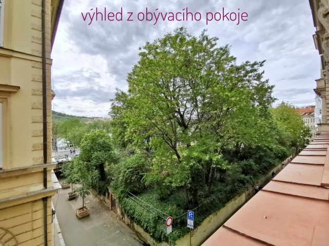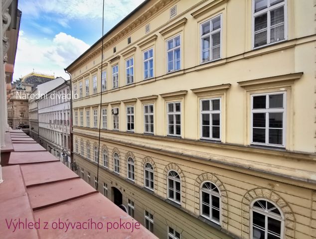 Byt se nachází ve 2. nadzemním podlaží 4 podlažního činžovního domu s výtahem. Okna obývacího pokoje s kuch. koutem směřují na západ s výhledem na Hradčany a do klidné Divadelní ulice. Okna pokoje a koupelny směřují na východ, do tichého uzavřeného vnitrobloku.