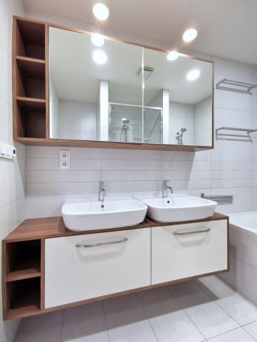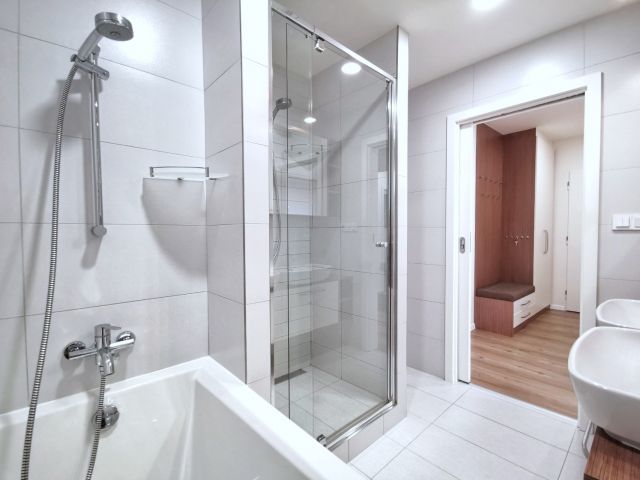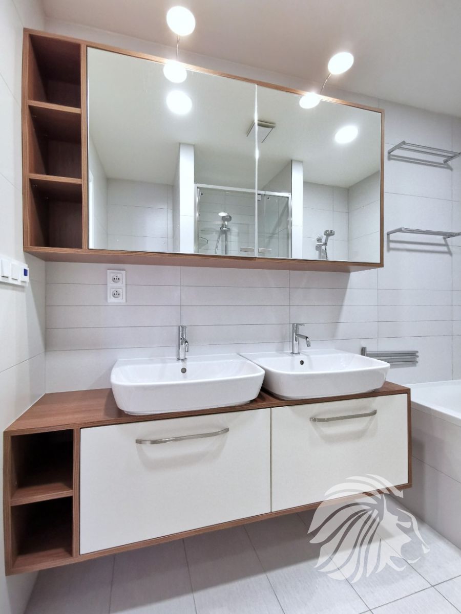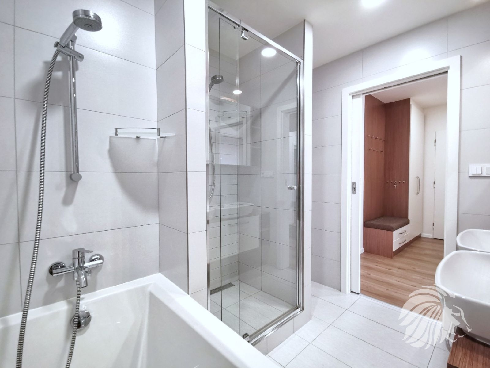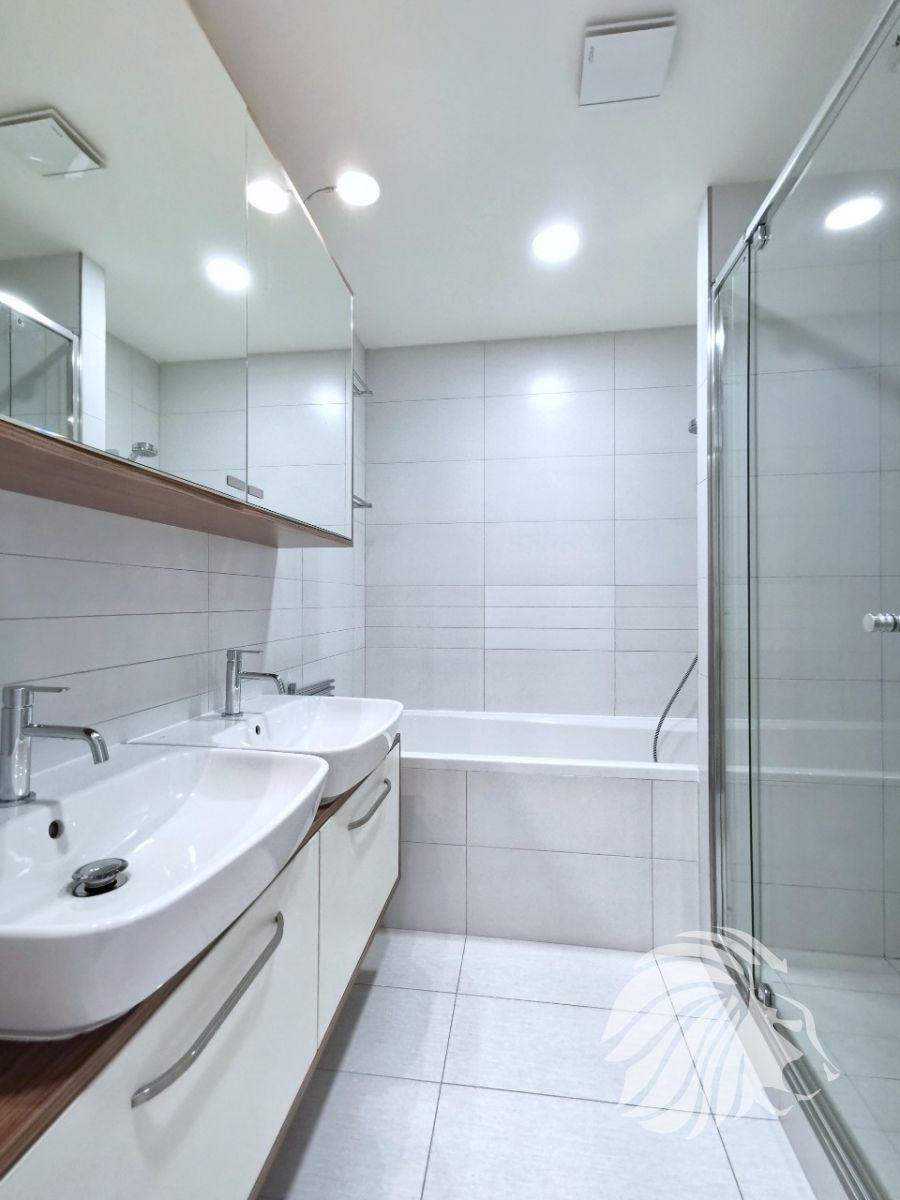 Koupelna: posuvné dveře, 2 umyvadla, vana, sprchový kout, prostor na pračku