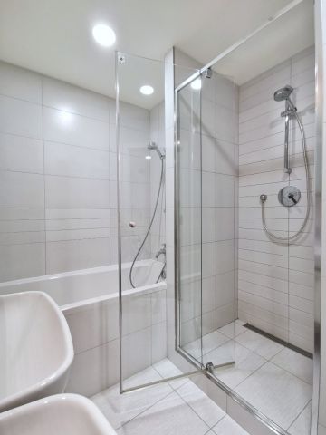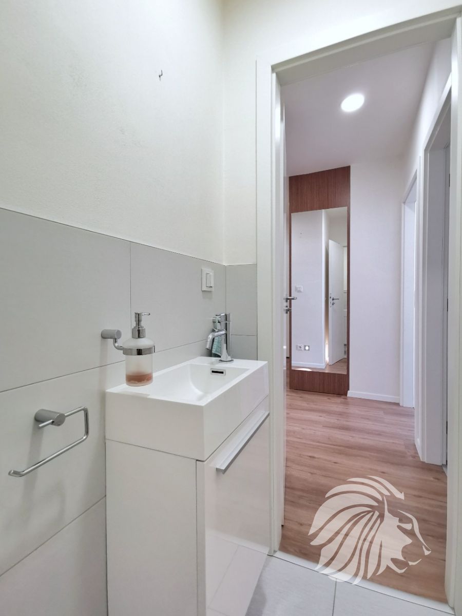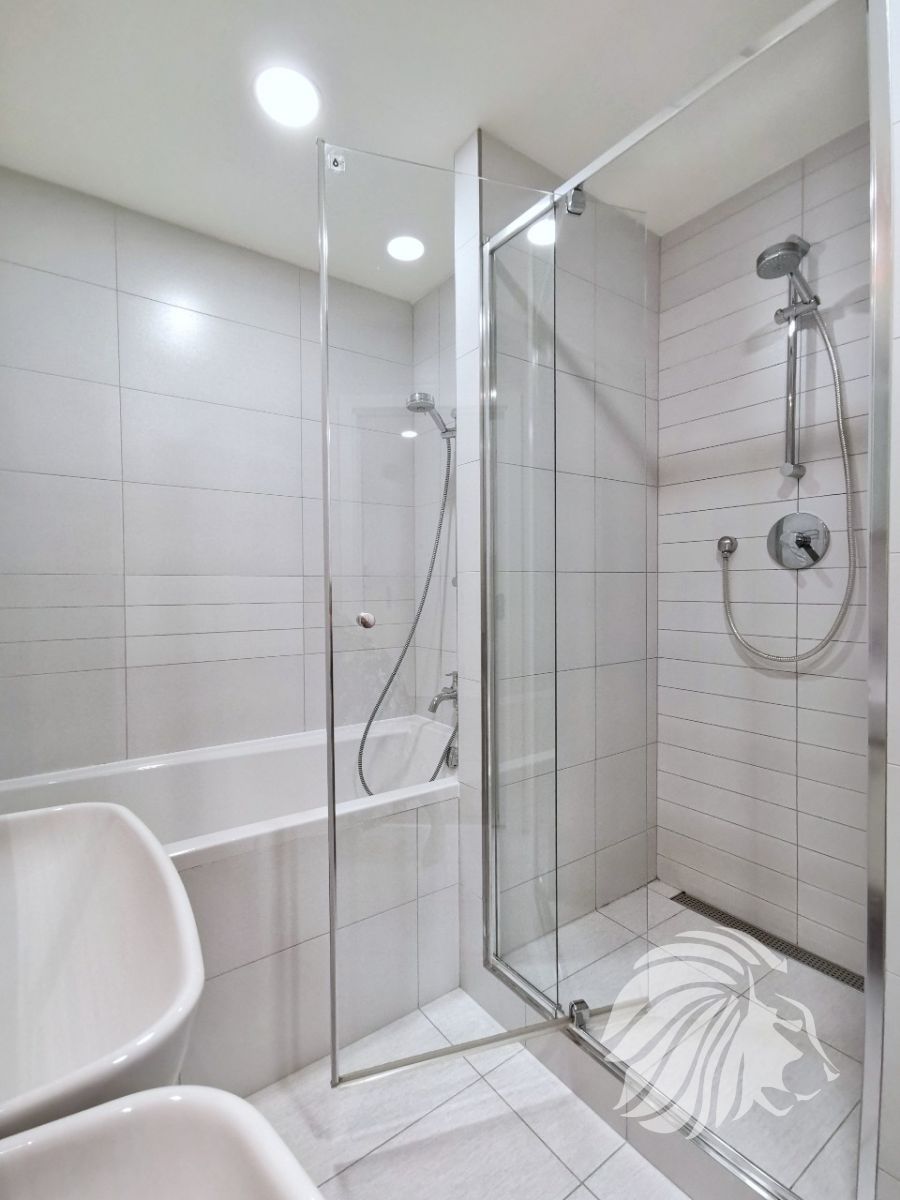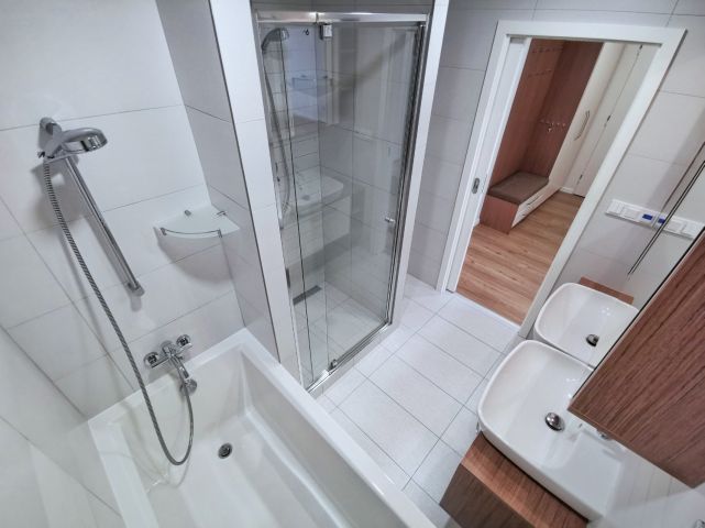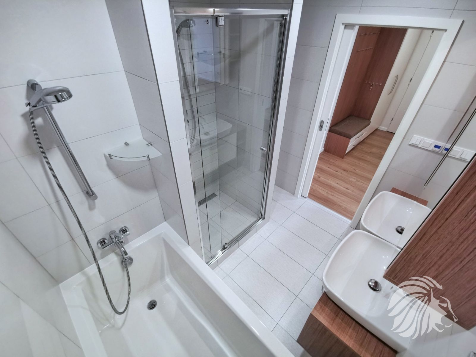 Koupelna: posuvné dveře, 2 umyvadla, vana, sprchový kout, prostor na pračku