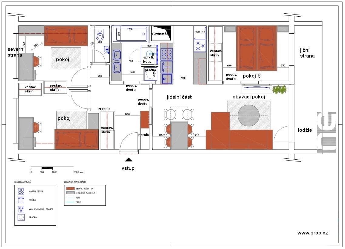 Obývací pokoj: posuvné dveře, poličky – možnost odstranění, husí krk