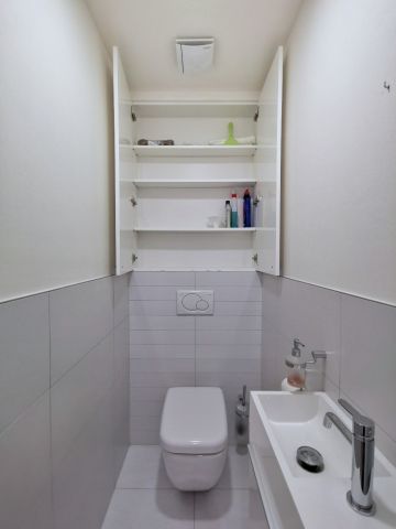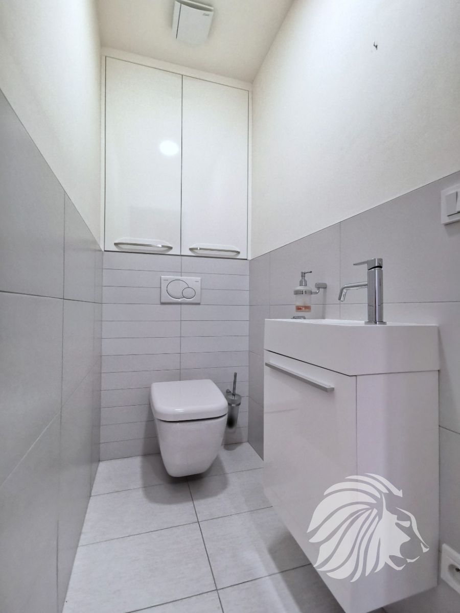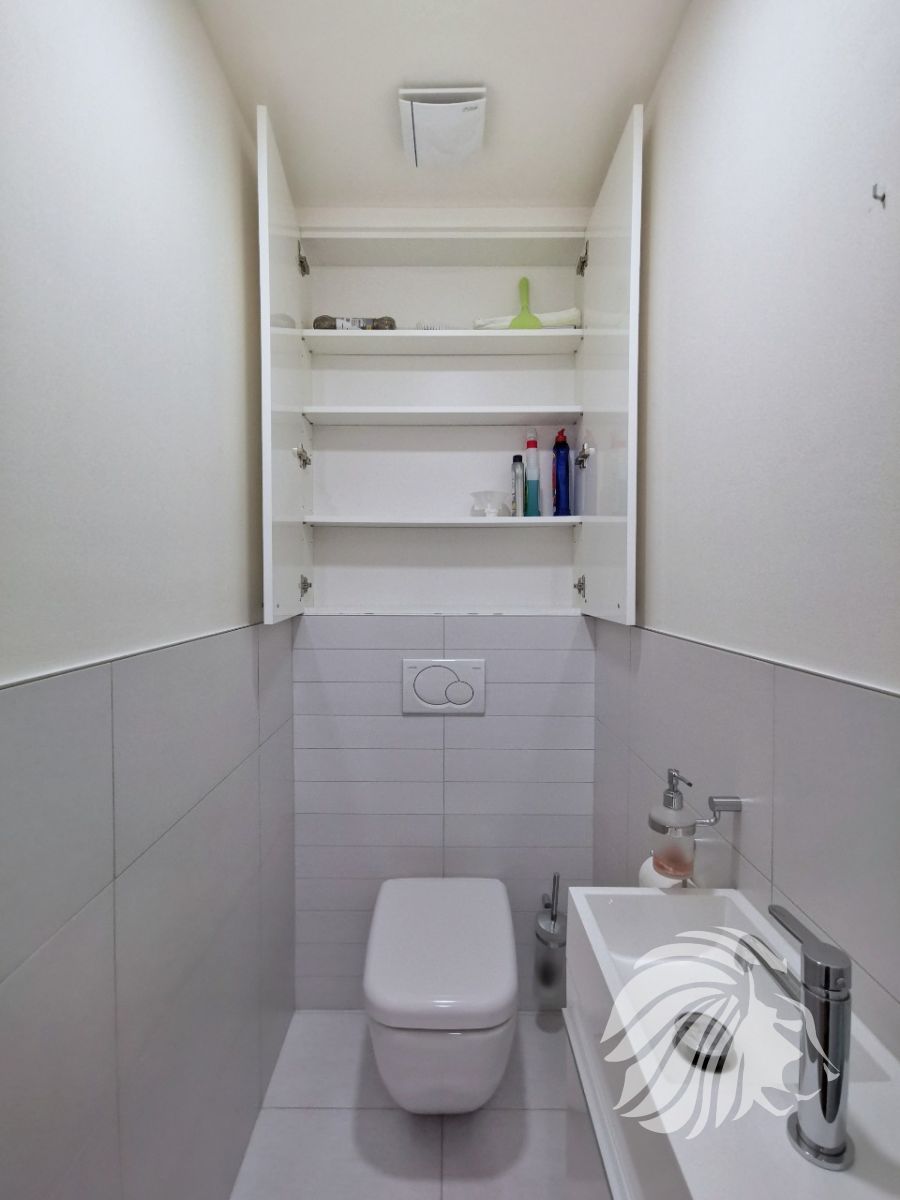 WC: úložný prostor nad WC. Umyvadlo s úložnou skříňkou – praktické
