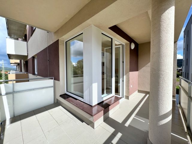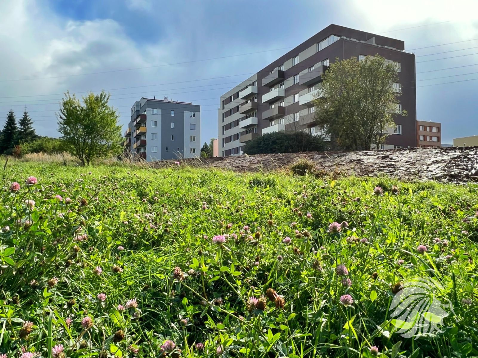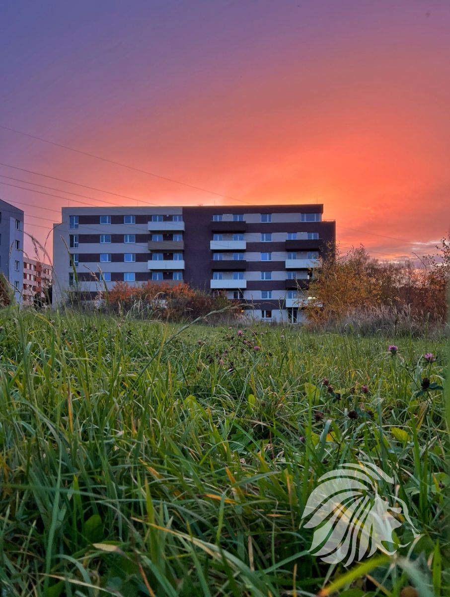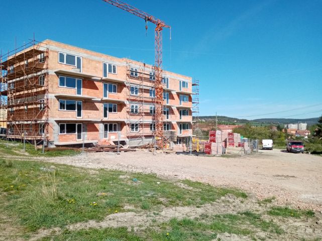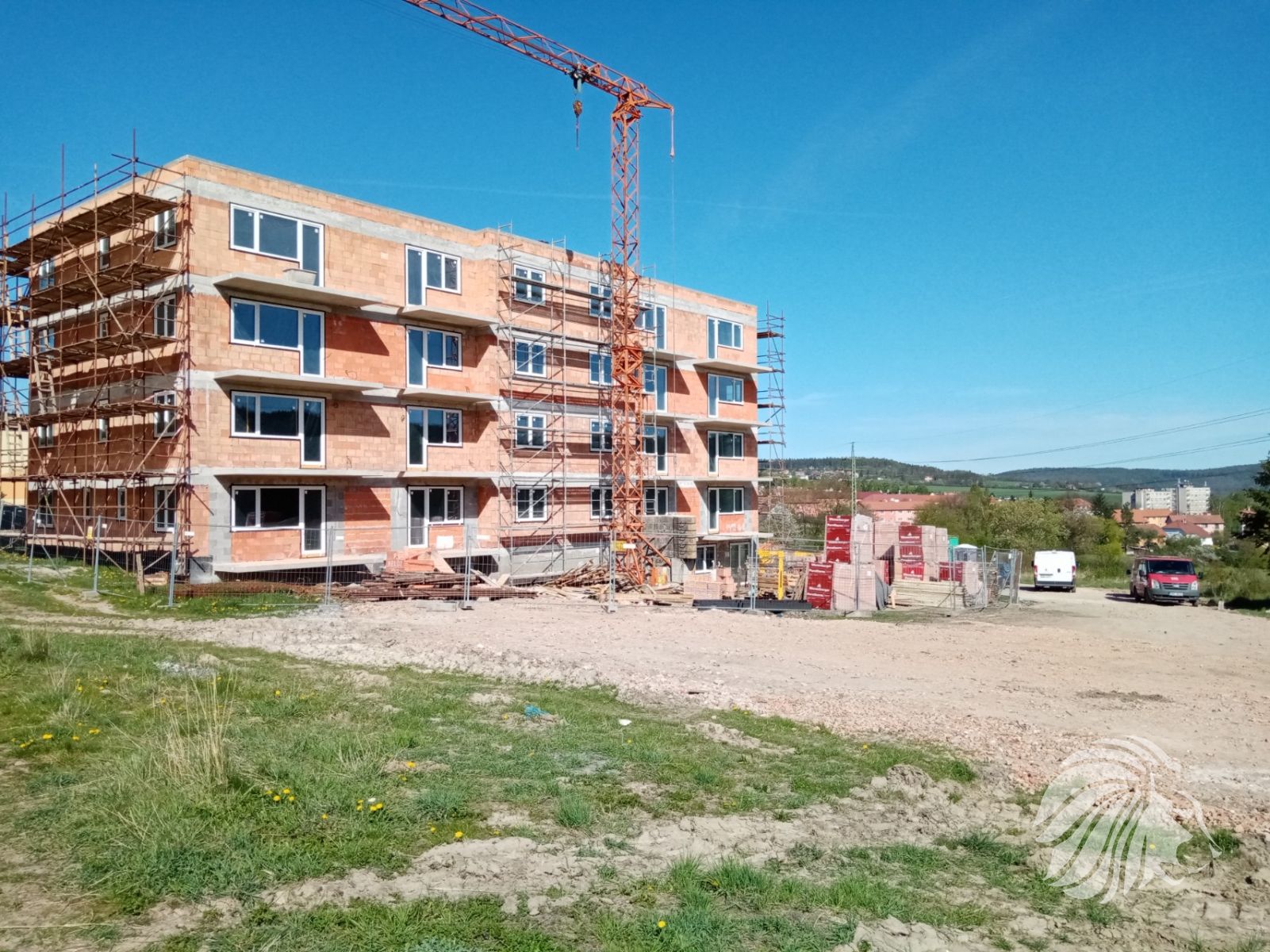 balkon) čerstvě dokončené novostavby bytového domu. Místo je klidné,