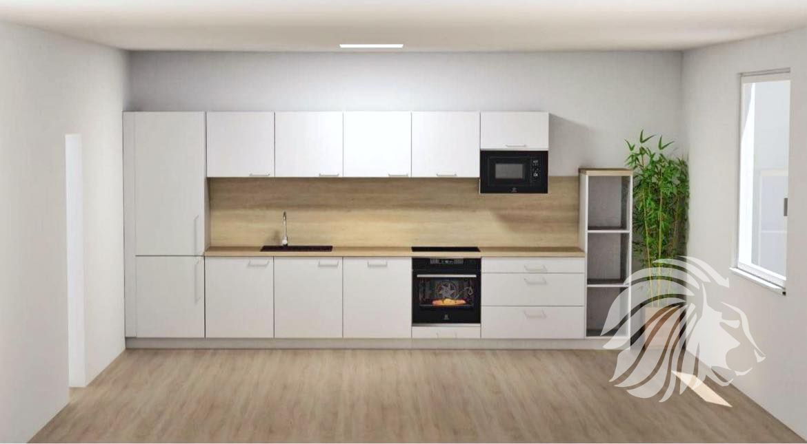 Kuchyňská linka ORESI (o délce 4,4 m) v hodnotě 217 000 Kč nyní ve výrobě (vizualizace ve foto). V dekoru bílý mat, pracovní deska a zádový panel dub ( téměř identické s podlahou a dveřmi). Velkorysý pracovní prostor, komplet spotřebiče zn. BEKO ( elegantní varná deska bez rámu, horkovzdušná trouba, mikrovlnka, myčka 60 cm, digestoř, vestavěná lednice s mrazákem) granitový dřez, kuchyňská oblouková baterie Franke. Vstupní protipožární bezpečnostní dveře. Podlahy pokryty plovoucí podlahou EGGER 7 mm v dekoru světlého dubu. Dlažba a obklady RAKO řady Extra. Vytápění a ohřev vody zajišťuje centrální plynová kotelna v přízemí domu. Samostatný měřič tepla. V koupelně vana, topný plynový žebřík a přípojka na pračku. Okna plastová šesti-komorová trojskla. Vnitřní parapety plastové, venkovní lakovaný pozink. Elektro příprava na kuchyňskou linku. Datové a televizní přípojky v každé obytné místnosti. Elektřina dodávaná společností ČEZ. a.s. Jistič 3×16 A. Podrobnější standardy máme k dispozici.