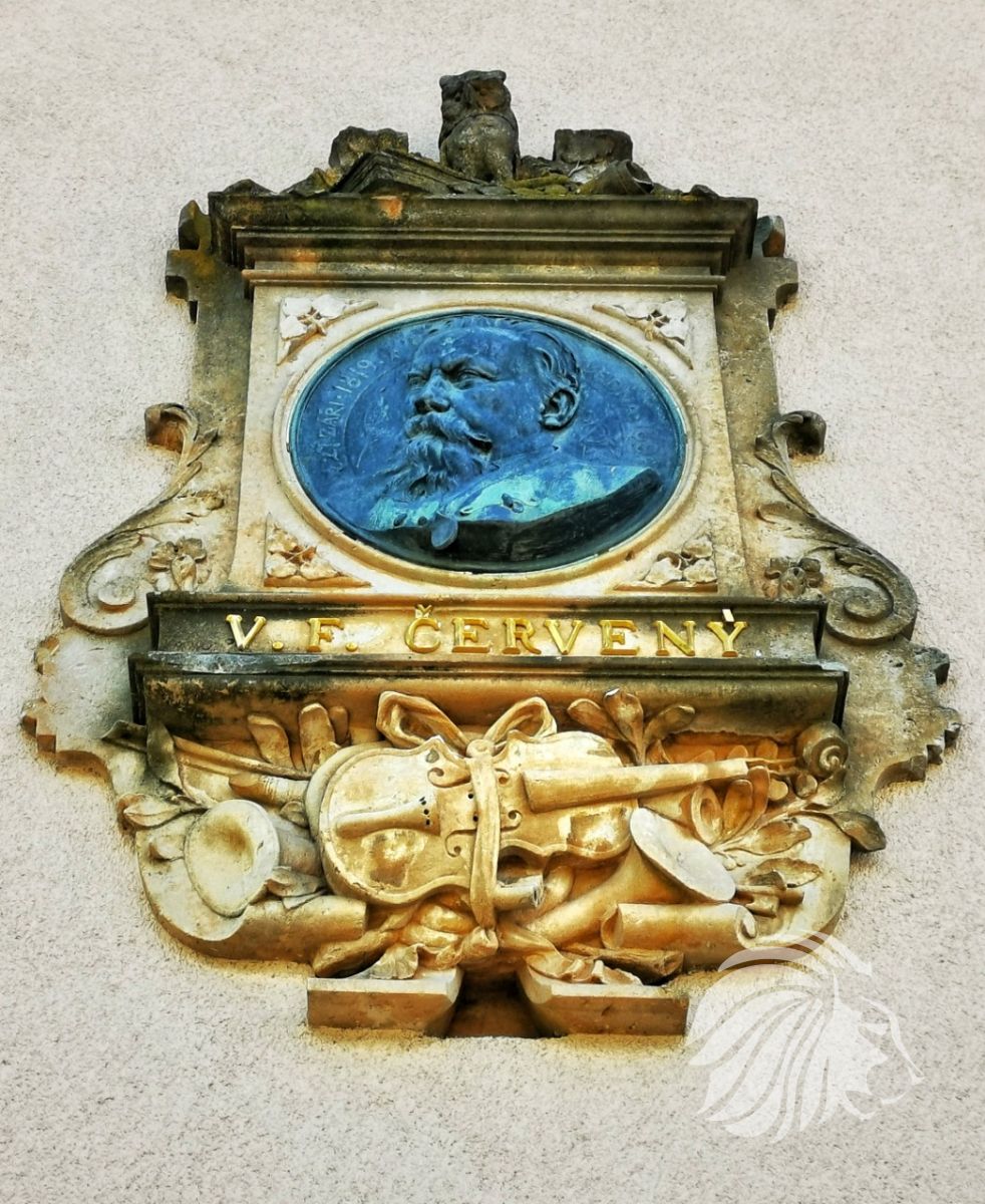 Budovu garáží zdobí pamětní deska s bohatou reliéfní výzdobou. Pod medailonem je zlatým písmem jméno V. F. Červený. Desku vytvořil sochař A. Formánek podle návrhu prof. Kouly. Bronzovou část odlila Maškova slévárna Karlín s použitím makety sochaře Stránského. Václav František Červený byl jeden z nejvýznamnějších českých a evropských výrobců hudebních nástrojů. Specializoval se na dechové instrumenty, zejména žestě.
