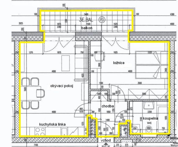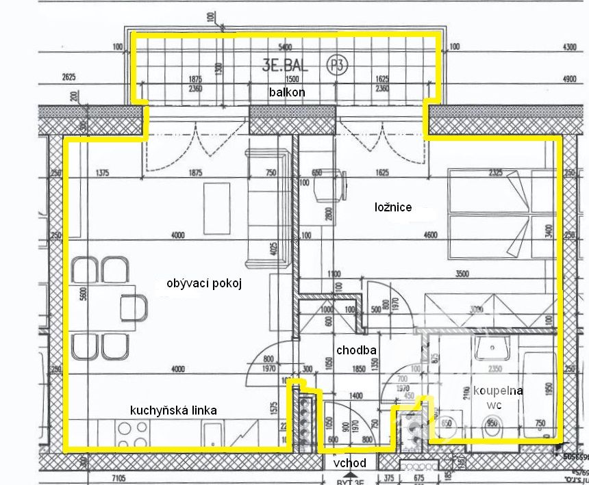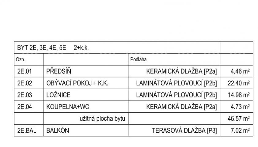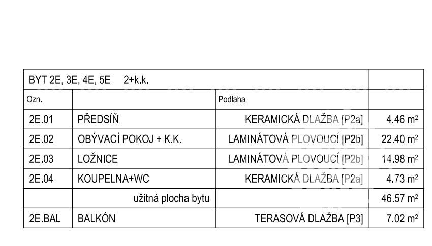 46,57 m² užitná plocha bytu bez příček ) 49,6 m² s příčkami)