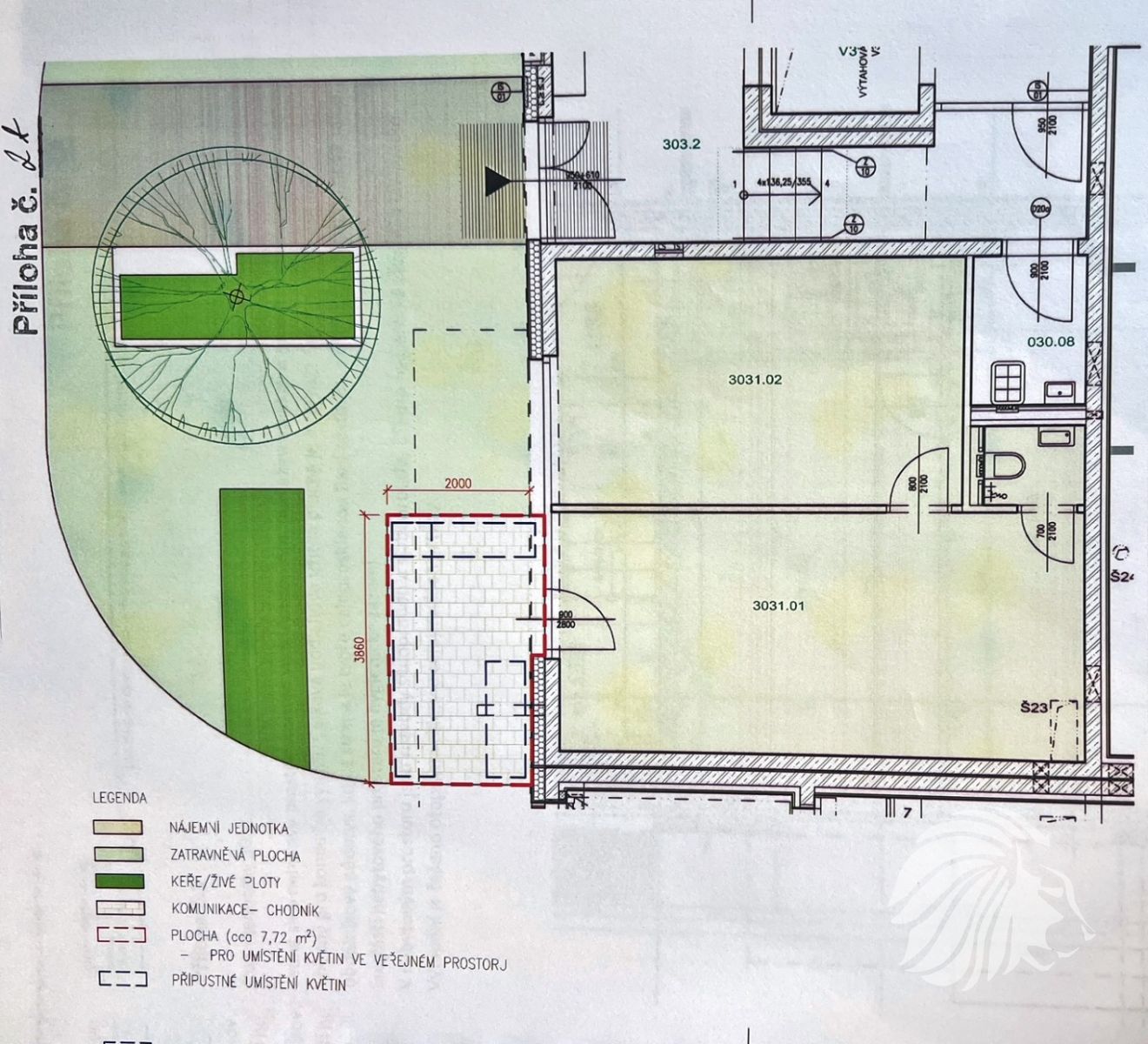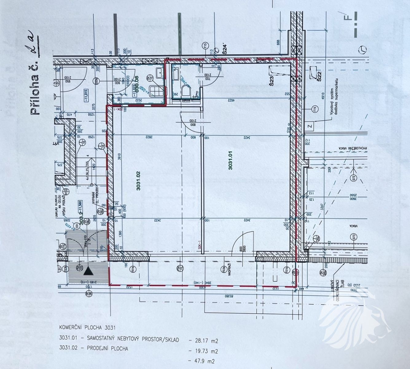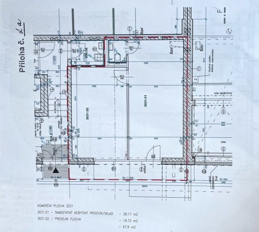 hlavní prodejní místnost se zázemím. Zázemí tvoří vlastní WC s umyvadlem a skladová místnost, která vznikla sádrokartonovým předělem od hlavní části. Přední část se vstupem je prosklená, sloužící i jako výloha. Dle platné nájemní smlouvy je možné využívat i prostor před prostorami v prodejní době(viz plánek).