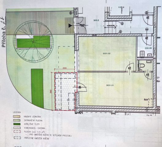Téměř čtvercové prostory kolaudované jako květinářství v r. 2021 o celkové výměře 47,9 m² se nacházejí na úrovní přízemí domu (objektu A), v levé části slepé ulice U Viktorie v Praze 3 Žižkov. (Plánek neodpovídá skutečnosti…předěl dvou místností je odstraněn).