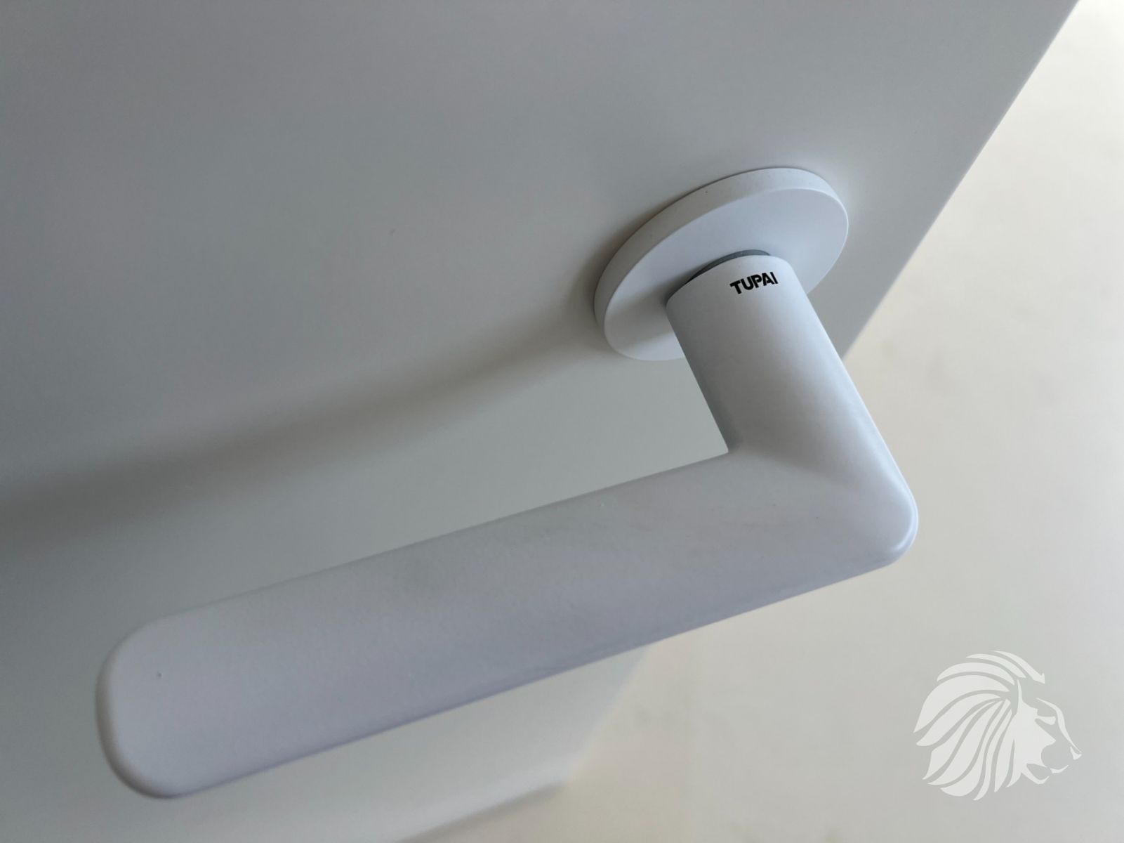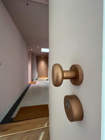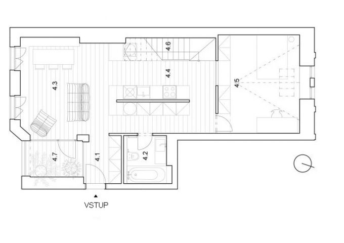 Jedinečnost bytu tkví v použitých materiálech s nádechem dánského designu. Také v zapuštěné lodžií u obývacího pokoje, ve velkoformátových ateliérových oknech v JV části a prakticky vyřešeným interiérovým prosklením, které dělí dětský pokoj od kuchyně. Pozornost strhne i okno nad sprchovým koutem.