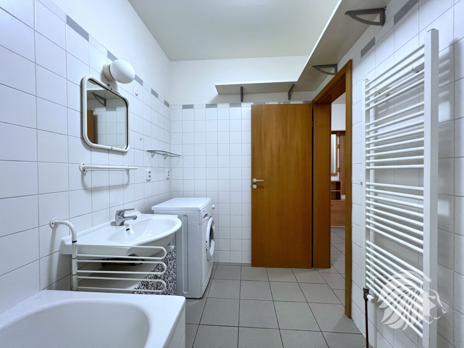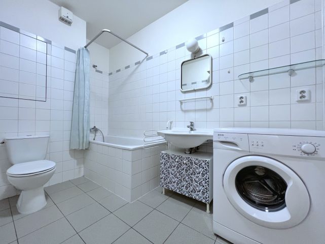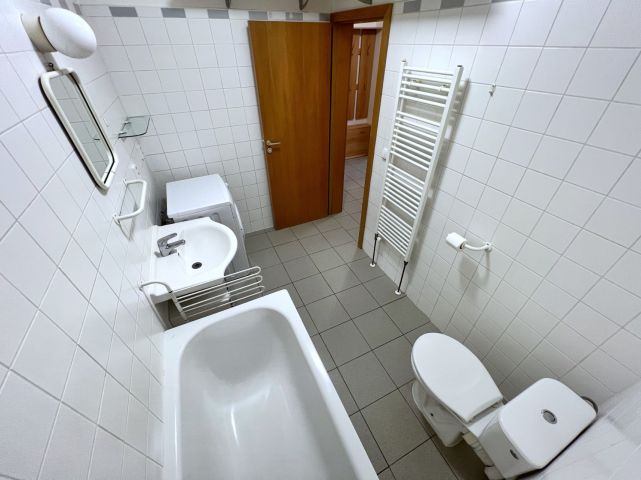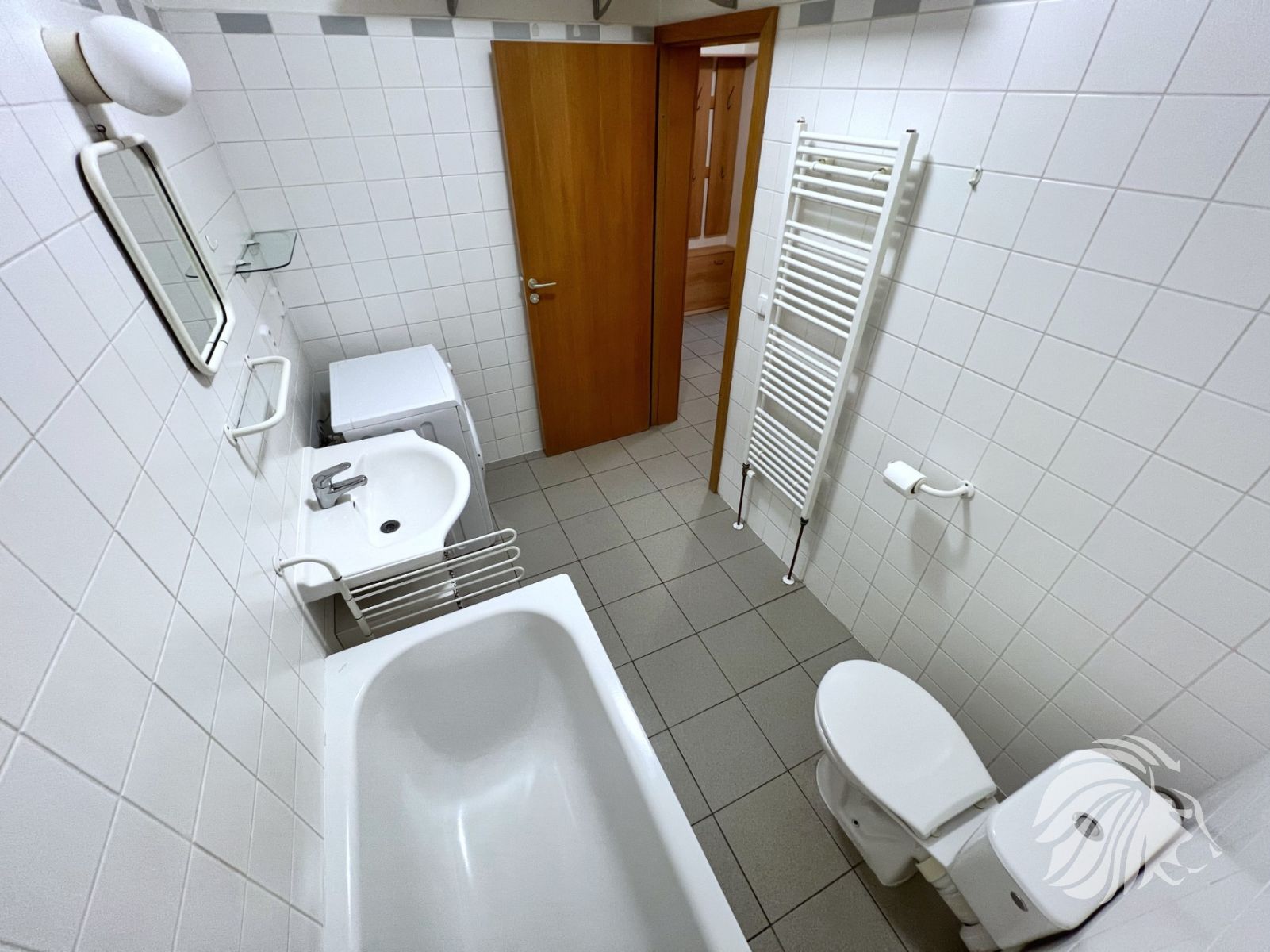 Chodba: vestavěná skříň, botník a věšák se zrcadlem, vysavač. Koupelna s WC: nové umyvadlo, umyvadlová skříňka, pračka.