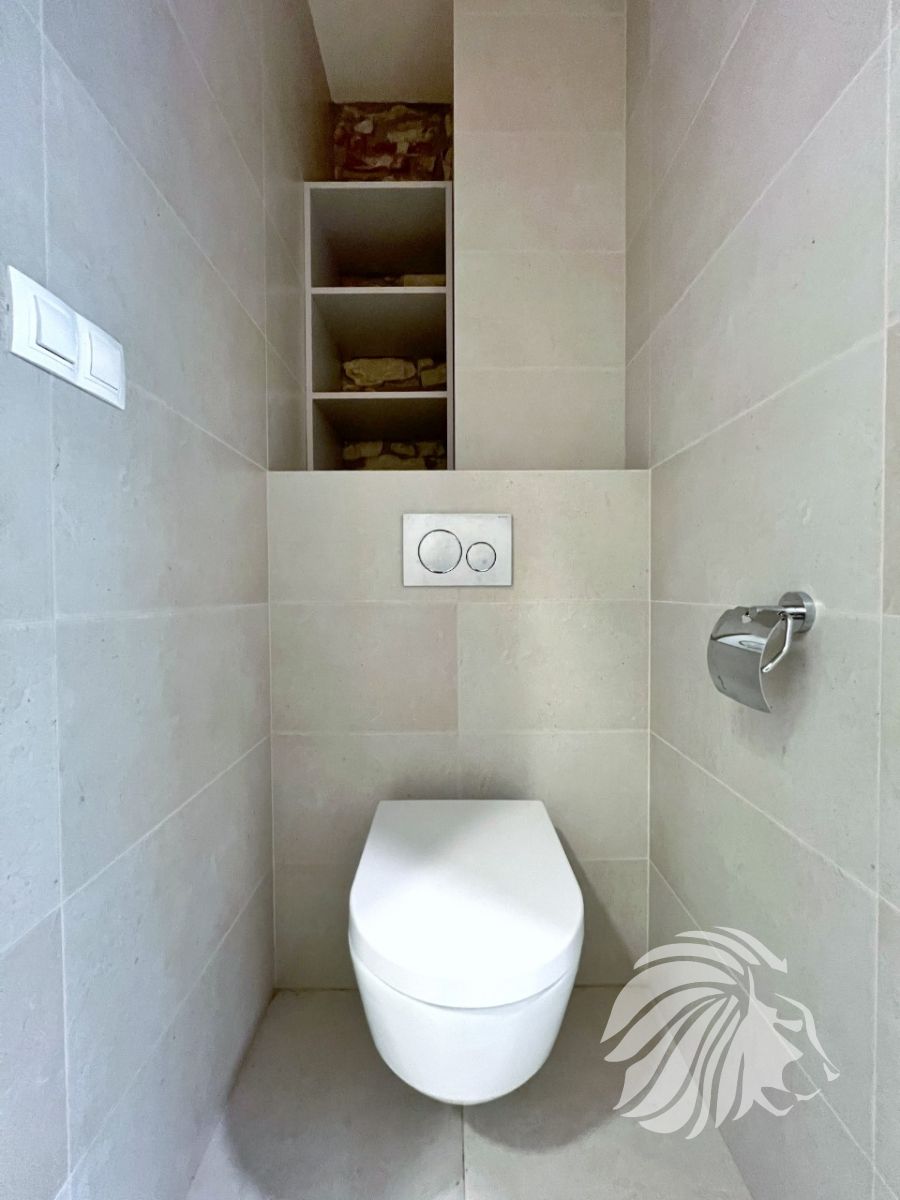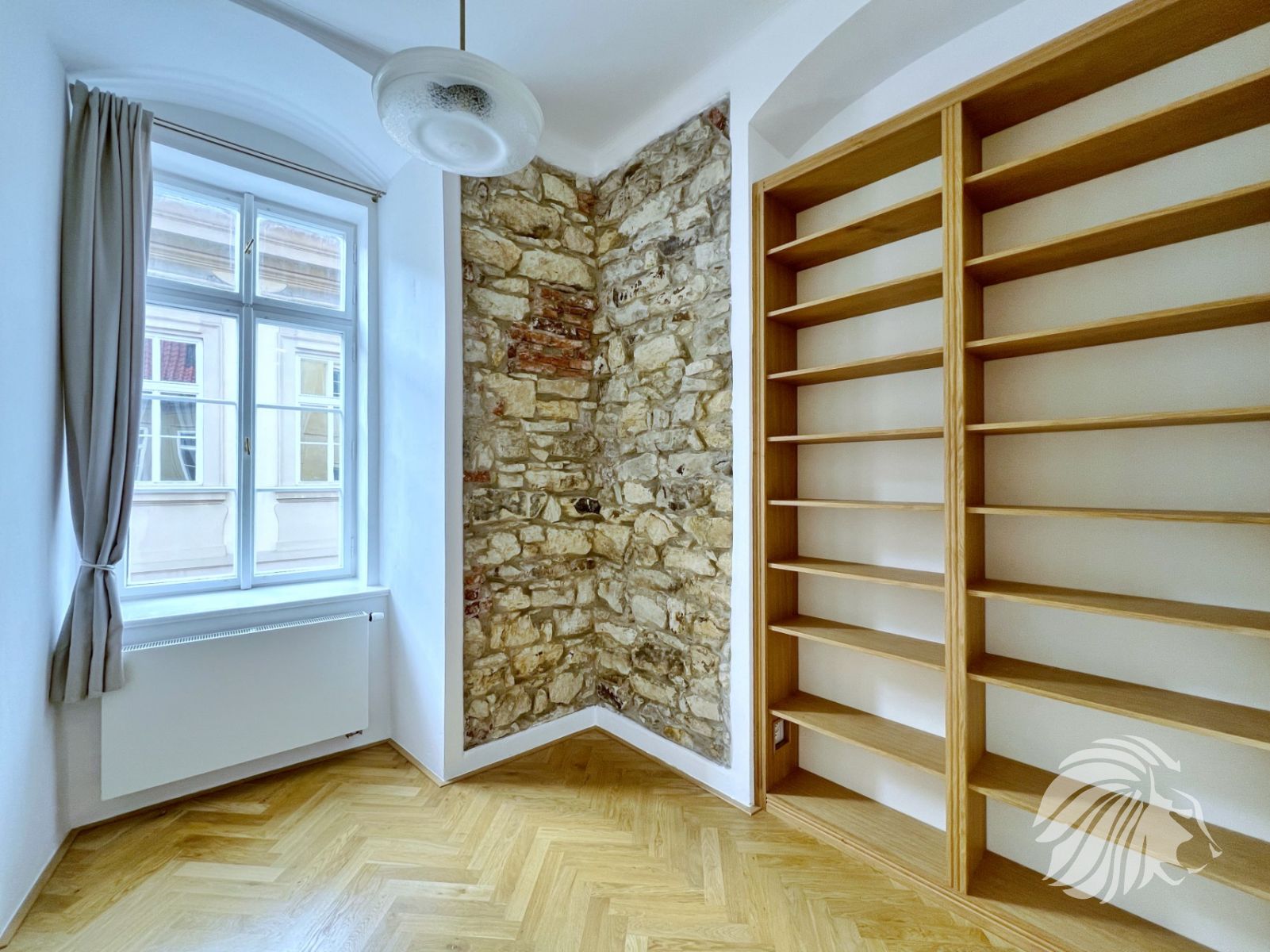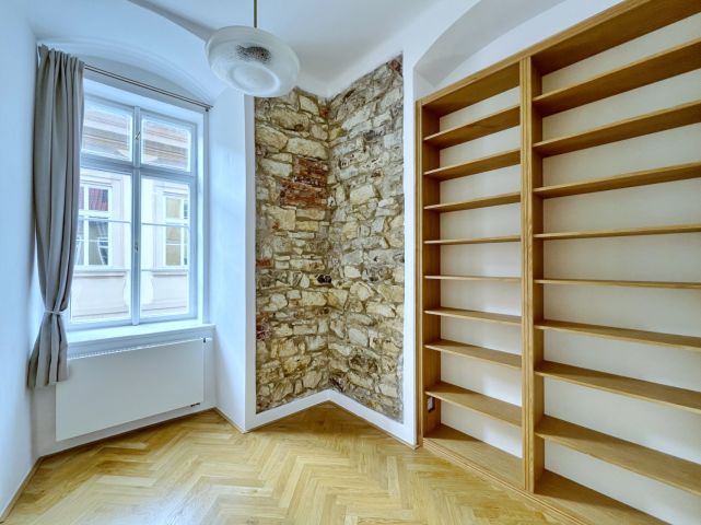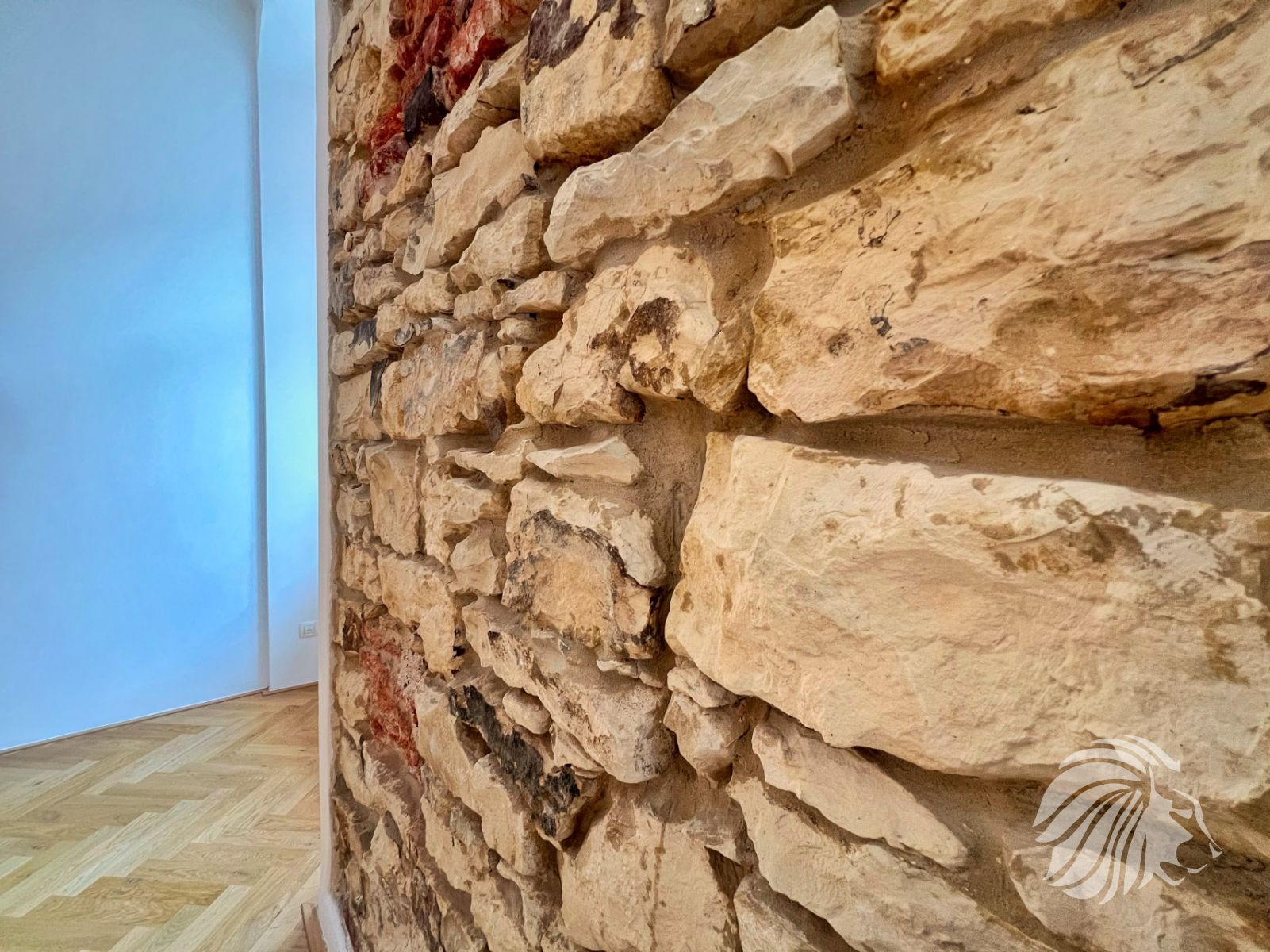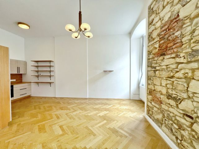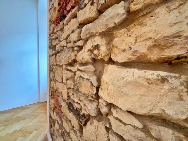 Byt je po generální a velmi zdařilé rekonstrukci s důrazem kladeným na přírodní materiály (dřevo) a spoustu úložného prostoru. V bytě dominují zdi s přiznaným kamenným zdivem v obou místnostech i na WC.
